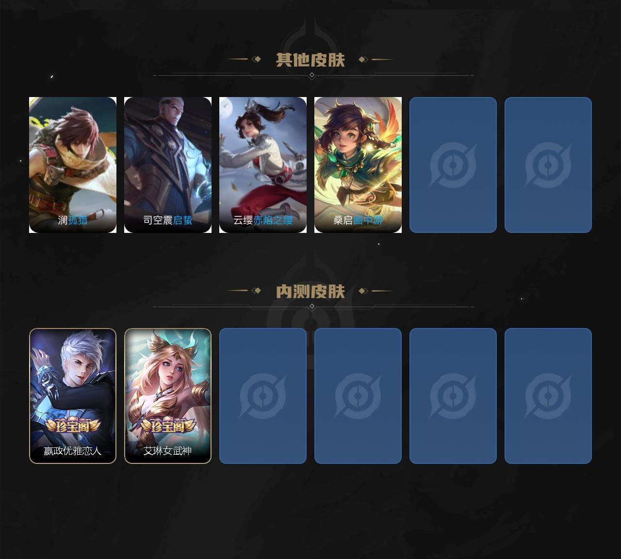 【年限皮肤】:百里玄策白虎志,王昭君凤凰于飞,李白凤求凰,杨戬永曜之星,后羿辉光之辰,伽罗太华,甄姬幽恒,韩信飞衡,黄忠烈魂