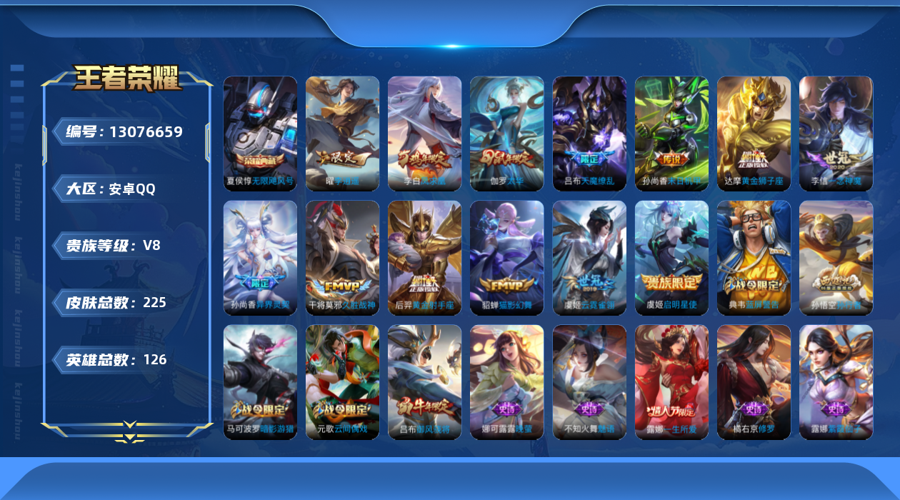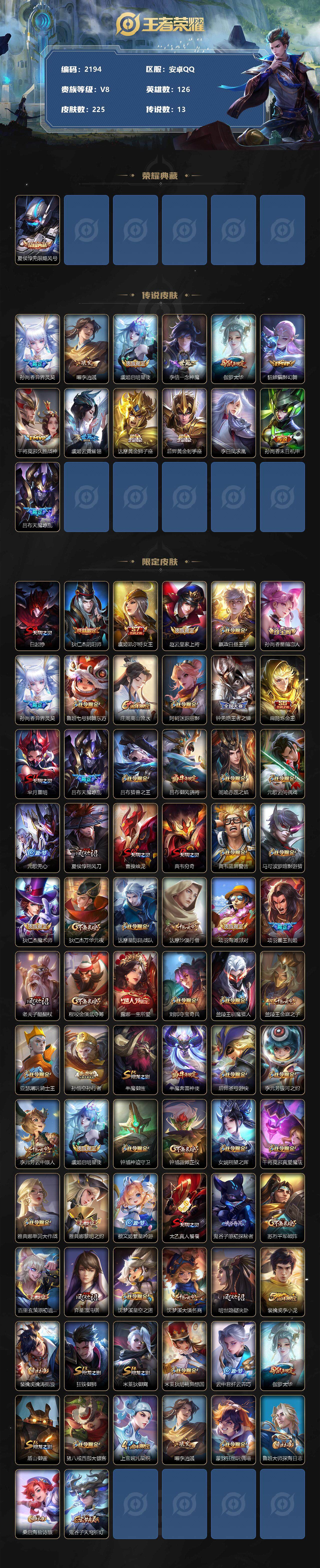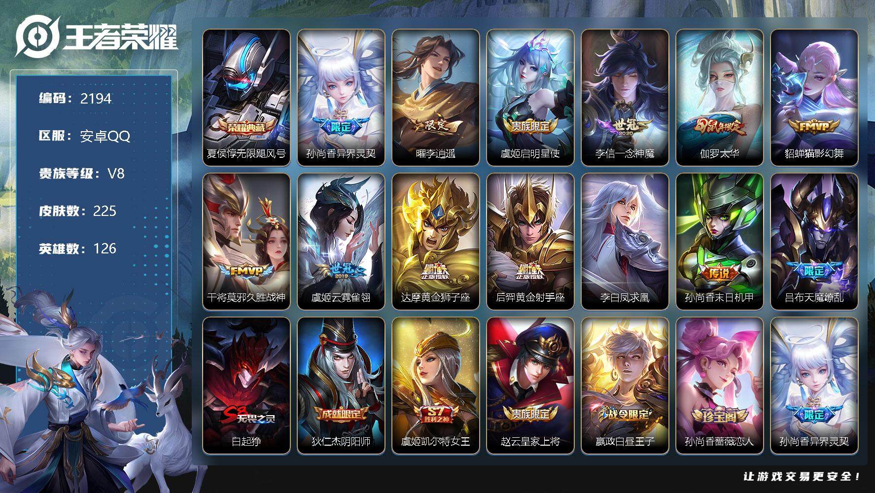 [13076659]安卓Q-V8-尊贵铂金III段位-126英雄-225皮肤-1典藏-0珍品无双-0无双-0珍品传说-13传说-58史诗