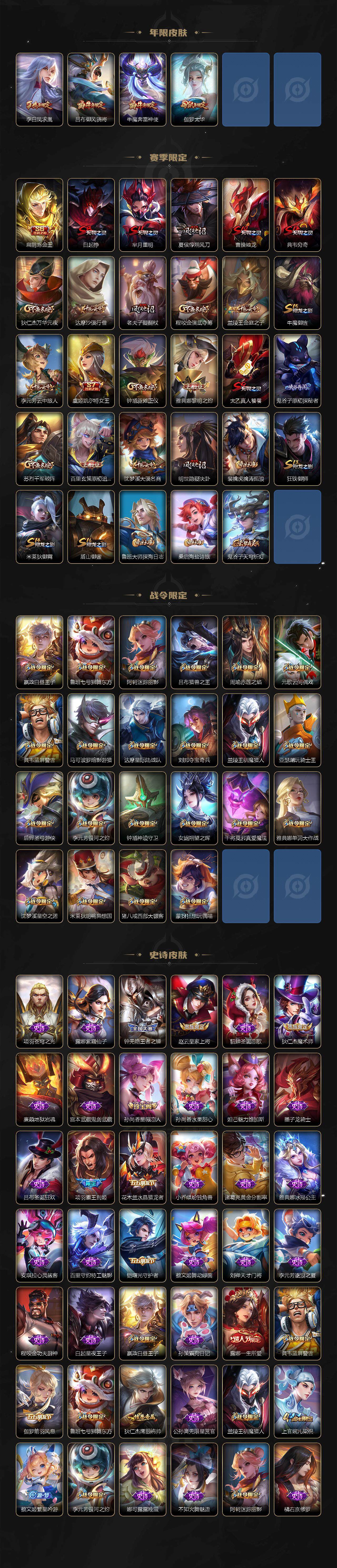 【赛季限定】:扁鹊炼金王,白起狰,芈月重明,夏侯惇朔风刀,曹操烛龙,典韦穷奇,狄仁杰万华元夜,达摩沙漠行僧,老夫子醍醐杖,程咬金演武夺筹,兰陵王金庭之子,牛魔御旌,李元芳云中旅人,虞姬凯尔特女王,钟馗驱傩正仪,雅典娜黎明之约,太乙真人饕餮,鬼谷子原初探秘者,苏烈千军破阵,百里玄策原初追逐者,弈星混沌棋,沈梦溪大漠名商,明世隐疑决卦,裴擒虎擒涛扼浪,狂铁御狮,米莱狄御霄,盾山御銮,鲁班大师探海日志,桑启海盐诗旅,鬼谷子天穹祈灯