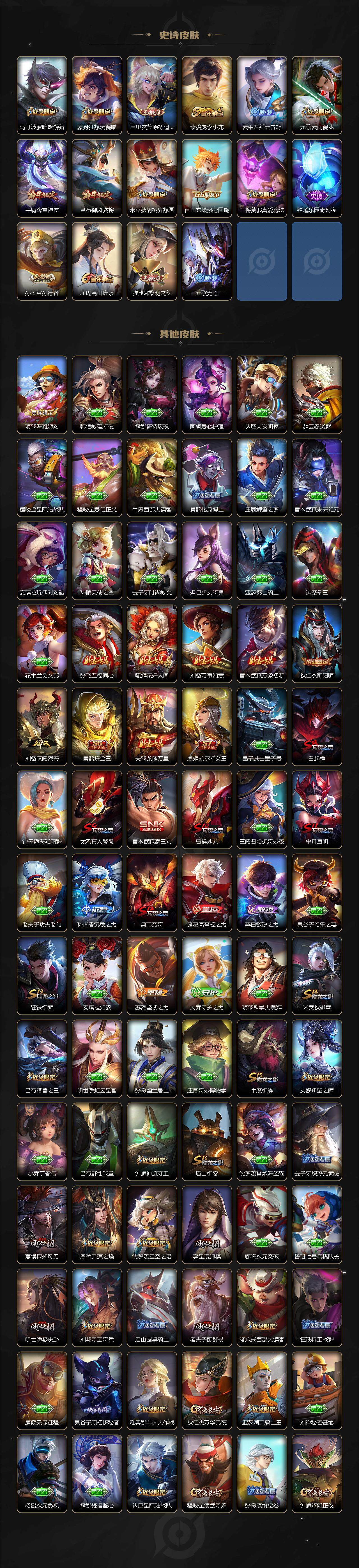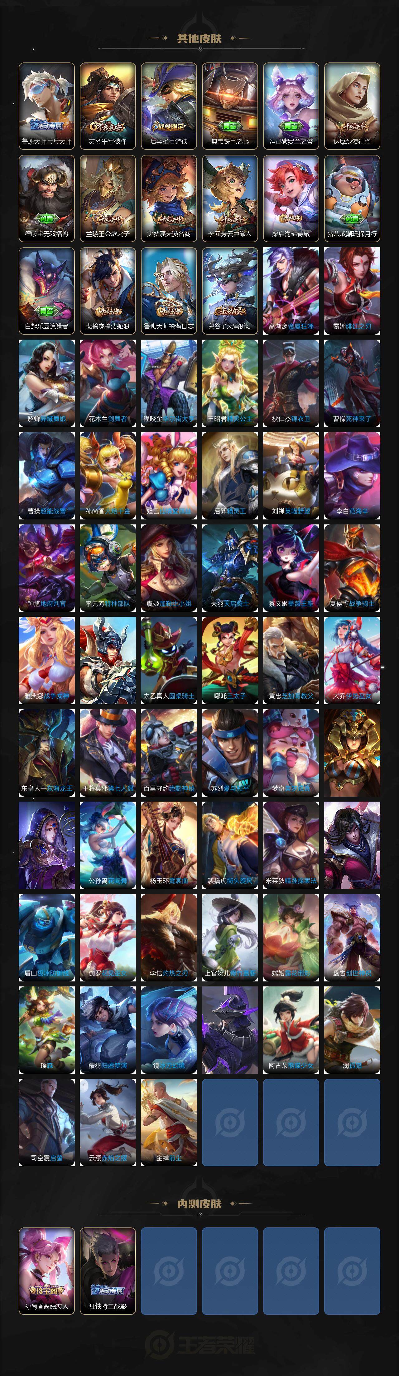 【限定皮肤】:白起狰,狄仁杰阴阳师,虞姬凯尔特女王,赵云皇家上将,嬴政白昼王子,孙尚香蔷薇恋人,孙尚香异界灵契,鲁班七号狮舞东方,庄周高山流水,阿轲迷踪丽影,钟无艳王者之锤,扁鹊炼金王,芈月重明,吕布天魔缭乱,吕布猎兽之王,吕布御风骁将,周瑜赤莲之焰,元歌云间偶戏,元歌无心,夏侯惇朔风刀,曹操烛龙,典韦穷奇,典韦蓝屏警告,马可波罗暗影游猎,狄仁杰魔术师,狄仁杰万华元夜,达摩星际陆战队,达摩沙漠行僧,项羽海滩派对,项羽霸王别姬,老夫子醍醐杖,程咬金演武夺筹,露娜一生所爱,刘邦夺宝奇兵,兰陵王驯魔猎人,兰陵王金庭之子,亚瑟潮玩骑士王,孙悟空孙行者,牛魔御旌,牛魔奔雷神使,后羿圣弓游侠,李元芳银河之约,李元芳云中旅人,虞姬启明星使,钟馗神迹守卫,钟馗驱傩正仪,女娲朔望之晖,干将莫邪真爱魔法,雅典娜单词大作战,雅典娜黎明之约,蔡文姬繁星吟游,太乙真人饕餮,鬼谷子原初探秘者,苏烈千军破阵,百里玄策原初追逐者,弈星混沌棋,沈梦溪星空之诺,沈梦溪大漠名商,明世隐疑决卦,裴擒虎李小龙,裴擒虎擒涛扼浪,狂铁御狮,米莱狄御霄,米莱狄胡桃异想国,云中君纤云弄巧,伽罗太华,盾山御銮,猪八戒西部大镖客,上官婉儿梁祝,曜李逍遥 ,蒙犽狂想玩偶喵,鲁班大师探海日志,桑启海盐诗旅,鬼谷子天穹祈灯