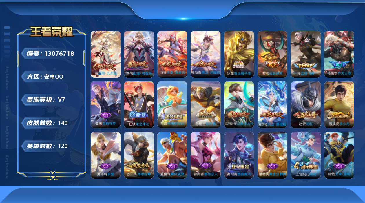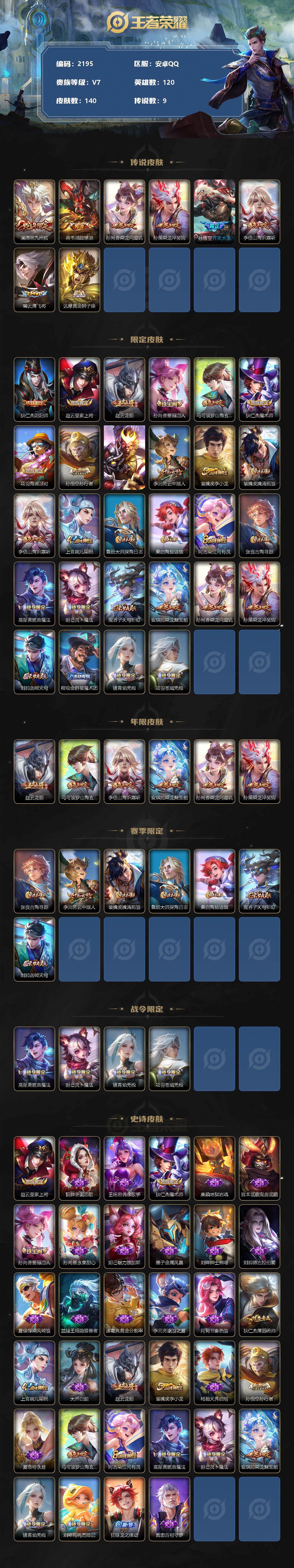 [13076718]安卓Q-V7-至尊星耀IV段位-120英雄-140皮肤-0典藏-0珍品无双-0无双-0珍品传说-9传说-34史诗