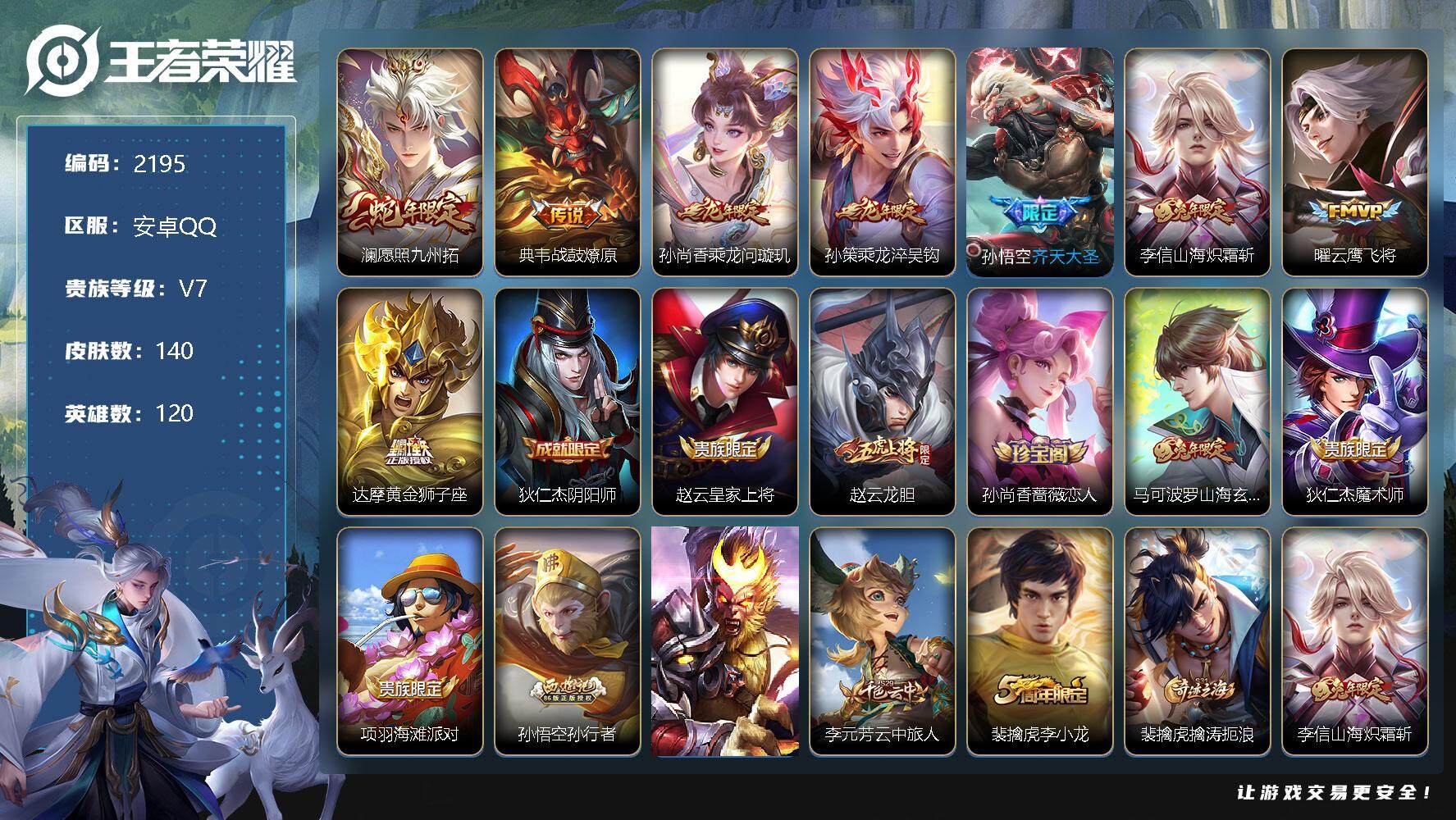 [13076718]安卓Q-V7-至尊星耀IV段位-120英雄-140皮肤-0典藏-0珍品无双-0无双-0珍品传说-9传说-34史诗 【传说皮肤】:后羿神树通天,澜愿照九州拓,典韦战鼓燎原,孙尚香乘龙问璇玑,孙策乘龙淬吴钩,孙悟空齐天大圣,李信山海炽霜斩,曜云鹰飞将,达摩黄金狮子座 【限定皮肤】:狄仁杰阴阳师,赵云皇家上将,赵云龙胆,孙尚香蔷薇恋人,马可波罗山海玄木吟,狄仁杰魔术师,项羽海滩派对,孙悟空孙行者,孙悟空齐天大圣,李元芳云中旅人,裴擒虎李小龙,裴擒虎擒涛扼浪,李信山海炽霜斩,上官婉儿梁祝,鲁班大师探海日志,桑启海盐诗旅,阿古朵江河有灵,张良古海寻踪,高渐离燃音魔法,妲己灵卜魔法,鬼谷子天穹祈灯,安琪拉乘龙聚宝船,孙尚香乘龙问璇玑,孙策乘龙淬吴钩,刘邦剑破天穹,程咬金群星魔术团,镜青焰无极,项羽苍威无极 【年限皮肤】:赵云龙胆,马可波罗山海玄木吟,李信山海炽霜斩,安琪拉乘龙聚宝船,孙尚香乘龙问璇玑,孙策乘龙淬吴钩 【赛季限定】:张良古海寻踪,李元芳云中旅人,裴擒虎擒涛扼浪,鲁班大师探海日志,桑启海盐诗旅,鬼谷子天穹祈灯,刘邦剑破天穹 【战令限定】:高渐离燃音魔法,妲己灵卜魔法,镜青焰无极,项羽苍威无极 【史诗皮肤】:赵云皇家上将,貂蝉圣诞恋歌,王昭君偶像歌手,狄仁杰魔术师,廉颇地狱岩魂,宫本武藏鬼剑武藏,孙尚香蔷薇恋人,孙尚香水果甜心,妲己魅力维加斯,墨子金属风暴,刘禅绅士熊喵,刘邦德古拉伯爵,夏侯惇乘风破浪,兰陵王暗隐猎兽者,诸葛亮黄金分割率,李元芳逐浪之夏,阿轲节奏热浪,狄仁杰鹰眼统帅,上官婉儿梁祝,大乔白蛇,赵云龙胆,裴擒虎李小龙,杨戬天秀启明,孙悟空孙行者,夏洛特永昼,马可波罗山海玄木吟,阿古朵江河有灵,妲己灵卜魔法,高渐离燃音魔法,安琪拉乘龙聚宝船,镜青焰无极,刘禅鸭鸭历险记,狂铁龙之律动,黄忠百相守梦 【其他皮肤】:项羽海滩派对,韩信教廷特使,韩信街头霸王,露娜哥特玫瑰,赵云白执事,赵云忍炎影,芈月红桃皇后,白起白色死神,宫本武藏未来纪元,孙膑天使之翼,典韦黄金武士,亚瑟死亡骑士,达摩拳王,刘备万事如意,后羿阿尔法小队,狄仁杰阴阳师,关羽龙腾万里,狂铁命运角斗场,诸葛亮掌控之力,沈梦溪鲨炮海盗猫,盾山圆桌骑士,狂铁特工战影,刘禅秘密基地,露娜瓷语鉴心,程咬金无双福将,李元芳云中旅人,桑启海盐诗旅,猪八戒潮玩探月行,牛魔牛运亨通,白起乐园追猎者,裴擒虎擒涛扼浪,莱