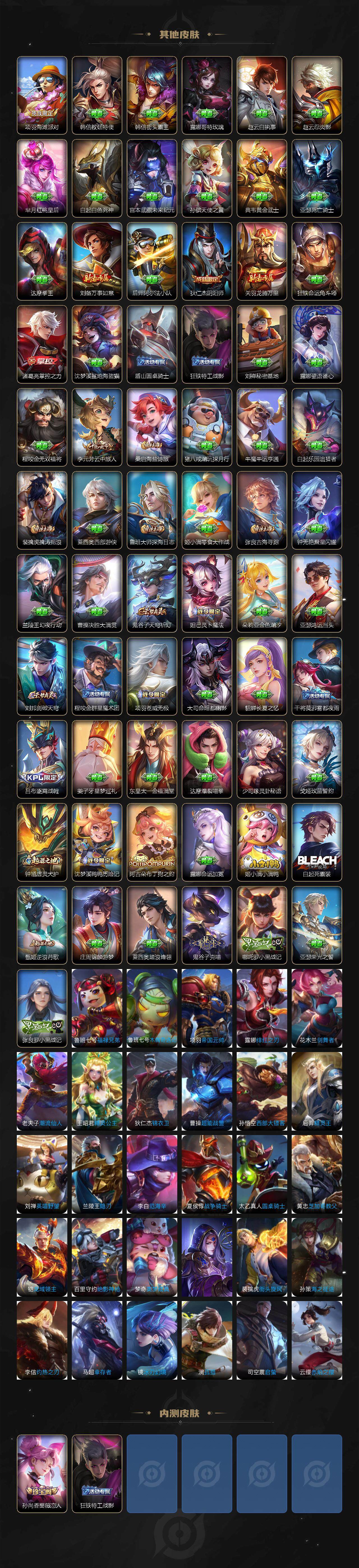 【其他皮肤】:项羽海滩派对,韩信教廷特使,韩信街头霸王,露娜哥特玫瑰,赵云白执事,赵云忍炎影,芈月红桃皇后,白起白色死神,宫本武藏未来纪元,孙膑天使之翼,典韦黄金武士,亚瑟死亡骑士,达摩拳王,刘备万事如意,后羿阿尔法小队,狄仁杰阴阳师,关羽龙腾万里,狂铁命运角斗场,诸葛亮掌控之力,沈梦溪鲨炮海盗猫,盾山圆桌骑士,狂铁特工战影,刘禅秘密基地,露娜瓷语鉴心,程咬金无双福将,李元芳云中旅人,桑启海盐诗旅,猪八戒潮玩探月行,牛魔牛运亨通,白起乐园追猎者,裴擒虎擒涛扼浪,莱