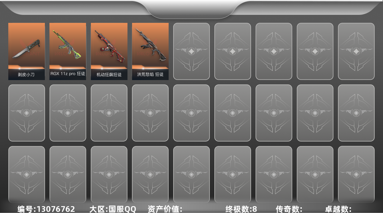 [13076762]【套装】:2025全球冠军赛套装 【英雄】:炼狱,维斯,暮蝶,壹决,捷风,幽影,不死鸟,贤者,猎枭,蝰蛇,芮娜,夜露,海神,盖可,黑梦,钢锁 【近战 武器】:近战武器-2025全球冠军赛 蝴蝶刀,近战武器-剥皮小刀 【狂徒】:狂徒-2025全球冠军赛,狂徒-洪荒怒焰,狂徒-机动狂飙,狂徒-RGX 11z Pro 【幻影】:幻影-混沌序曲//2.0 【骇灵】:骇灵-无限竞技 【卡面】:树懒大作战 卡面,无垠星环 卡面,《双城之战》金克丝 卡面,钢锁vs盖可 卡面,代号红色 卡面,新兵报到 卡面,V契约 卡面,无畏契约 卡面 【喷漆】:放下武器 喷漆,胜利属于无畏契约 喷漆,GLHF 喷漆,无畏契约 喷漆 【挂饰】:无畏契约GO!第一卷 零 挂饰,动力机箱 挂饰,无畏契约 纪念币 挂饰