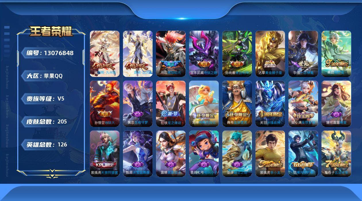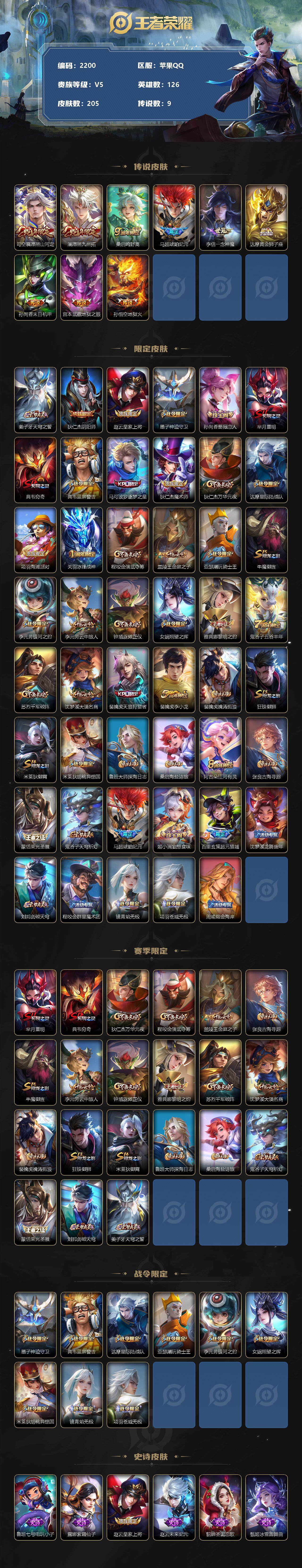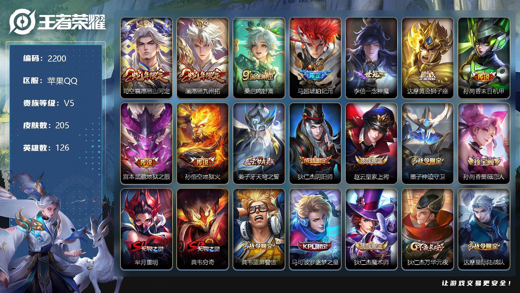 [13076848]苹果Q-V5-至尊星耀II段位-126英雄-205皮肤-0典藏-0珍品无双-0无双-0珍品传说-9传说-55史诗
