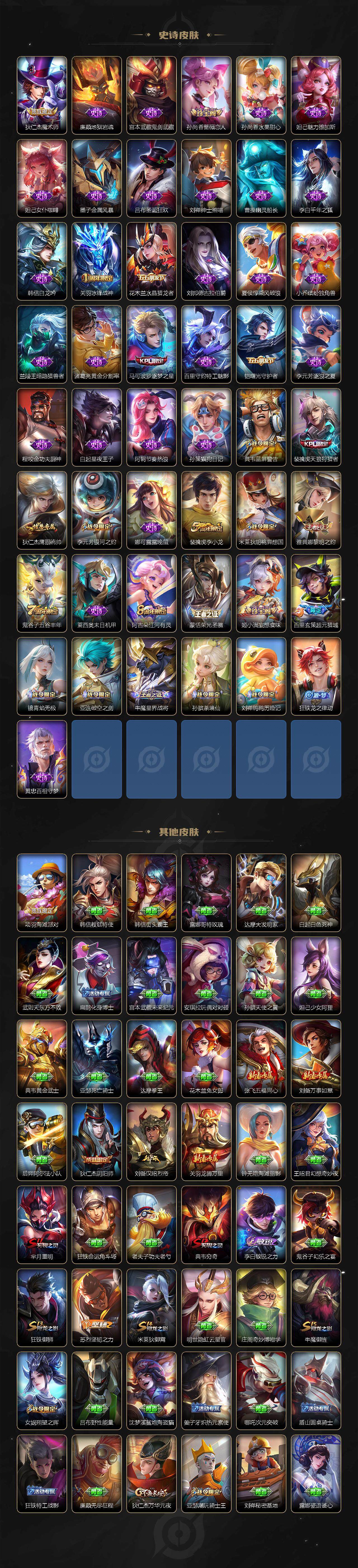 【史诗皮肤】:鲁班七号电玩小子,露娜紫霞仙子,赵云皇家上将,赵云未来纪元,貂蝉圣诞恋歌,甄姬冰雪圆舞曲,狄仁杰魔术师,廉颇地狱岩魂,宫本武藏鬼剑武藏,孙尚香蔷薇恋人,孙尚香水果甜心,妲己魅力维加斯,妲己女仆咖啡,墨子金属风暴,吕布圣诞狂欢,刘禅绅士熊喵,曹操幽灵船长,李白千年之狐,韩信白龙吟,关羽冰锋战神,花木兰水晶猎龙者,刘邦德古拉伯爵,夏侯惇乘风破浪,小乔缤纷独角兽,兰陵王暗隐猎兽者,诸葛亮黄金分割率,马可波罗逐梦之星,百里守约特工魅影,铠曙光守护者,李元芳逐浪之夏,程咬金功夫厨神,白起星夜王子,阿轲节奏热浪,孙策猫狗