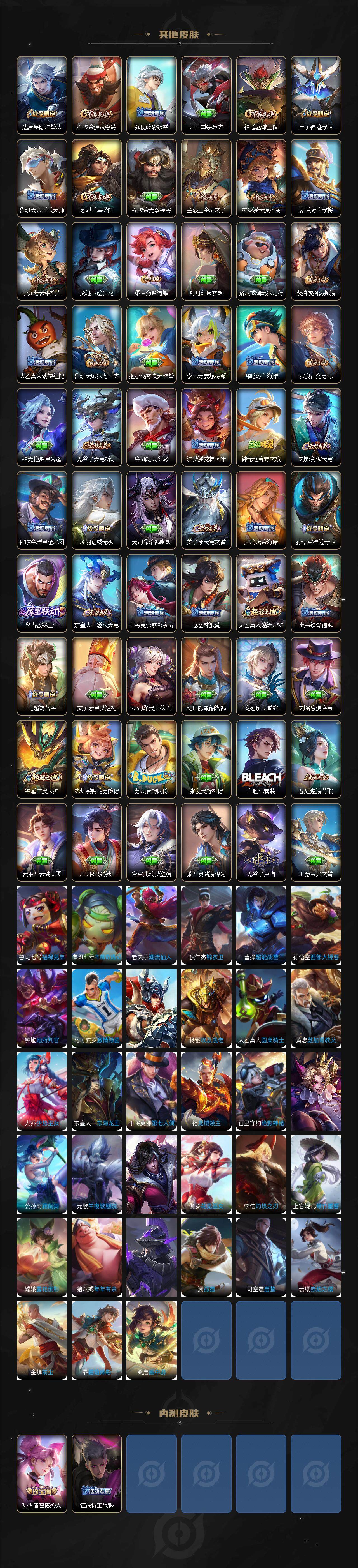 【限定皮肤】:姜子牙天穹之誓,狄仁杰阴阳师,赵云皇家上将,墨子神迹守卫,孙尚香蔷薇恋人,芈月重明,典韦穷奇,典韦蓝屏警告,马可波罗逐梦之星,狄仁杰魔术师,狄仁杰万华元夜,达摩星际陆战队,项羽海滩派对,关羽冰锋战神,程咬金演武夺筹,兰陵王金庭之子,亚瑟潮玩骑士王,牛魔御旌,李元芳银河之约,李元芳云中旅人,钟馗驱傩正仪,女娲朔望之晖,雅典娜黎明之约,鬼谷子五谷丰年,苏烈千军破阵,沈梦溪大漠名商,裴擒虎天狼狩猎者,裴擒虎李小龙,裴擒虎擒涛扼浪,狂铁御狮,米莱狄御霄,米莱狄胡桃异想国,鲁班大师探海日志,桑启海盐诗旅,阿古朵江河有灵,张良古海寻踪,蒙恬荣光圣徽,鬼谷子天穹祈灯,马超琥珀纪元,姬小满妄想食味,百里玄策超元猎域,沈梦溪龙舞盛年,刘邦剑破天穹,程咬金群星魔术团,镜青焰无极,项羽苍威无极,周瑜熔金海岸