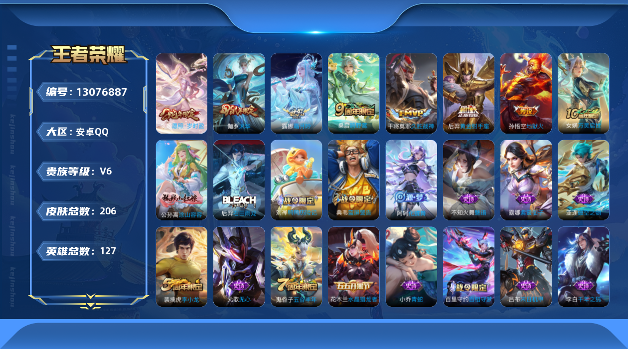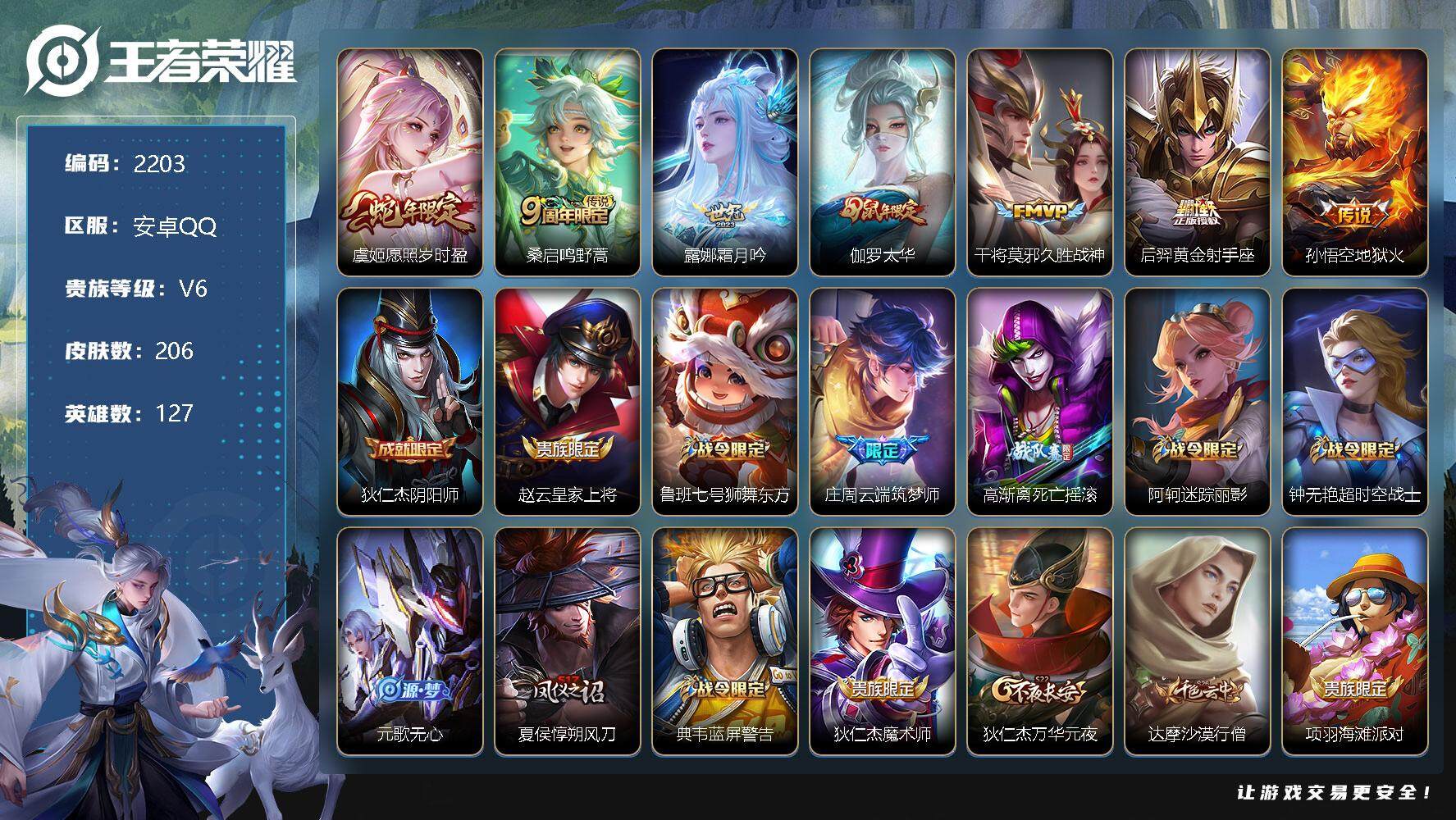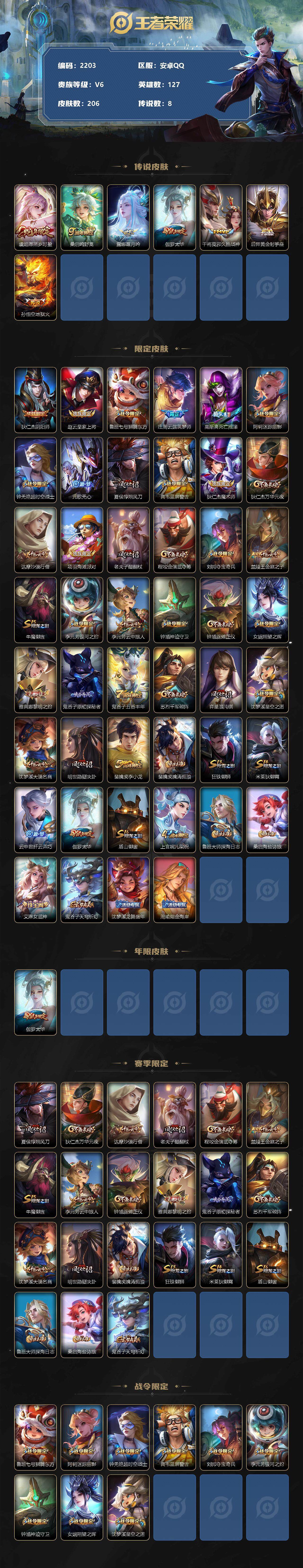 [13076887]安卓Q-V6-永恒钻石III段位-127英雄-206皮肤-0典藏-0珍品无双-0无双-0珍品传说-8传说-45史诗