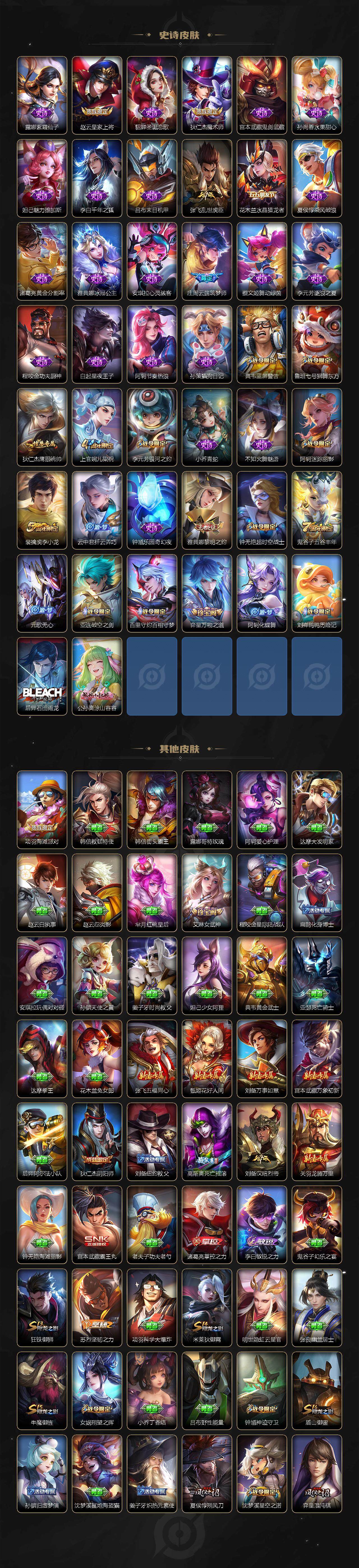 【史诗皮肤】:露娜紫霞仙子,赵云皇家上将,貂蝉圣诞恋歌,狄仁杰魔术师,宫本武藏鬼剑武藏,孙尚香水果甜心,妲己魅力维加斯,李白千年之狐,吕布末日机甲,张飞乱世虎臣,花木兰水晶猎龙者,夏侯惇乘风破浪,诸葛亮黄金分割率,雅典娜冰冠公主,安琪拉心灵骇客,庄周云端筑梦师,蔡文姬舞动绿茵,李元芳逐浪之夏,程咬金功夫厨神,白起星夜王子,阿轲节奏热浪,孙策猫狗日记,典韦蓝屏警告,鲁班七号狮舞东方,狄仁杰鹰眼统帅,上官婉儿梁祝,李元芳银河之约,小乔青蛇,不知火舞魅语,阿轲迷踪丽影,裴擒虎李小龙,云中君纤云弄巧,钟馗乐园奇幻夜,雅典娜黎明之约,钟无艳超时
