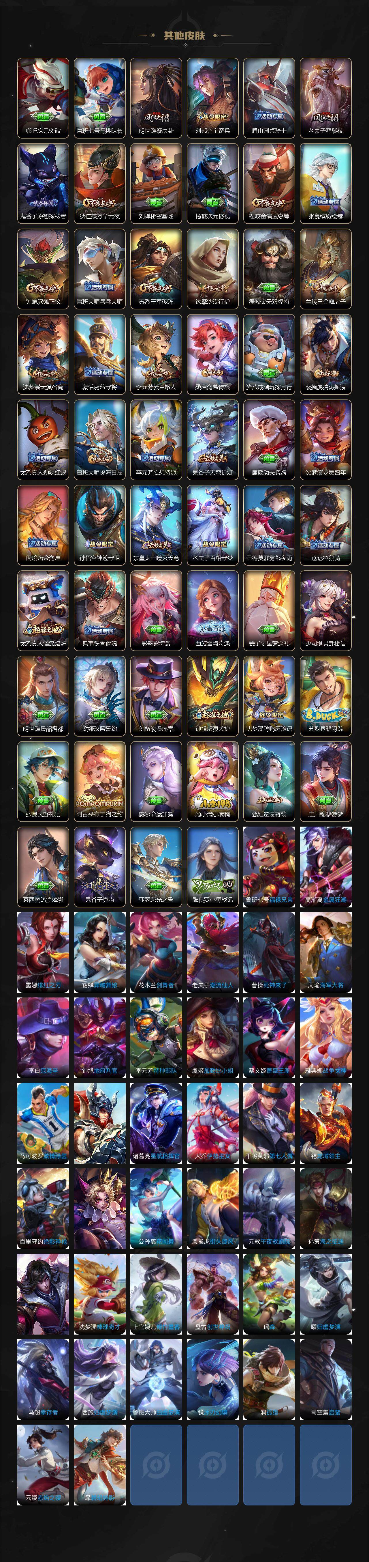狂铁御狮,米莱狄御霄,牛魔御旌,盾山御銮,夏侯惇朔风刀,明世隐疑决卦,老夫子醍醐杖,鬼谷子原初探秘者,狄仁杰万华元夜,程咬金演武夺筹,钟馗驱傩正仪,苏烈千军破阵,女娲朔望之晖,典韦蓝屏警告,钟馗神迹守卫,鲁班七号狮舞东方,沈梦溪星空之诺,李元芳银河之约,刘邦夺宝奇兵,弈星混沌棋,达摩沙漠行僧,兰陵王金庭之子,沈梦溪大漠名商,李元芳云中旅人,桑启海盐诗旅,裴擒虎擒涛扼浪,鲁班大师探海日志
