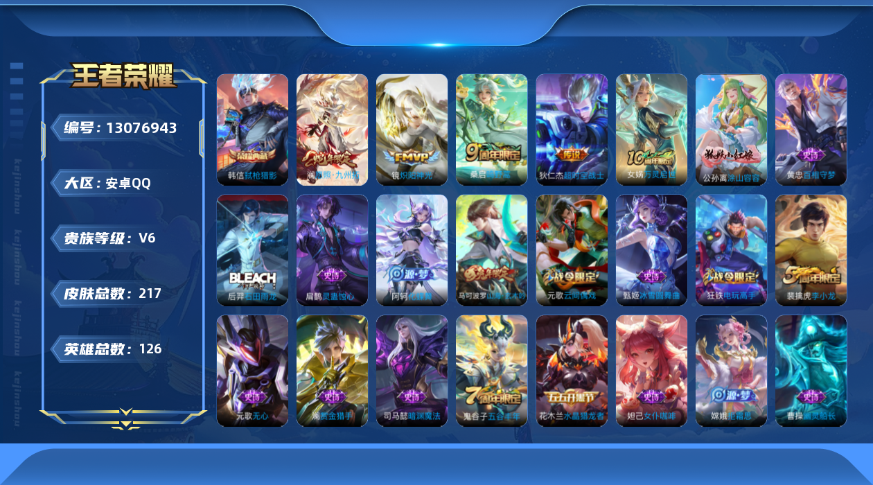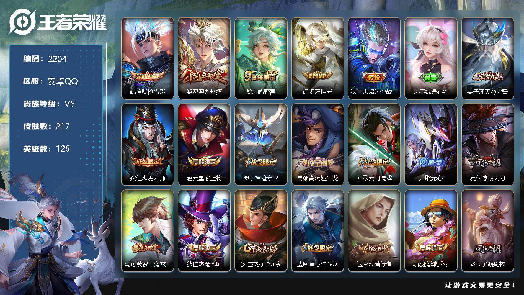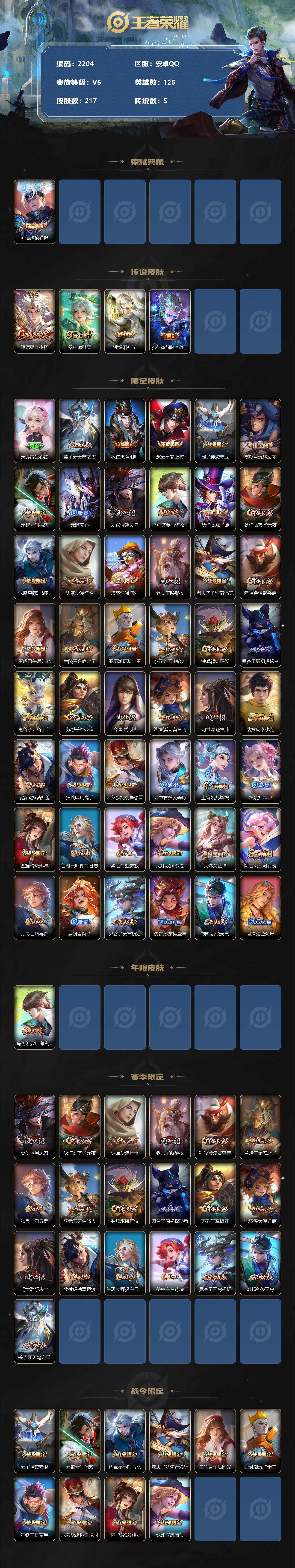 [13076943]安卓Q-V6-至尊星耀III段位-126英雄-217皮肤-1典藏-0珍品无双-0无双-0珍品传说-5传说-48史诗