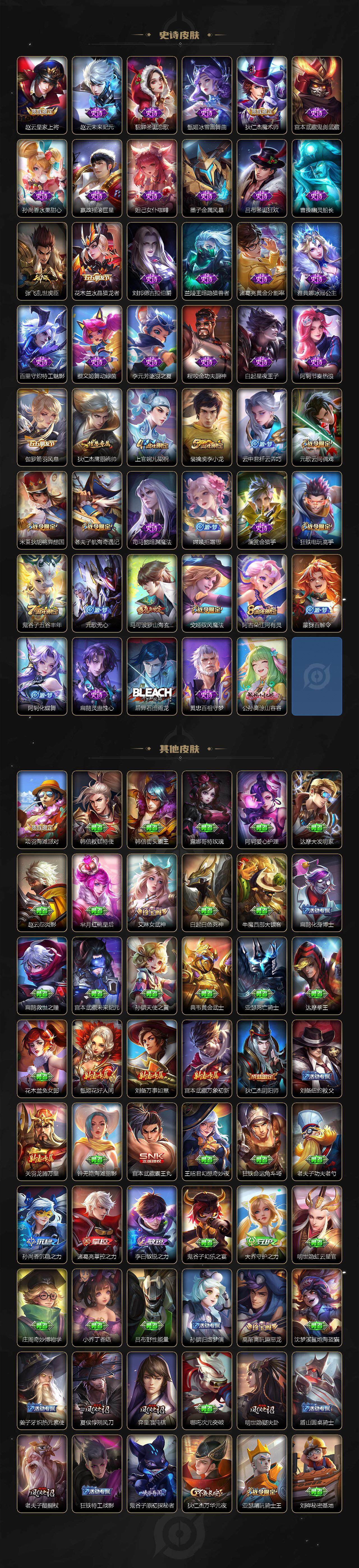 【史诗皮肤】:赵云皇家上将,赵云未来纪元,貂蝉圣诞恋歌,甄姬冰雪圆舞曲,狄仁杰魔术师,宫本武藏鬼剑武藏,孙尚香水果甜心,嬴政摇滚巨星,妲己女仆咖啡,墨子金属风暴,吕布圣诞狂欢,曹操幽灵船长,张飞乱世虎臣,花木兰水晶猎龙者,刘邦德古拉伯爵,兰陵王暗隐猎兽者,诸葛亮黄金分割率,雅典娜冰冠公主,百里守约特工魅影,蔡文姬舞动绿茵,李元芳逐浪之夏,程咬金功夫厨神,白起星夜王子,阿轲节奏热浪,伽罗箭羽风息,狄仁杰鹰眼统帅,上官婉儿梁祝,裴擒虎李小龙,云中君纤云弄巧,元歌云间偶戏,米莱狄胡桃异想国,老夫子航海奇遇记,司马懿暗渊魔法,