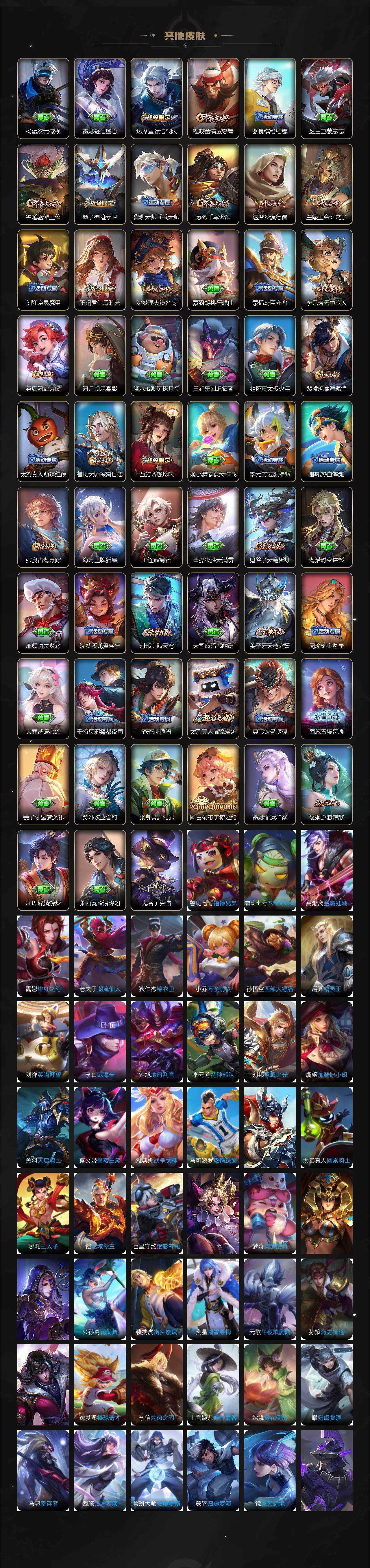 【限定皮肤】:大乔绒语心约,姜子牙天穹之誓,狄仁杰阴阳师,赵云皇家上将,墨子神迹守卫,高渐离玩趣恶龙,元歌云间偶戏,元歌无心,夏侯惇朔风刀,马可波罗山海玄木吟,狄仁杰魔术师,狄仁杰万华元夜,达摩星际陆战队,达摩沙漠行僧,项羽海滩派对,老夫子醍醐杖,老夫子航海奇遇记,程咬金演武夺筹,王昭君午后时光,兰陵王金庭之子,亚瑟潮玩骑士王,李元芳云中旅人,钟馗驱傩正仪,鬼谷子原初探秘者,鬼谷子五谷丰年,苏烈千军破阵,弈星混沌棋,沈梦溪大漠名商,明世隐疑决卦,裴擒虎李小龙,裴擒虎擒涛扼浪,狂铁电玩高手,米莱狄胡桃异想国,云中君纤云弄巧,上官婉儿梁祝,嫦娥拒霜思,西施玲珑珍味,鲁班大师探海日志,桑启海盐诗旅,戈娅驭风魔法,艾琳女武神,阿古朵江河有灵,张良古海寻踪,蒙犽百解令,鬼谷子天穹祈灯,沈梦溪龙舞盛年,刘邦剑破天穹,周瑜熔金海岸