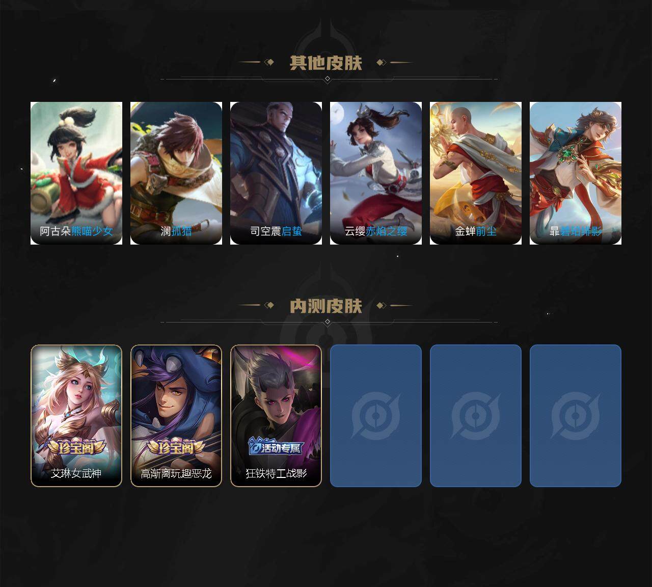 【赛季限定】:夏侯惇朔风刀,狄仁杰万华元夜,达摩沙漠行僧,老夫子醍醐杖,程咬金演武夺筹,兰陵王金庭之子,张良古海寻踪,李元芳云中旅人,钟馗驱傩正仪,鬼谷子原初探秘者,苏烈千军破阵,弈星混沌棋,沈梦溪大漠名商,明世隐疑决卦,裴擒虎擒涛扼浪,鲁班大师探海日志,桑启海盐诗旅,鬼谷子天穹祈灯,刘邦剑破天穹,姜子牙天穹之誓