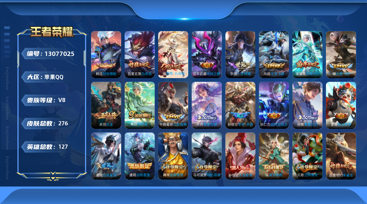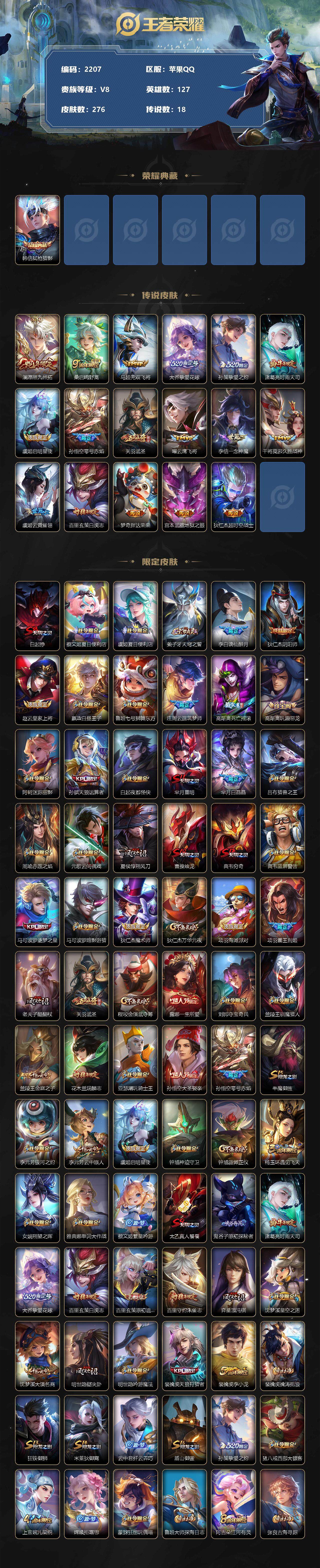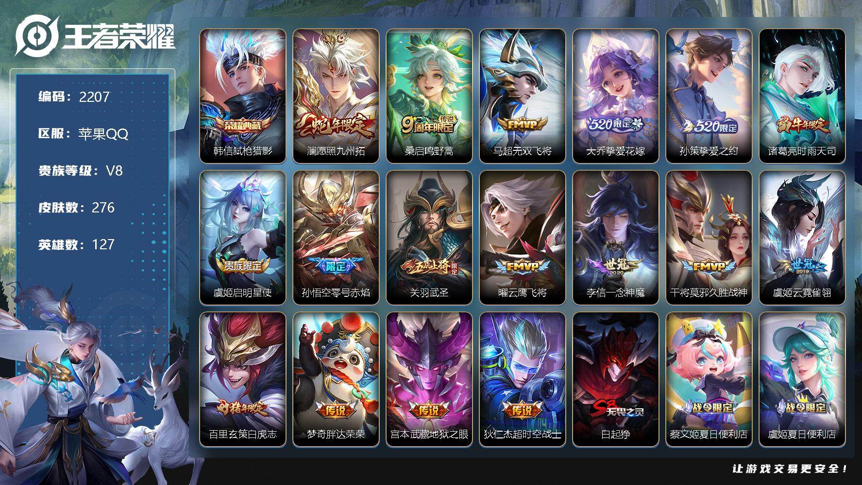 [13077025]苹果Q-V8-尊贵铂金II段位-127英雄-276皮肤-1典藏-0珍品无双-0无双-0珍品传说-18传说-78史诗