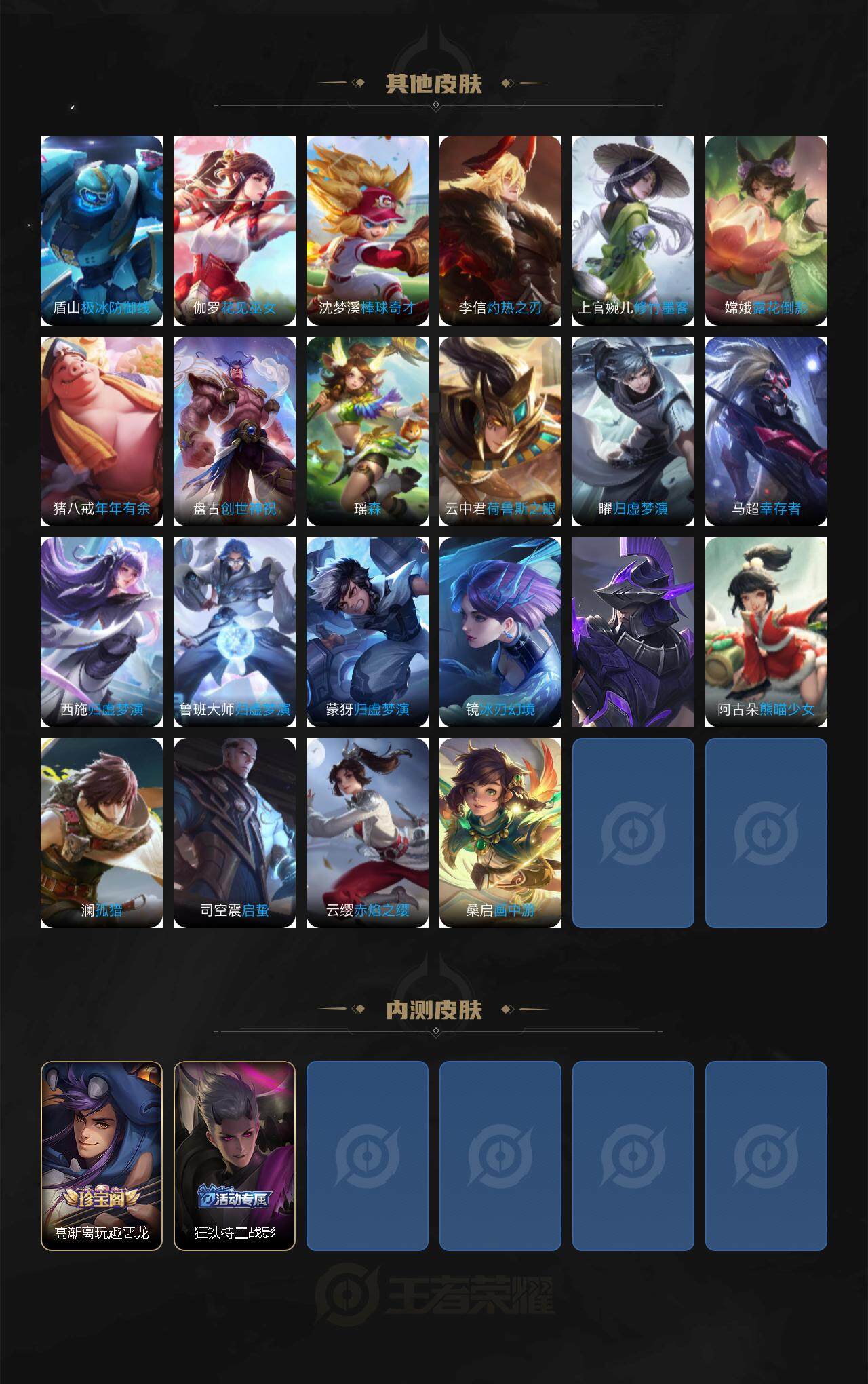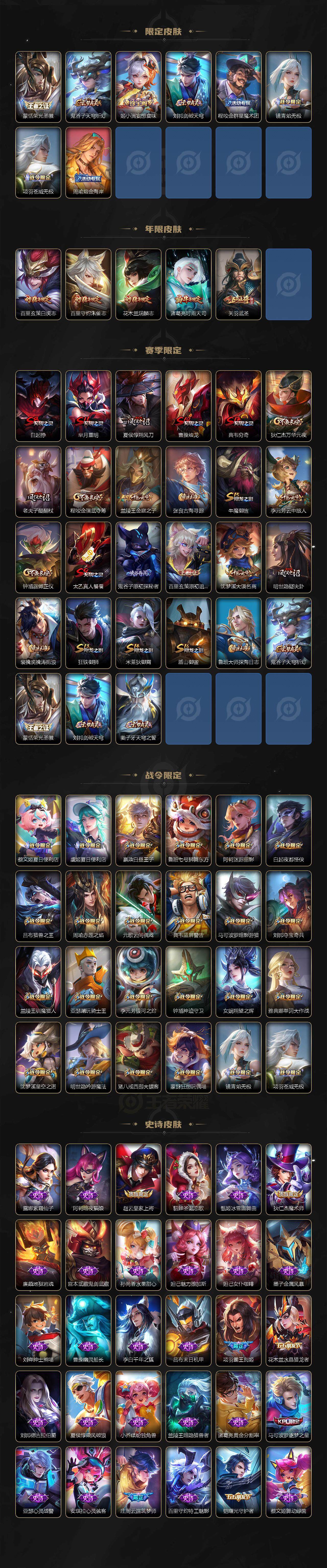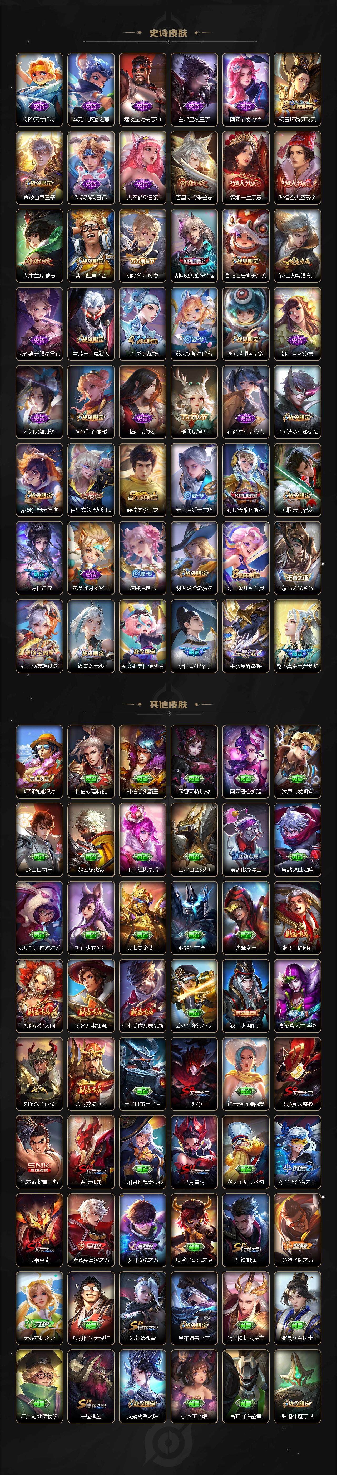【限定皮肤】:白起狰,蔡文姬夏日便利店,虞姬夏日便利店,姜子牙天穹之誓,李白谪仙醉月,狄仁杰阴阳师,赵云皇家上将,嬴政白昼王子,鲁班七号狮舞东方,庄周云端筑梦师,高渐离死亡摇滚,高渐离玩趣恶龙,阿轲迷踪丽影,孙膑天狼运算者,白起夜都怪侠,芈月重明,芈月白晶晶,吕布猎兽之王,周瑜赤莲之焰,元歌云间偶戏,夏侯惇朔风刀,曹操烛龙,典韦穷奇,典韦蓝屏警告,马可波罗逐梦之星,马可波罗暗影游猎,狄仁杰魔术师,狄仁杰万华元夜,项羽海滩派对,项羽霸王别姬,老夫子醍醐杖,关羽武圣,程咬金演武夺筹,露娜一生所爱,刘邦夺宝奇兵,兰陵王驯魔猎人,兰陵王金庭之子,花木兰瑞麟志,亚瑟潮玩骑士王,孙悟空大圣娶亲,孙悟空零号赤焰,牛魔御旌,李元芳银河之约,李元芳云中旅人,虞姬启明星使,钟馗神迹守卫,钟馗驱傩正仪,杨玉环遇见飞天,女娲朔望之晖,雅典娜单词大作战,蔡文姬繁星吟游,太乙真人饕餮,鬼谷子原初探秘者,诸葛亮时雨天司,大乔挚爱花嫁,百里玄策白虎志,百里玄策原初追逐者,百里守约朱雀志,弈星混沌棋,沈梦溪星空之诺,沈梦溪大漠名商,明世隐疑决卦,明世隐吟游魔法,裴擒虎天狼狩猎者,裴擒虎李小龙,裴擒虎擒涛扼浪,狂铁御狮,米莱狄御霄,云中君纤云弄巧,盾山御銮,孙策挚爱之约,猪八戒西部大镖客,上官婉儿梁祝,嫦娥拒霜思,蒙犽狂想玩偶喵,鲁班大师探海日志,阿古朵江河有灵,张良古海寻踪,蒙恬荣光圣徽,鬼谷子天穹祈灯,姬小满妄想食味,刘邦剑破天穹,程咬金群星魔术团,镜青焰无极,项羽苍威无极,周瑜熔金海岸