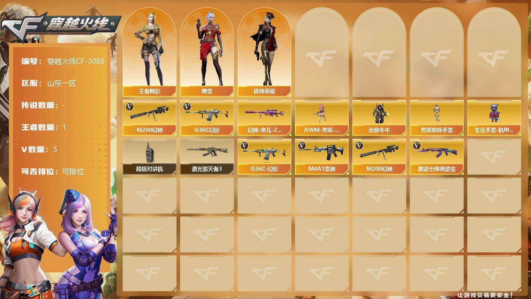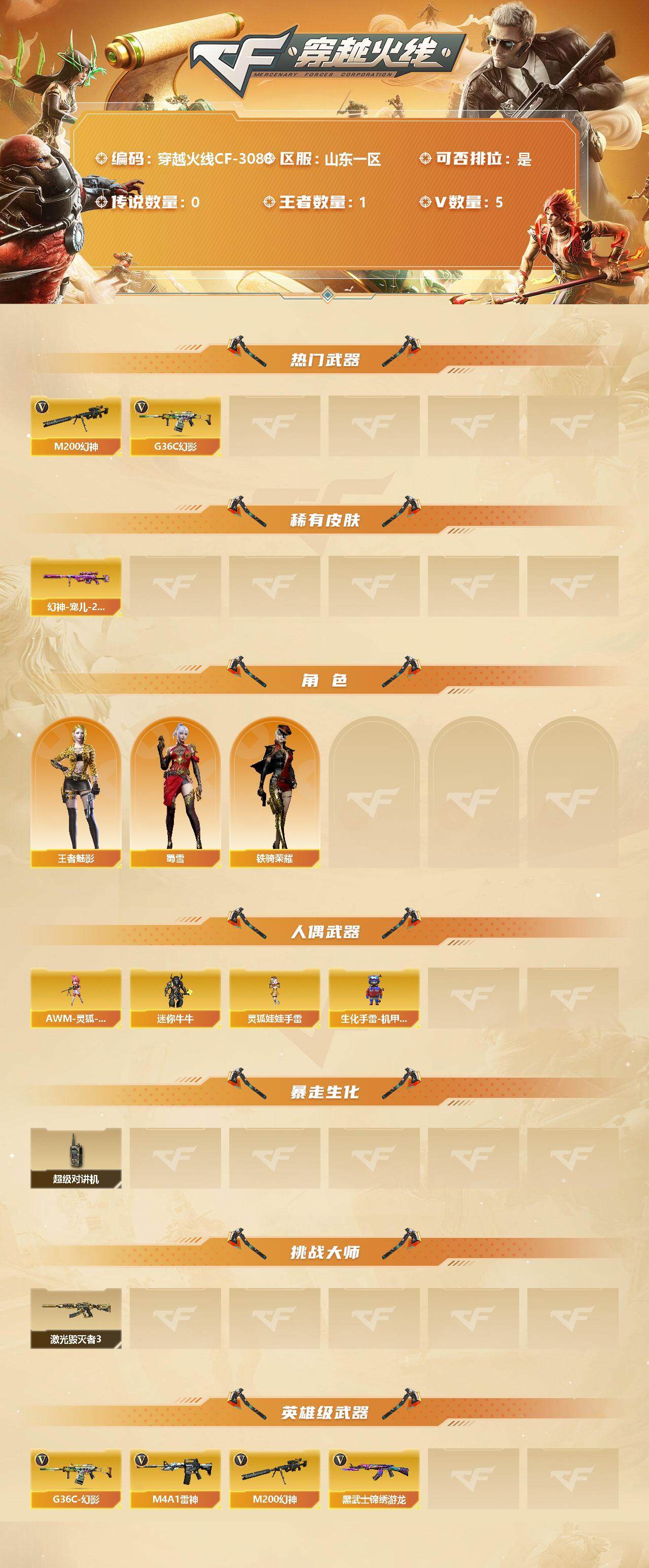 [13077269]山东一区-5V-1王者-0炫金 【热门武器】:G36C-幻影,M200-幻神 【皮肤】:幻神-宠儿-2021MVP 【角色】:王者-魅影,蜀雪,铁骑荣耀 【人偶武器】:AWM-灵狐-15周年嘉年华,迷你牛牛*2,灵狐娃娃手雷,生化手雷-机甲核心*2 【暴走生化】:超级对讲机 【挑战大师】:激光毁灭者III 【英雄级武器】:M4A1-雷神,G36C-幻影,黑武士-锦绣游龙,M200-幻神 【特殊枪械】: