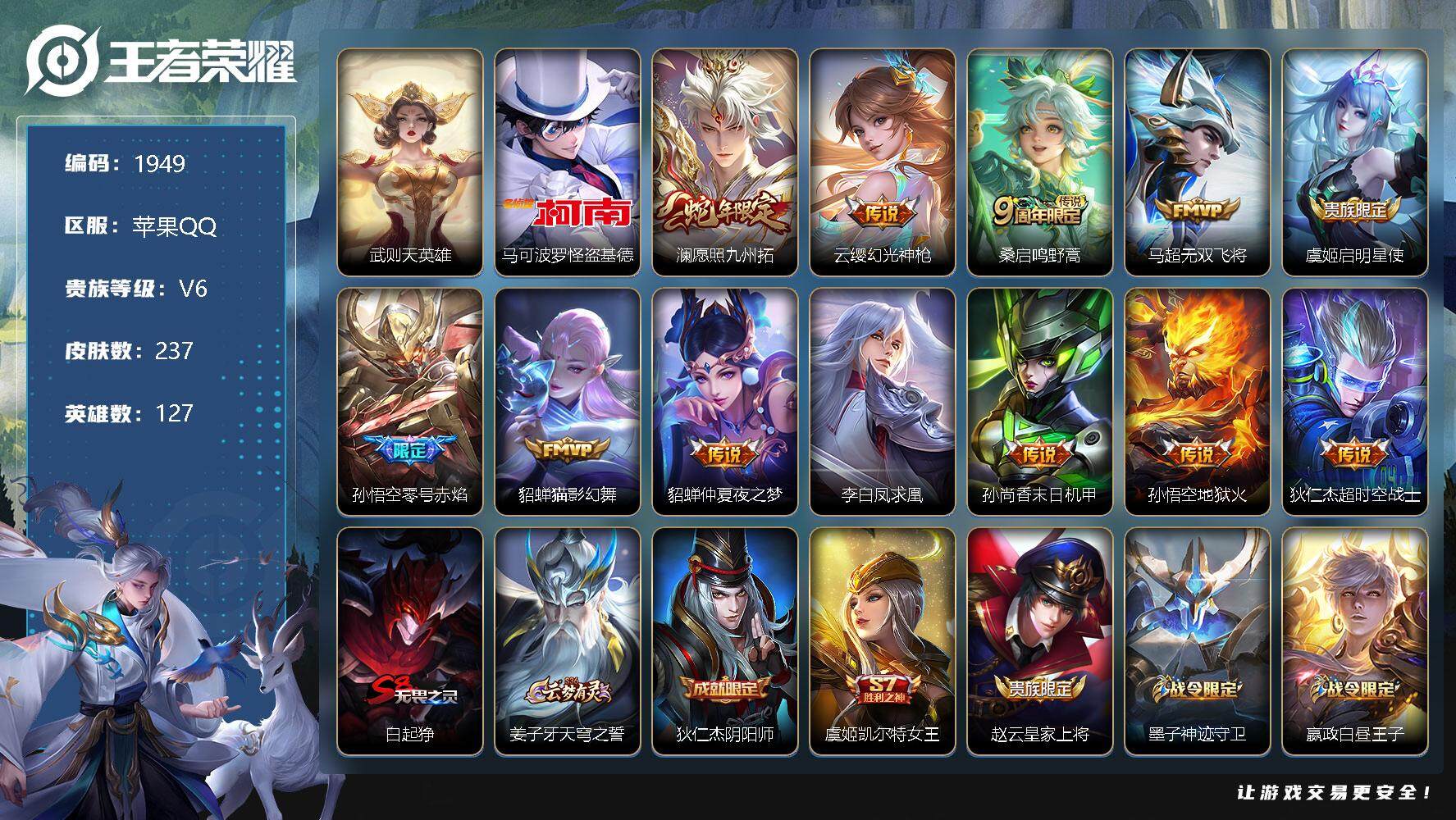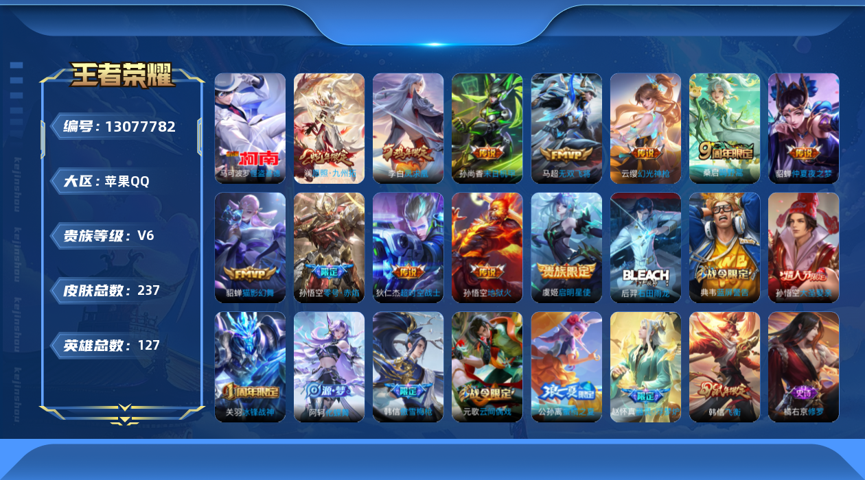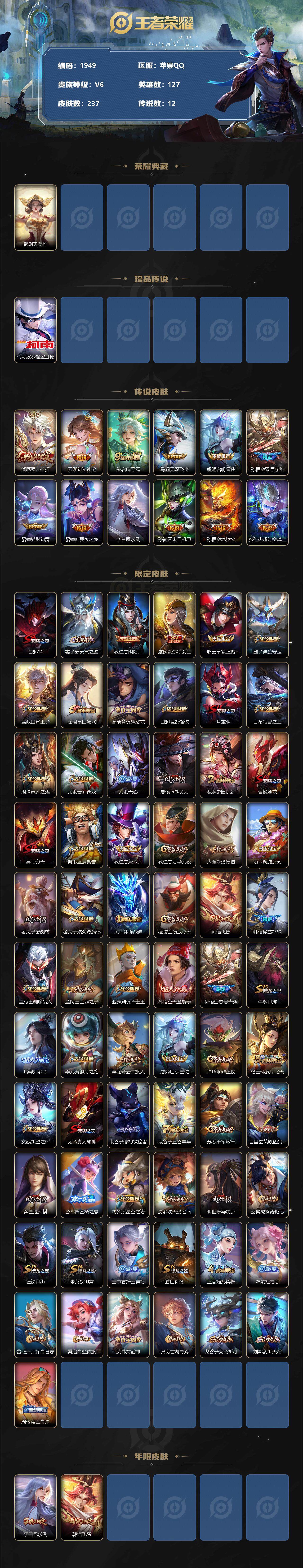 [13077782]苹果Q-V5-尊贵铂金III段位-127英雄-237皮肤-0典藏-0珍品无双-0无双-1珍品传说-12传说-55史诗