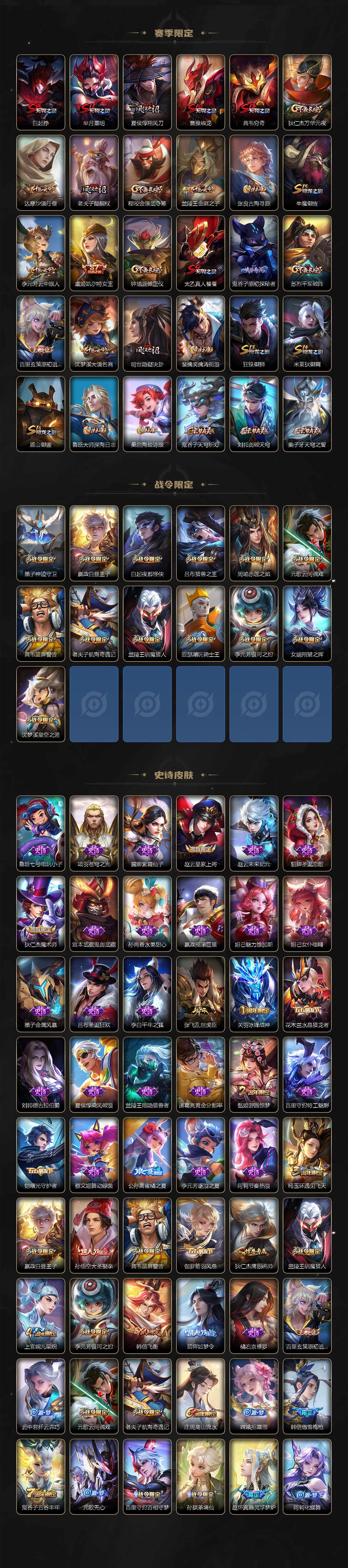【赛季限定】:白起狰,芈月重明,夏侯惇朔风刀,曹操烛龙,典韦穷奇,狄仁杰万华元夜,达摩沙漠行僧,老夫子醍醐杖,程咬金演武夺筹,兰陵王金庭之子,张良古海寻踪,牛魔御旌,李元芳云中旅人,虞姬凯尔特女王,钟馗驱傩正仪,太乙真人饕餮,鬼谷子原初探秘者,苏烈千军破阵,百里玄策原初追逐者,弈星混沌棋,沈梦溪大漠名商,明世隐疑决卦,裴擒虎擒涛扼浪,狂铁御狮,米莱狄御霄,盾山御銮,鲁班大师探海日志,桑启海盐诗旅,鬼谷子天穹祈灯,刘邦剑破天穹,姜子牙天穹之誓