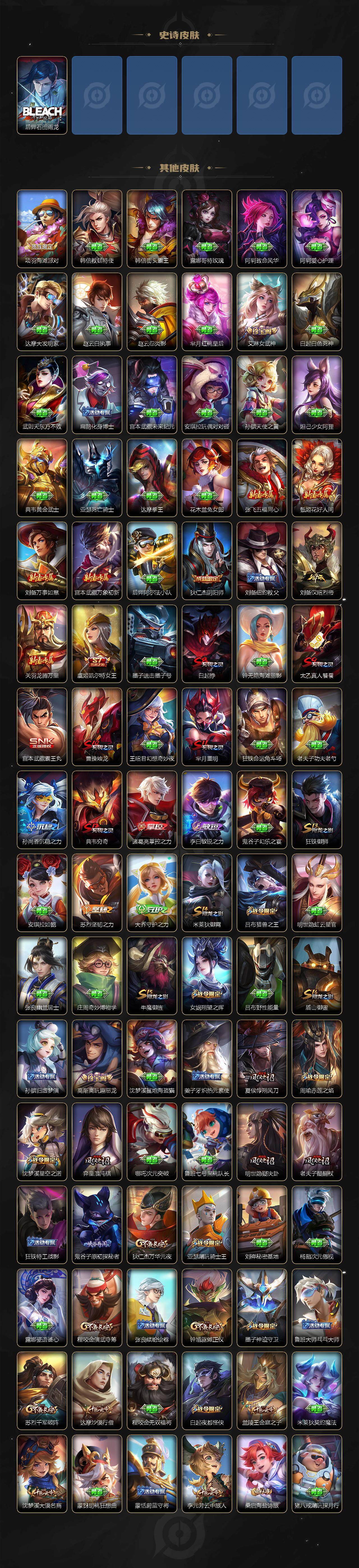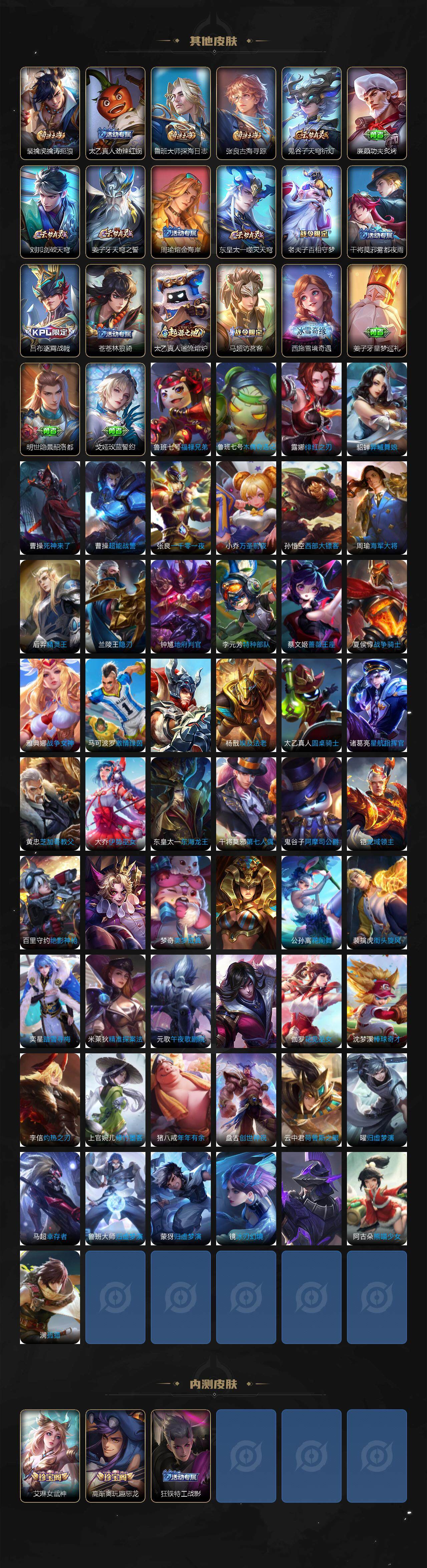【限定皮肤】:白起狰,姜子牙天穹之誓,狄仁杰阴阳师,虞姬凯尔特女王,赵云皇家上将,墨子神迹守卫,嬴政白昼王子,庄周高山流水,高渐离玩趣恶龙,白起夜都怪侠,芈月重明,吕布猎兽之王,周瑜赤莲之焰,元歌云间偶戏,元歌无心,夏侯惇朔风刀,甄姬游园惊梦,曹操烛龙,典韦穷奇,典韦蓝屏警告,狄仁杰魔术师,狄仁杰万华元夜,达摩沙漠行僧,项羽海滩派对,老夫子醍醐杖,老夫子航海奇遇记,关羽冰锋战神,程咬金演武夺筹,韩信飞衡,韩信傲雪梅枪,兰陵王驯魔猎人,兰陵王金庭之子,亚瑟潮玩骑士王,孙悟空大圣娶亲,孙悟空零号赤焰,牛魔御旌,后羿如梦令,李元芳银河之约,李元芳云中旅人,虞姬启明星使,钟馗驱傩正仪,杨玉环遇见飞天,女娲朔望之晖,太乙真人饕餮,鬼谷子原初探秘者,鬼谷子五谷丰年,苏烈千军破阵,百里玄策原初追逐者,弈星混沌棋,公孙离蜜橘之夏,沈梦溪星空之诺,沈梦溪大漠名商,明世隐疑决卦,裴擒虎擒涛扼浪,狂铁御狮,米莱狄御霄,云中君纤云弄巧,盾山御銮,上官婉儿梁祝,嫦娥拒霜思,鲁班大师探海日志,桑启海盐诗旅,艾琳女武神,张良古海寻踪,鬼谷子天穹祈灯,刘邦剑破天穹,周瑜熔金海岸