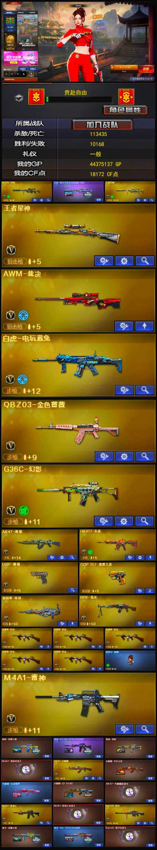 【热门武器】:G36C-幻影,QBZ03-金色蔷薇,HK417-朱雀,M200-幻神,金色蔷薇-古蛇迷踪,修罗-古蛇迷踪,白虎-电玩蓝兔,M4A1-黑骑士,汤姆逊-烈龙*5,RPK-盘龙,加特林-炼狱,斯泰尔-蝴蝶,USP-雷暴,COP 357-雷霆王者,沙鹰-修罗*3,金刚伞