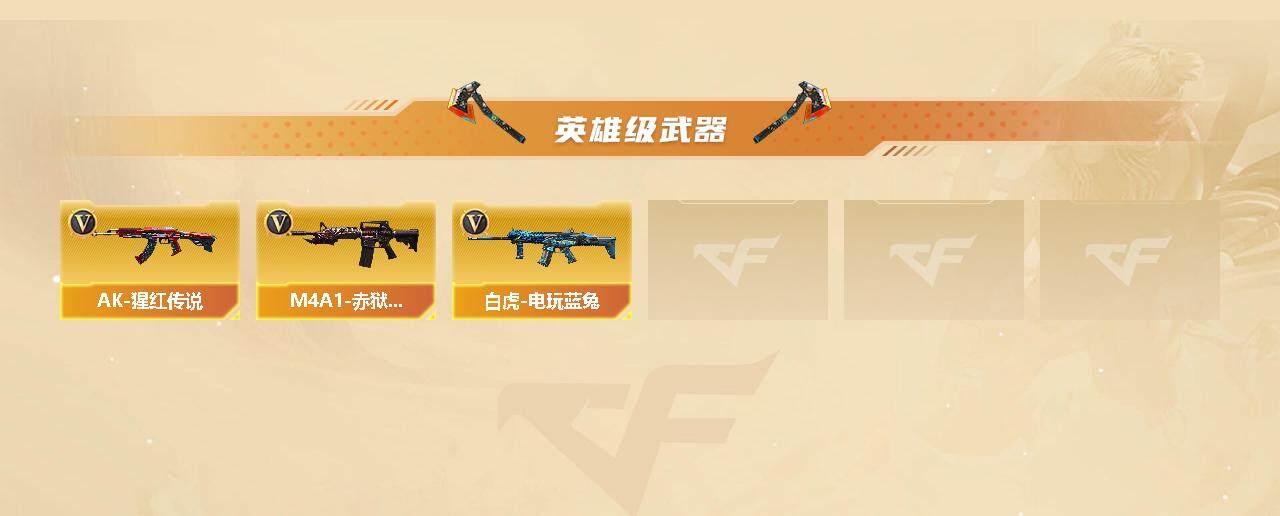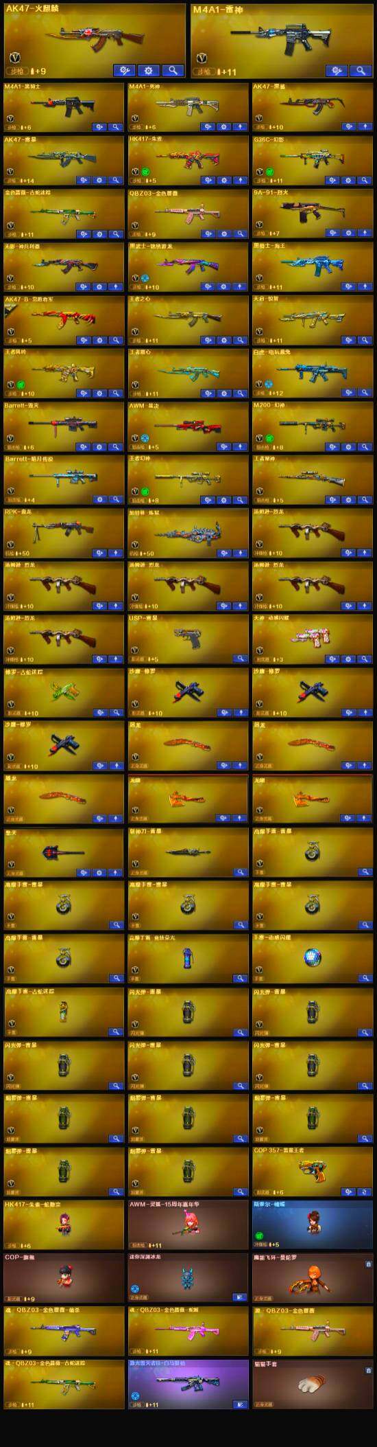 【英雄级武器】:AK47-火麒麟,M4A1-雷神,M4A1-黑骑士,M4A1-死神,AK47-黑鲨,AK47-雷暴,HK417-朱雀,无影-神兵利器,G36C-幻影,黑武士-锦绣游龙,金色蔷薇-古蛇迷踪,QBZ03-金色蔷薇,王者之心-觉醒版,天启-悦智-觉醒版,AK-47-猩红传说,黑骑士-海王,AK47-B-常胜将军,白虎-电玩蓝兔,Barrett-毁灭,AWM-裁决,M200-幻神,王者幻神-觉醒版,王者星神-觉醒版,RPK-盘龙,加特林-炼狱,汤姆逊-烈龙*5,沙鹰-修罗*3,USP-雷暴,天神-动感闪耀,修罗-古蛇迷踪,屠龙*3,龙啸*2,擎天,斩神刀-雷暴,高爆手雷-雷暴*5,高爆手雷-竞技荣光,手雷-动感闪耀,高爆手雷-古蛇迷踪,闪光弹-雷暴*5,烟雾弹-雷暴*5,烟雾弹-古蛇迷踪,M4A1-赤狱骑士