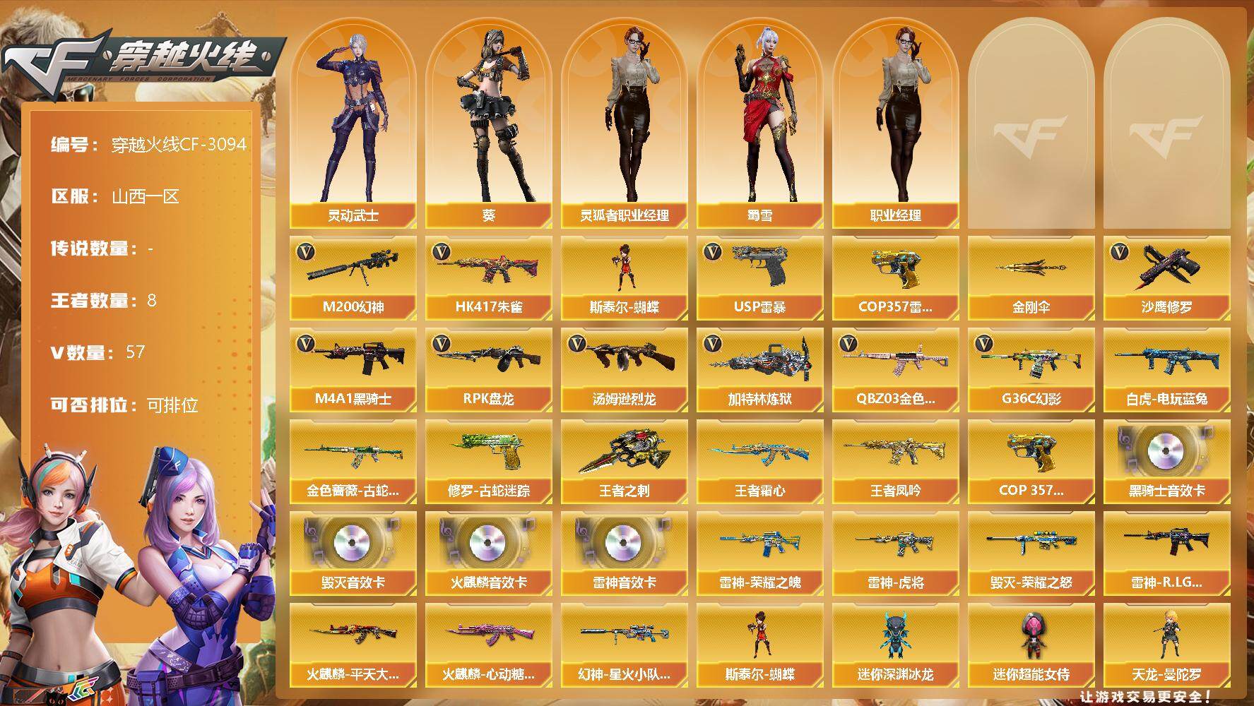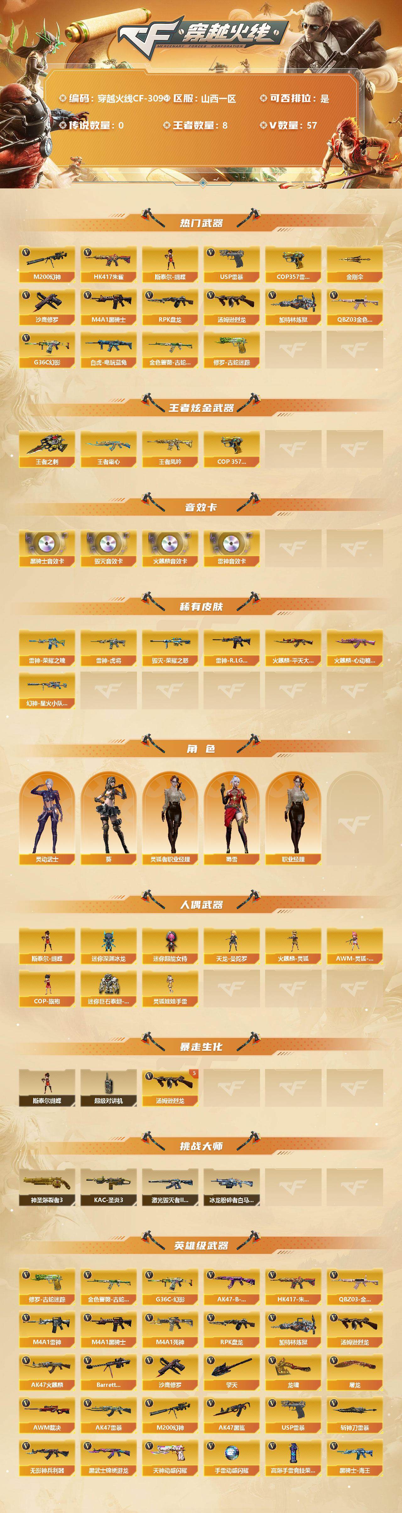 [13078167]山西一区-57V-8王者-0炫金 【热门武器】:G36C-幻影,QBZ03-金色蔷薇,HK417-朱雀,M200-幻神,金色蔷薇-古蛇迷踪,修罗-古蛇迷踪,白虎-电玩蓝兔,M4A1-黑骑士,汤姆逊-烈龙*5,RPK-盘龙,加特林-炼狱,斯泰尔-蝴蝶,USP-雷暴,COP 357-雷霆王者,沙鹰-修罗*3,金刚伞 【王者炫金武器】:王者凤吟,王者霜心,COP 357-雷霆王者,王者之刺 【音效卡】:AK47-火麒麟音效卡,M4A1-雷神音效卡,M4A1-黑骑士音效卡,Barrett-毁灭音效卡 【皮肤】:幻神-星火小队签名臻藏版 皮肤,雷神-荣耀之魄,雷神-虎将,雷神-R.LGD-CFPLS18冠军,火麒麟-平天大圣,火麒麟-心动糖果,毁灭-荣耀之怒,战神-紫绶金章皮肤 【角色】:葵,蛇隐宗,乔伊教练,灵狐者-职业经理*2,蜀雪,灵动武士 【人偶武器】:天龙-曼陀罗,火麒麟-灵狐,斯泰尔-蝴蝶,AWM-灵狐-15周年嘉年华,COP-旗袍,迷你超能女侍,迷你巨石泰坦-魔花研究所,迷你深渊冰龙,灵狐娃娃手雷 【暴走生化】:斯泰尔-蝴蝶,超级对讲机 【挑战大师】:神圣爆裂者III,冰龙粉碎者-白马银枪,激光毁灭者III-白马银枪,KAC-圣炎切割者III 【英雄级武器】:AK47-火麒麟,M4A1-雷神,M4A1-黑骑士,M4A1-死神,AK47-黑鲨,AK47-雷暴,HK417-朱雀,无影-神兵利器,G36C-幻影,黑武士-锦绣游龙,金色蔷薇-古蛇迷踪,QBZ03-金色蔷薇,王者之心-觉醒版,天启-悦智-觉醒版,AK-47-猩红传说,黑骑士-海王,AK47-B-常胜将军,白虎-电玩蓝兔,Barrett-毁灭,AWM-裁决,M200-幻神,王者幻神-觉醒版,王者星神-觉醒版,RPK-盘龙,加特林-炼狱,汤姆逊-烈龙*5,沙鹰-修罗*3,USP-雷暴,天神-动感闪耀,修罗-古蛇迷踪,屠龙*3,龙啸*2,擎天,斩神刀-雷暴,高爆手雷-雷暴*5,高爆手雷-竞技荣光,手雷-动感闪耀,高爆手雷-古蛇迷踪,闪光弹-雷暴*5,烟雾弹-雷暴*5,烟雾弹-古蛇迷踪,M4A1-赤狱骑士 【特殊枪械】:蝴蝶斯泰尔+5烈龙,1黑骑士,5烈龙,1盘龙,1炼狱,1蝴蝶斯泰尔