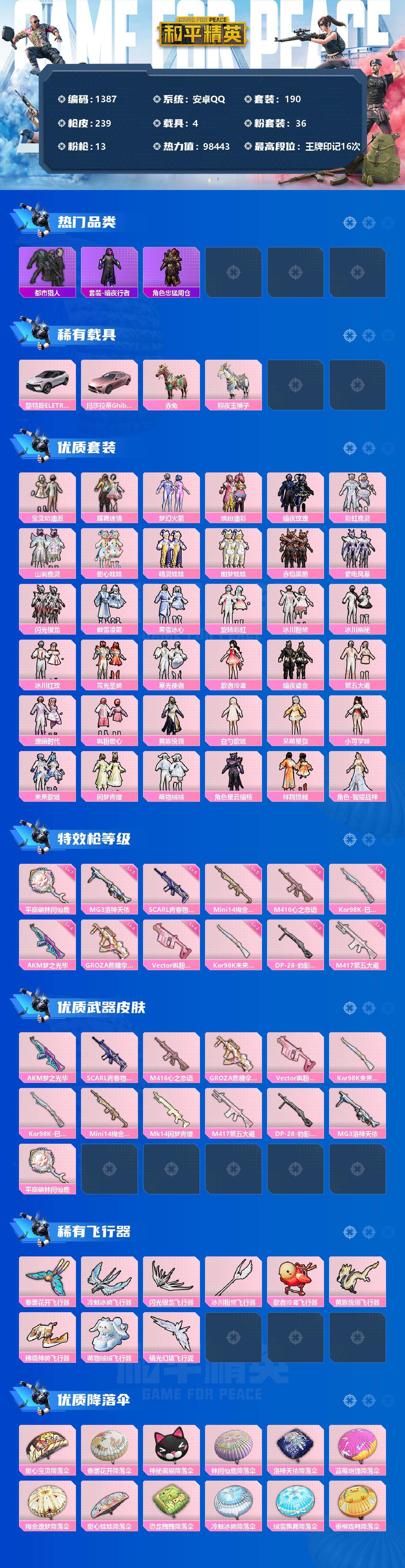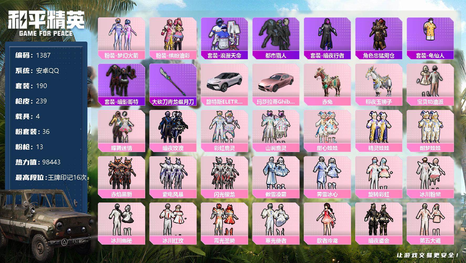 [13079494]安卓 手Q-36粉装-13特效枪-4载具-10粉色飞行器-98443热力值-16王牌印记-190套装-239枪皮