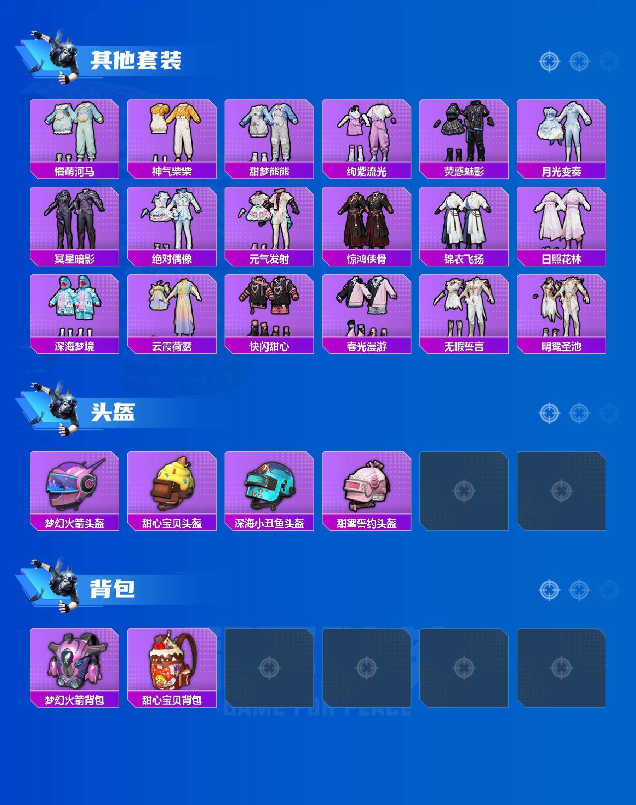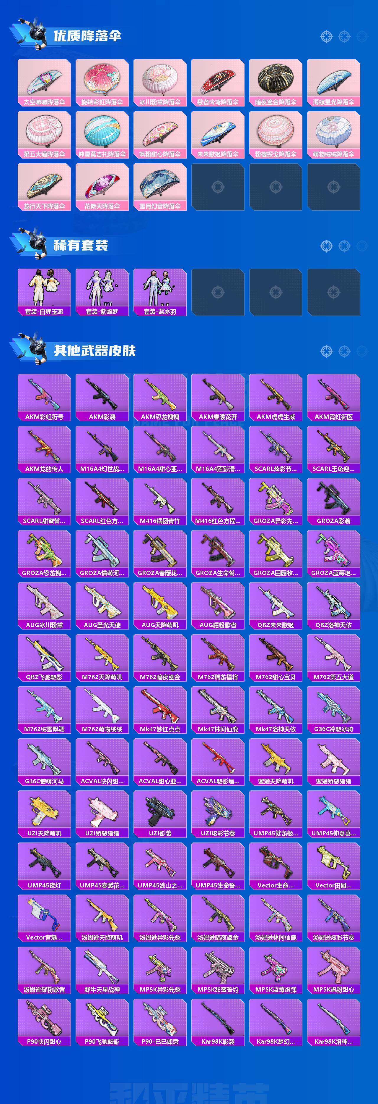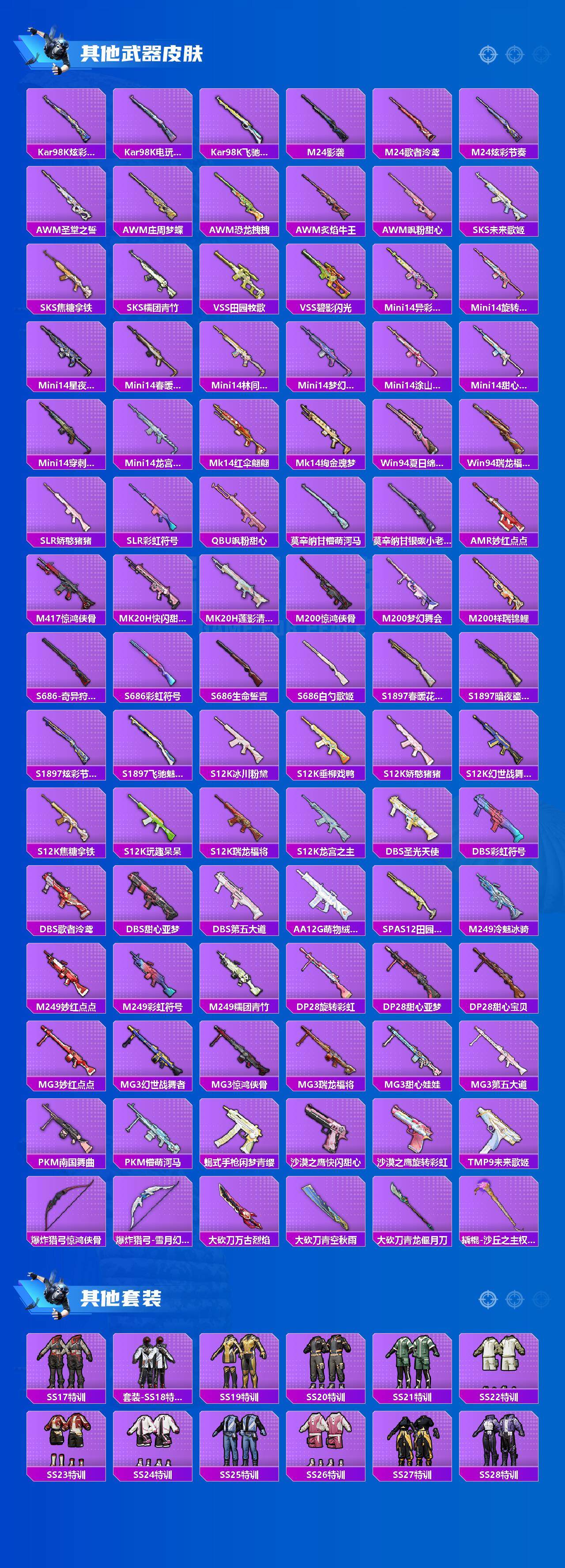 - [11604058]1红装 1粉装 5特效枪 1载具 可二次 优质装备:最终圣卫者-帕修斯,一级最终圣卫者-帕修斯,宝马M4(圣保罗黄),GROZA-镜光银凌,AUG-暖羊咩咩,MK14-甜梦熊击,冷漠罗丽,M416-灵猫魔法师,Kar98K-巳巳如意 五级特效枪:五级GROZA-镜光银凌,五级Kar98K-巳巳如意,五级MK14-甜梦熊击,五级AUG-暖羊咩咩 三级特效枪:三级M416-灵猫魔法师 紫色装扮:SS30特训套装,SS31特训套装,云朵鹅,彩虹兔,雪绒豹,SS33特训套装,顶瓜瓜,缤纷果语,鹤鸣,黑色伏地魔,龟仙人,冰河战士,蝶变,香桃花海,完美偶像,帅气教官,竞技达人朋克,雏菊兔兔,萝兰蝴蝶,SS29特训,星途旅人,巳巳如意,异域银装,鱼渊荷华,燕燕于飞,森林游猎者,绒宝小鹅,青团波波,糖糖葫芦,棉花软糖,竞技名士,街头风暴,红红火火,许七安,智谋强哥,焰鹰斗篷,幻羽潜行,竞速先锋,粉红小猪,大橘大利,星渊小夜曲,星影赞美诗,小鸟芋圆,耀粉歌者,蓝冰羽,紫幽梦,光之冒险 优质战备:星途旅人降落伞,江南烟雨降落伞,千金淑猫降落伞,冷漠罗丽降落伞,灵猫魔法师飞行器,灵猫魔法师降落伞,鬼刀降落伞,月影灵韵降落伞,临安公主降落伞