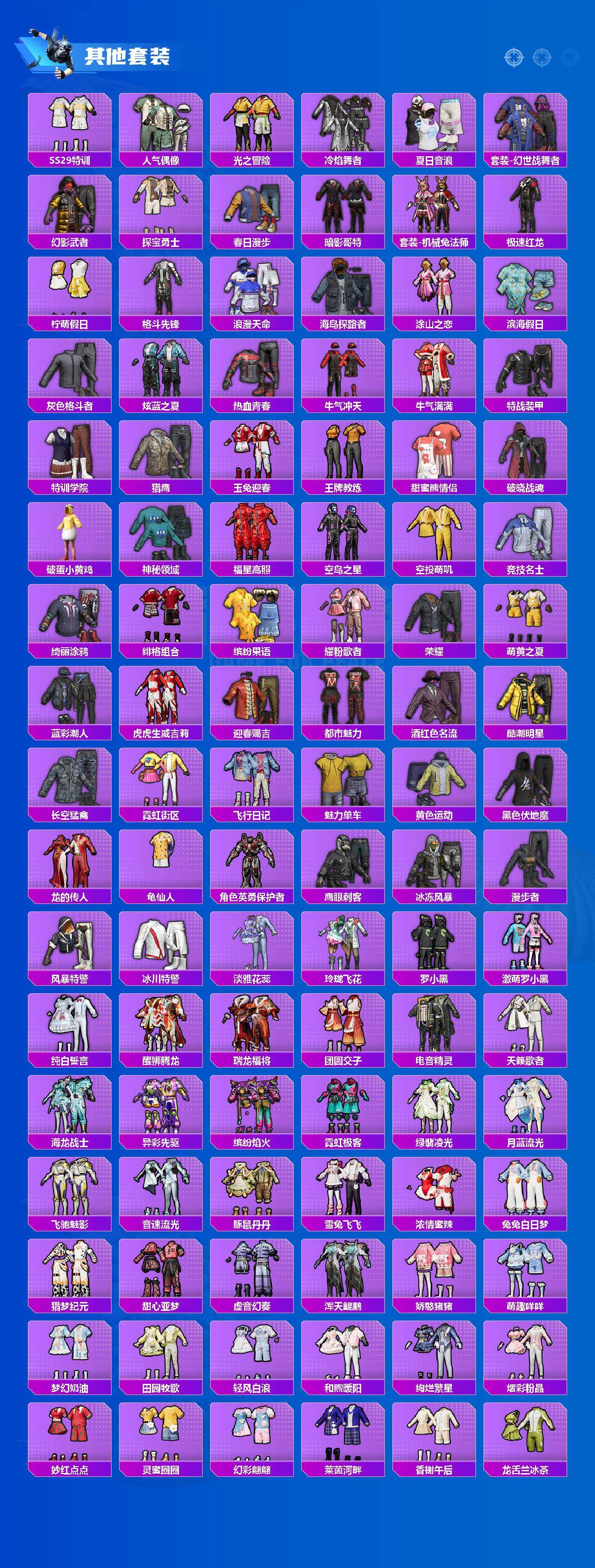 【粉色套装】:粉装-宝贝奶油派,粉装-蝶舞迷情,粉装-梦幻火箭,粉装-缤纷油彩,粉装-暗夜玫瑰,粉装-彩虹鹿灵,粉装-山涧鹿灵,粉装-甜心娃娃,粉装-精灵娃娃,粉装-酣梦娃娃,粉装-赤焰黑爵,粉装-紫电风暴,粉装-闪光银龙,粉装-傲雪凌霜,粉装-霁雪冰心,粉装-旋转彩虹,粉装-冰川粉黛,粉装-冰川幽秘,粉装-冰川红玫,粉装-霞光圣骑,粉装-寒光使者,角色-歌者泠鸢,粉装-暗夜鎏金,粉装-第五大道,粉装-瑰丽时代,粉装-飒粉甜心,粉装-黄族统领,角色-白勺歌姬,角色-呆萌星弥,角色-小可学妹,粉装-未来歌姬,粉装-闲梦青缨,粉装-萌物绒绒,角色-星云暗核,粉装-祥瑞锦鲤,角色-智耀战神