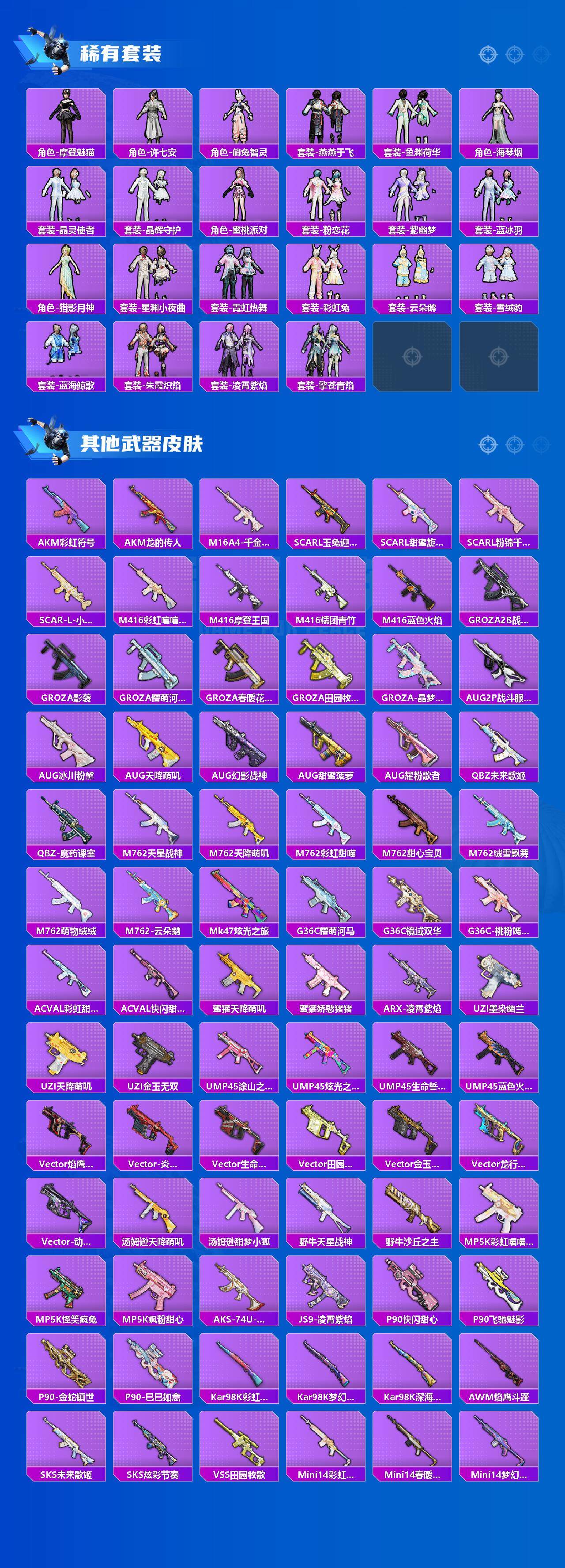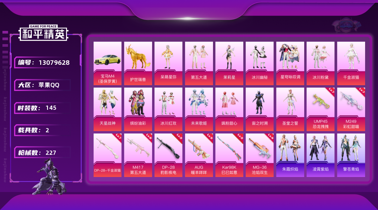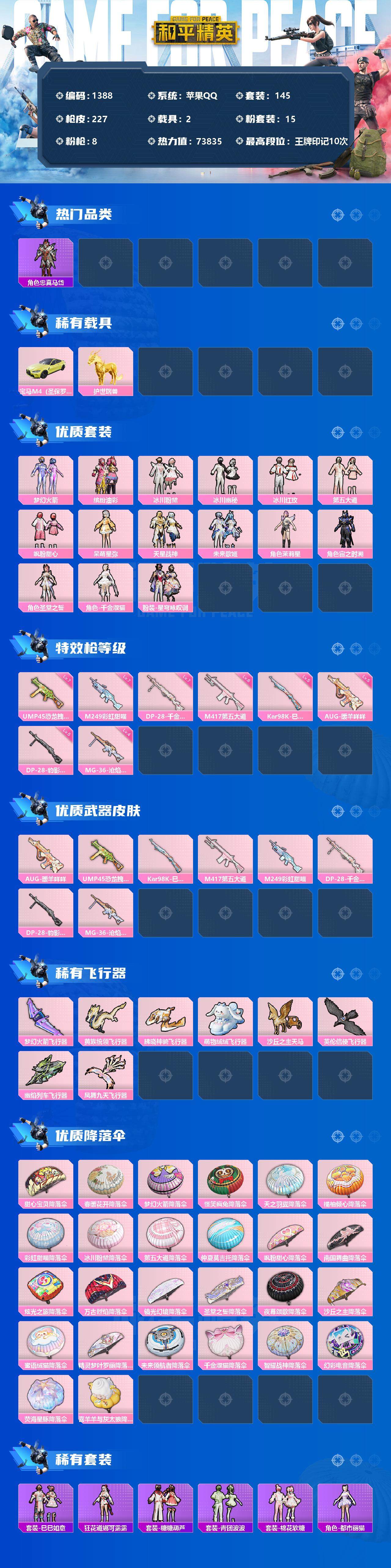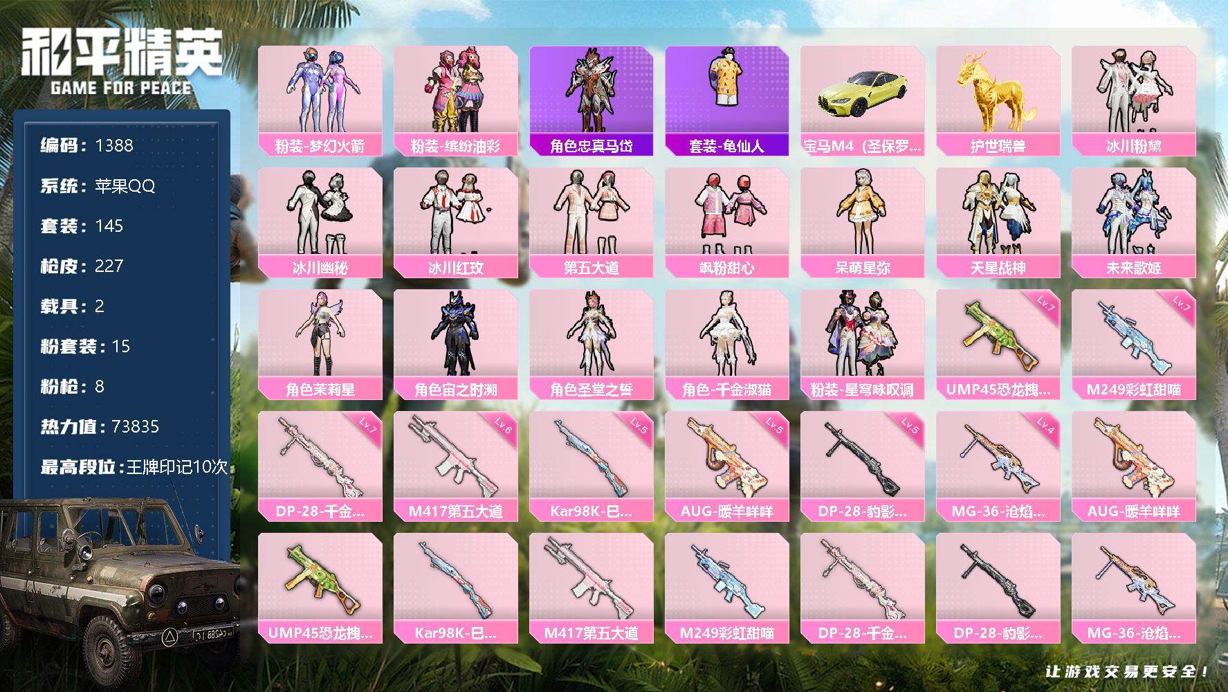 [13079628]苹果 手Q-15粉装-8特效枪-2载具-8粉色飞行器-73835热力值-10王牌印记-145套装-227枪皮 【热门品类】:粉装-梦幻火箭,粉装-缤纷油彩,角色-忠真马岱,套装-龟仙人 【粉色载具】:宝马M4(圣保罗黄),护世瑞兽 【粉色套装】:粉装-梦幻火箭,粉装-缤纷油彩,粉装-冰川粉黛,粉装-冰川幽秘,粉装-冰川红玫,粉装-第五大道,粉装-飒粉甜心,角色-呆萌星弥,粉装-天星战神,粉装-未来歌姬,角色-茉莉星,角色-宙之时溯,角色-圣堂之誓,角色-千金淑猫,粉装-星穹咏叹调 【粉色枪皮等级】:AUG-暖羊咩咩(五级),UMP45-恐龙拽拽(七级),Kar98K-巳巳如意(五级),M417-第五大道(六级),M249-彩虹甜喵(七级),DP-28-千金淑猫(七级),DP-28-豹影疾电(五级),MG-36-沧焰双生(四级) 【粉色枪皮】:AUG-暖羊咩咩,UMP45-恐龙拽拽,Kar98K-巳巳如意,M417-第五大道,M249-彩虹甜喵,DP-28-千金淑猫,DP-28-豹影疾电,MG-36-沧焰双生 【粉色飞行器】:梦幻火箭飞行器,黄族统领飞行器,拂晓神骑飞行器,萌物绒绒飞行器,沙丘之主天马,英伦信使飞行器,幽焰列车飞行器,凤舞九天飞行器 【粉色降落伞】:甜心宝贝降落伞,春暖花开降落伞,梦幻火箭降落伞,怪笑疯兔降落伞,天之羽翼降落伞,橘柚倾心降落伞,彩虹甜喵降落伞,冰川粉黛降落伞,第五大道降落伞,仲夏莫吉托降落伞,飒粉甜心降落伞,南国舞曲降落伞,炫光之旅降落伞,万古烈焰降落伞,镜光幻境降落伞,圣堂之誓降落伞,夜幕颂歌降落伞,沙丘之主降落伞,蜜语绒猫降落伞,精灵梦叶罗丽降落伞,未来领航者降落伞,千金淑猫降落伞,智耀战神降落伞,幻彩电音降落伞,荧海星豚降落伞,喜羊羊与灰太狼降落伞 【稀有套装】:套装-龟仙人,套装-巳巳如意,角色-狂花道·娜可露露,套装-糖糖葫芦,套装-青团波波,套装-棉花软糖,角色-都市丽猫,角色-摩登魅猫,角色-许七安,角色-俏兔智灵,套装-燕燕于飞,套装-鱼渊荷华,角色-海琴烟,套装-晶灵使者,套装-晶辉守护,角色-蜜桃派对,套装-粉恋花,套装-紫幽梦,套装-蓝冰羽,角色-猎影月神,套装-星渊小夜曲,套装-霓虹热舞,套装-彩虹兔,套装-云朵鹅,套装-雪绒豹,套装-蓝海鲸歌,套装-朱霞炽焰,套装-凌霄紫焰,套装-擎苍青焰 【稀有枪皮】:AK