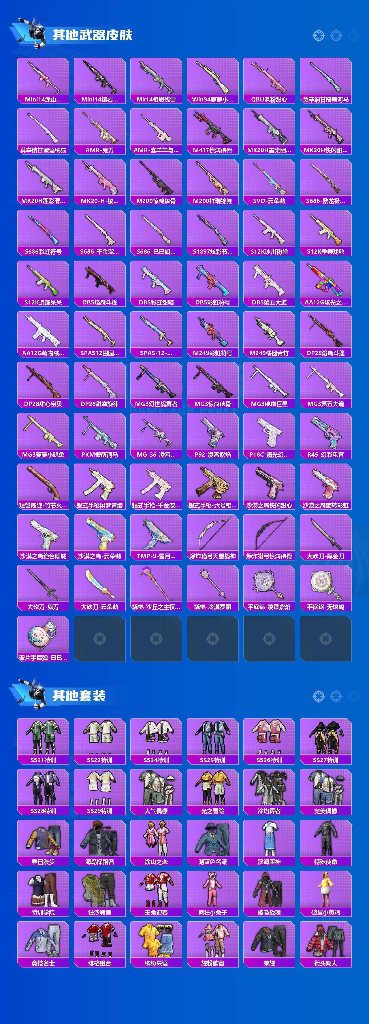- [12688504]安卓 手Q-无敌战神框-8粉装-7特效枪-2载具-1粉色飞行器-97133热力值-24王牌印记-194套装-299枪皮 【热门品类】:粉装-梦幻火箭,套装-赤蝎幽灵,套装-奇异狩猎者,套装-龟仙人,套装-暗影哥特,套装-粉红小猪,熔岩游骑兵面罩,熔岩游骑兵连帽夹克 【粉色载具】:阿斯顿马丁DBS(红),双人摩托-梦幻火箭 【粉色套装】:粉装-天使彩虹糖,粉装-火曜朱雀,粉装-梦幻火箭,粉装-绚金战神,粉装-银刃赛罗,粉装-香水柠檬,粉装-金丰海韵,角色-异瞳寒姬 【粉色枪皮等级】:AKM-炫紫旋律(七级),SCAR-L-梦幻火箭(七级),M416-五爪金龙(七级),GROZA-香水柠檬(七级),M762-激战未来(五级),Kar98K-巳巳如意(五级),DP-28-豹影疾电(五级) 【粉色枪皮】:AKM-炫紫旋律,SCAR-L-梦幻火箭,M416-五爪金龙,GROZA-香水柠檬,M762-激战未来,Kar98K-巳巳如意,DP-28-豹影疾电 【粉色飞行器】:梦幻火箭飞行器 【粉色降落伞】:梦幻火箭降落伞,神秘黑猫降落伞,四圣焕新降落伞,荧光虫舞降落伞,银刃赛罗降落伞,香水柠檬降落伞,星之彼岸降落伞,橘柚倾心降落伞,垂柳戏鸭降落伞,创世·救赎降落伞,星梦奇缘降落伞,千金淑猫降落伞,绯穹魔姬降落伞,无垠阁降落伞,异瞳寒姬降落伞 【稀有套装】:套装-龟仙人,套装-巳巳如意,套装-雏菊兔兔,套装-萝兰蝴蝶,套装-小熊娃娃,角色-拉斐尔,套装-糖糖葫芦,套装-青团波波,套装-棉花软糖,角色-摩登魅猫,套装-燕燕于飞,套装-鱼渊荷华,角色-绛羽幽主,套装-朱霞炽焰,套装-凌霄紫焰,角色-紫俏灵猫 【稀有枪皮】:AKM-四圣焕新,AKM-夜灯,AKM-奇异狩猎者,AKM-生命誓言,AKM-破晓战魂,AKM-萌趣颜团子,AKM-虎虎生威,AKM-阿狸红,AKM-霓虹街区,AKM-龙的传人,M16A4-幻世战舞者,M16A4-甜心亚梦,M16A4-红色方程式,M16A4-千金淑猫,SCAR-L-怪兽之王,SCAR-L-暗夜玫瑰,SCAR-L-未来战士,SCAR-L-玉兔迎春,SCAR-L-王牌四分卫,SCAR-L-红色方程式,SCAR-L-黄金龙骨,M416-仓鼠灰灰,M416-夜灯,M416-滑板小狐,M416-糯团青竹,M416-红色方程式,M416-蓝色火焰,GROZA-异