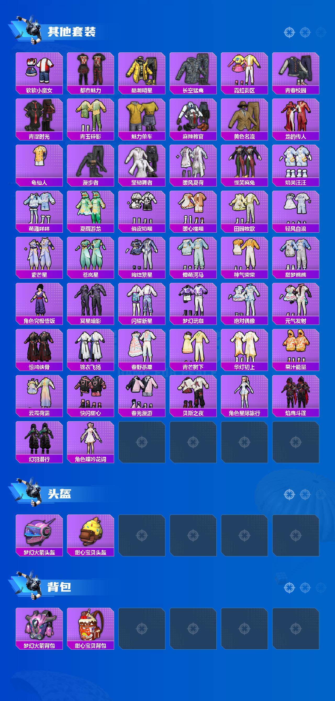 【稀有套装】:套装-龟仙人,套装-巳巳如意,角色-狂花道·娜可露露,套装-糖糖葫芦,套装-青团波波,套装-棉花软糖,角色-都市丽猫,角色-摩登魅猫,角色-许七安,角色-俏兔智灵,套装-燕燕于飞,套装-鱼渊荷华,角色-海琴烟,套装-晶灵使者,套装-晶辉守护,角色-蜜桃派对,套装-粉恋花,套装-紫幽梦,套装-蓝冰羽,角色-猎影月神,套装-星渊小夜曲,套装-霓虹热舞,套装-彩虹兔,套装-云朵鹅,套装-雪绒豹,套装-蓝海鲸歌,套装-朱霞炽焰,套装-凌霄紫焰,套装-擎苍青焰