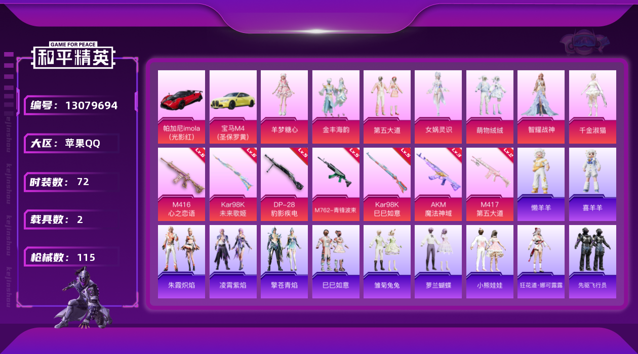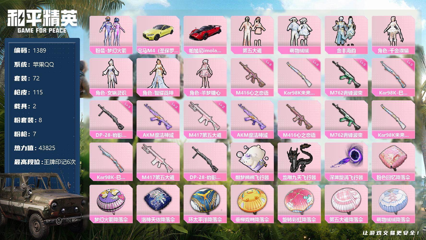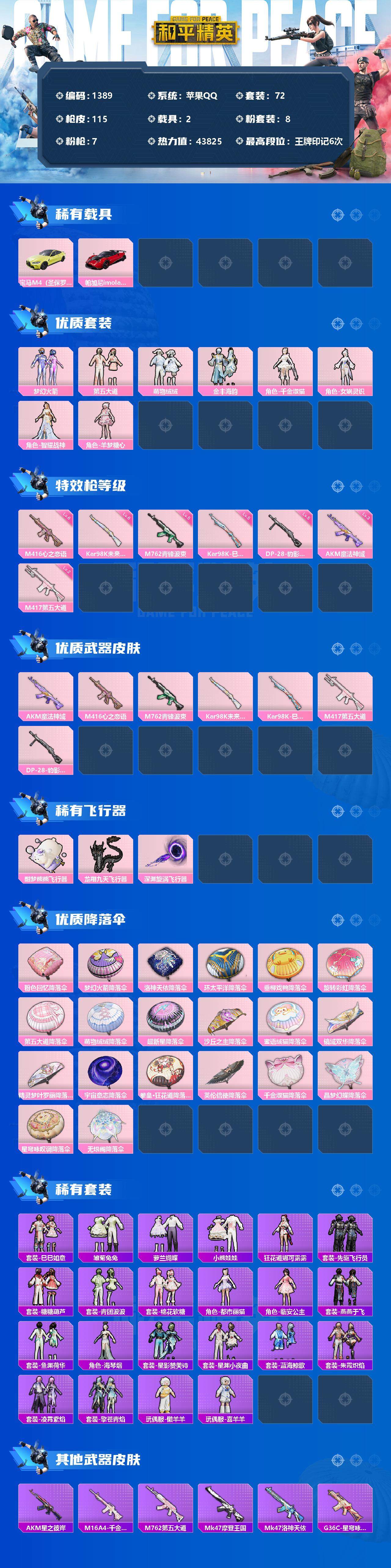 [13079694]苹果 手Q-8粉装-7特效枪-2载具-4粉色飞行器-43825热力值-6王牌印记-72套装-115枪皮 【热门品类】:粉装-梦幻火箭 【粉色载具】:宝马M4(圣保罗黄),帕加尼imola(光影红) 【粉色套装】:粉装-梦幻火箭,粉装-第五大道,粉装-萌物绒绒,粉装-金丰海韵,角色-千金淑猫,角色-女娲灵识,角色-智耀战神,角色-羊梦糖心 【粉色枪皮等级】:AKM-魔法神域(三级),M416-心之恋语(六级),M762-青锋波束(五级),Kar98K-未来歌姬(六级),Kar98K-巳巳如意(五级),M417-第五大道(二级),DP-28-豹影疾电(五级) 【粉色枪皮】:AKM-魔法神域,M416-心之恋语,M762-青锋波束,Kar98K-未来歌姬,Kar98K-巳巳如意,M417-第五大道,DP-28-豹影疾电 【粉色飞行器】:酣梦熊熊飞行器,龙翔九天飞行器,深渊漩涡飞行器 【粉色降落伞】:粉色回忆降落伞,梦幻火箭降落伞,洛神天依降落伞,环太平洋降落伞,垂柳戏鸭降落伞,旋转彩虹降落伞,第五大道降落伞,萌物绒绒降落伞,超新星降落伞,沙丘之主降落伞,蜜语绒猫降落伞,镜域双华降落伞,精灵梦叶罗丽降落伞,宇宙意志降落伞,拳皇·狂花道降落伞,英伦信使降落伞,千金淑猫降落伞,晶梦幻蝶降落伞,星穹咏叹调降落伞,无垠阁降落伞 【稀有套装】:套装-巳巳如意,套装-雏菊兔兔,套装-萝兰蝴蝶,套装-小熊娃娃,角色-狂花道·娜可露露,套装-先驱飞行员,套装-糖糖葫芦,套装-青团波波,套装-棉花软糖,角色-都市丽猫,角色-临安公主,套装-燕燕于飞,套装-鱼渊荷华,角色-海琴烟,套装-星影赞美诗,套装-星渊小夜曲,套装-蓝海鲸歌,套装-朱霞炽焰,套装-凌霄紫焰,套装-擎苍青焰,玩偶服-懒羊羊,玩偶服-喜羊羊 【稀有枪皮】:AKM-星之彼岸,M16A4-千金淑猫,M762-第五大道,Mk47-摩登王国,Mk47-洛神天依,G36C-星穹咏叹调,AC-VAL-闲梦青缨,AC-VAL-六号稻草人,蜜獾-天降萌叽,ARX-凌霄紫焰,UZI-天降萌叽,UMP45-炫光之旅,Vector-生命誓言,汤姆逊-智耀战神,AKS-74U-鬼刀,JS9-凌霄紫焰,P90-甜蜜旋律,P90-金蛇镇世,P90-巳巳如意,Kar98K-星穹咏叹调,M24-拂晓神骑,M24-青空秋雨,M24-奇异狩猎者,SKS-炫彩