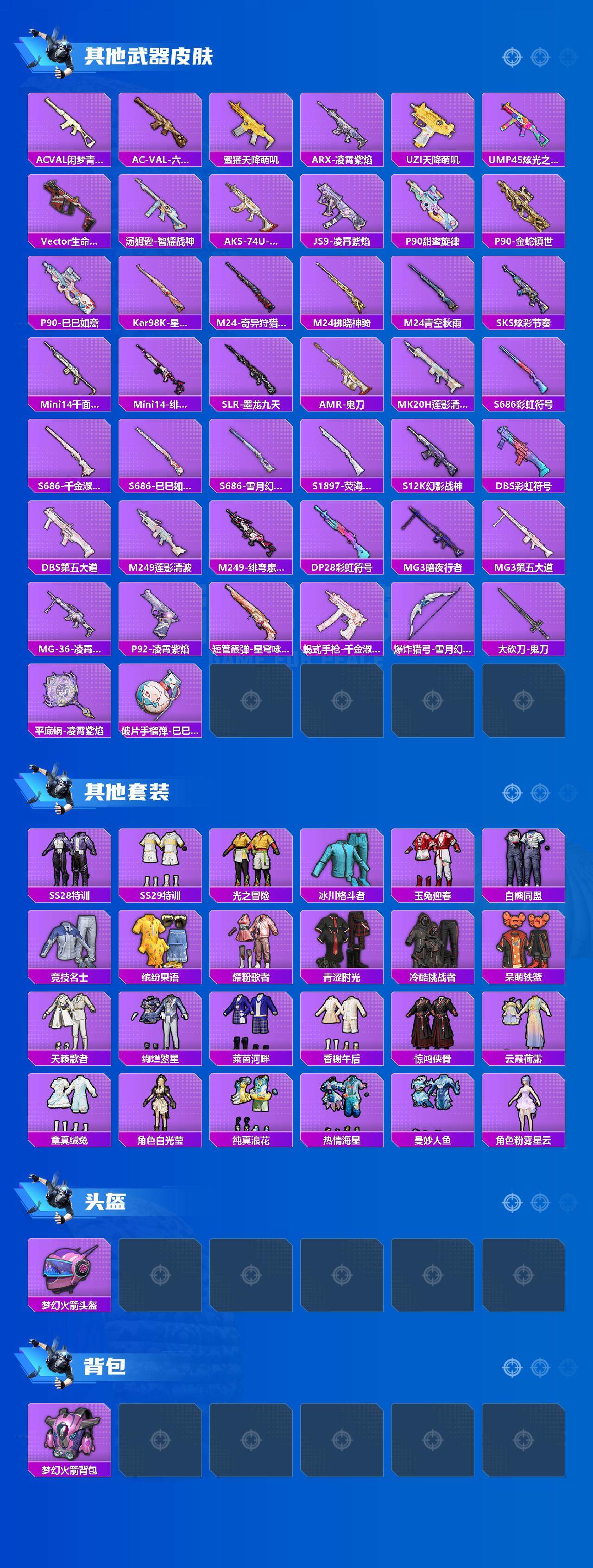 - [11864139]6粉装 9特效枪 13印记 可二次 可修改实名 战神框 身法装备:都市猎人,Mark.06(新蓝螳螂) 优质装备:都市猎人,AKM炫紫旋律,M416心之恋语,梦幻火箭(新101)(新火箭少女101粉色套装),放客神游,智能音符,SCAR-L纯梦嫁纱,SCAR-L-锦绣绵绵,七级M416-心之恋语,M416电玩时刻,UMP45量子极限,AKM魔法神域,星穹咏叹调,Kar98K-巳巳如意 热门装扮:呆萌星弥,圣堂之誓,胖达团团,迅捷狂鲨,鹰眼刺客,呆萌铁蟹,深海小丑鱼,都市猎人 稀有枪皮:DP-28-豹影疾电 五级特效枪:五级UMP45-量子极限,五级Kar98K-伏魔团,五级Kar98K-巳巳如意,五级SCAR-L-纯梦嫁纱,五级SCAR-L-锦绣绵绵 四级特效枪:四级M416-电玩时刻 三级特效枪:三级AKM-魔法神域,三级DP-28-豹影疾电 紫色装扮:SS22特训,SS23特训,幻彩翩翩,妙红点点,娇憨猪猪,萌趣咩咩,SS21特训,SS31特训套装,冰川特警,冷焰舞者,旭日情侣,SS30特训套装,SS33特训套装,青涩时光,SS20特训,萌趣颜团子,特种颜团子,猎梦纪元,飞驰魅影,音速流光,极速竞梦,SS19特训,粉团憨憨,甜心亚梦,虚音幻奏,瑞龙福将,团圆交子,SS17特训,极乐追光,异彩先驱,SS18特训,都市漫游者,野性战心,长空猛禽,雪鹰学院,霓虹极客,霓虹街区,缤纷果语,耀眼新星,荣耀,荧惑魅影,蓝彩潮人,虎虎生威吉莉,街头潮人,魅力单车,鹤鸣,麻辣教官,黄色名流,黄色运动,龙的传人,龟仙人,冰河战士,龙魂突击队,蝶变,极地朋克,极速红龙,格斗先锋,沙漠兵团,海岛探路者,涂山之恋,滨海假日,幻影武者,坚韧舞者,夏日音浪,幻世战舞者,怒火燎原,探宝勇士,湖蓝色名流,滨海厨神,绮丽涂鸦,白色伏地魔,破晓战魂,破蛋小黄鸡,福星高照,空岛之星,空投萌叽,红色运动,甜蜜熊情侣,炫蓝之夏,牛气满满,猛禽,狂沙舞者,雏菊兔兔,萝兰蝴蝶,SS29特训,拉斐尔,尼罗河传说,纯真浪花,热情海星,曼妙人鱼,SS28特训,粉雾星云,Mark.06(新蓝螳螂),火种守护者(套装-火种守卫者),冰公主,鱼渊荷华,玉兔迎春,燕燕于飞,巳巳如意,竞技名士,街头风暴,情公主,惊鸿侠骨,甜梦熊熊,神气柴柴,懵萌河马,SS24特训(SS24特训套装),萤火魅影(套装-荧惑魅影),S