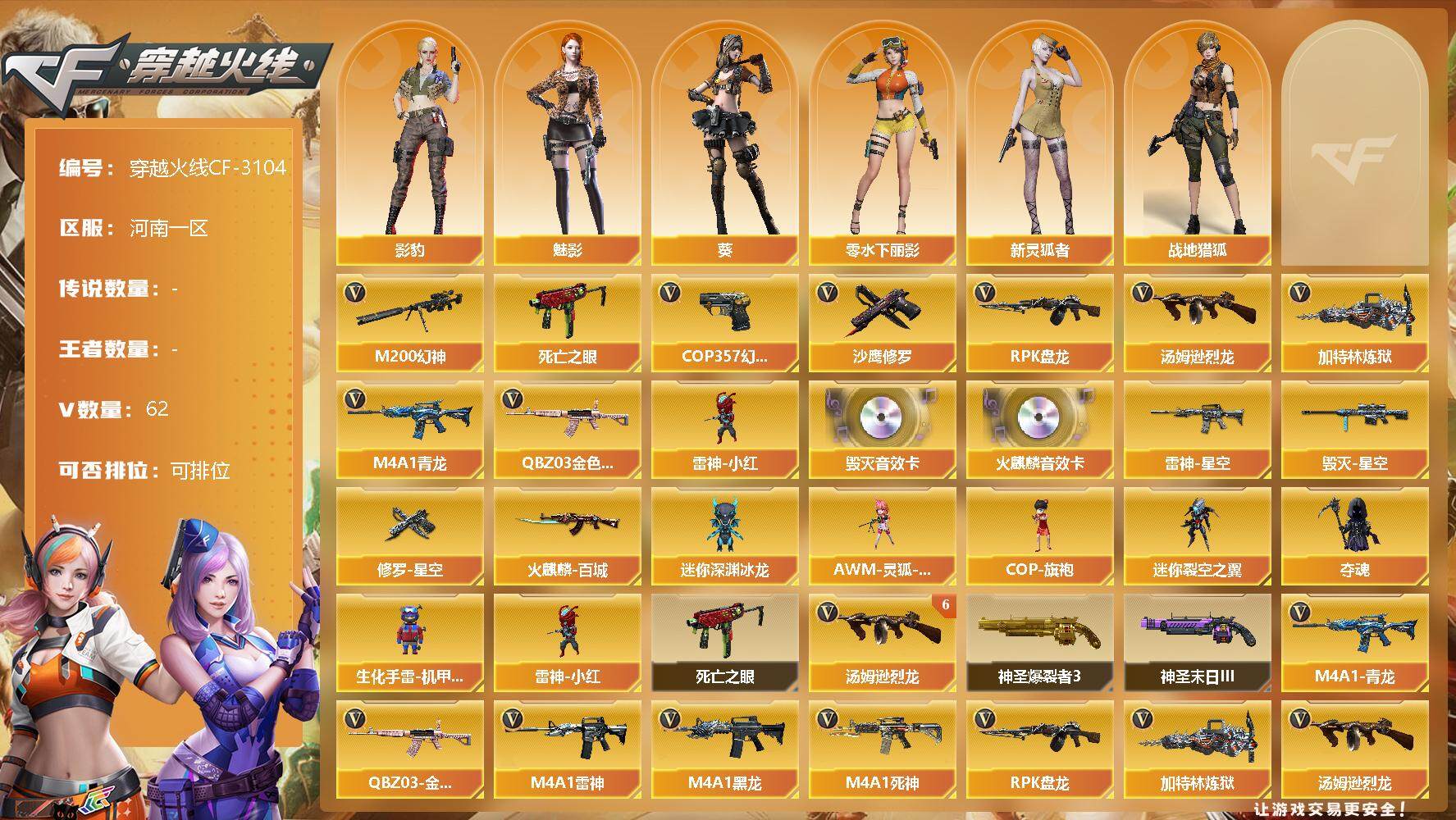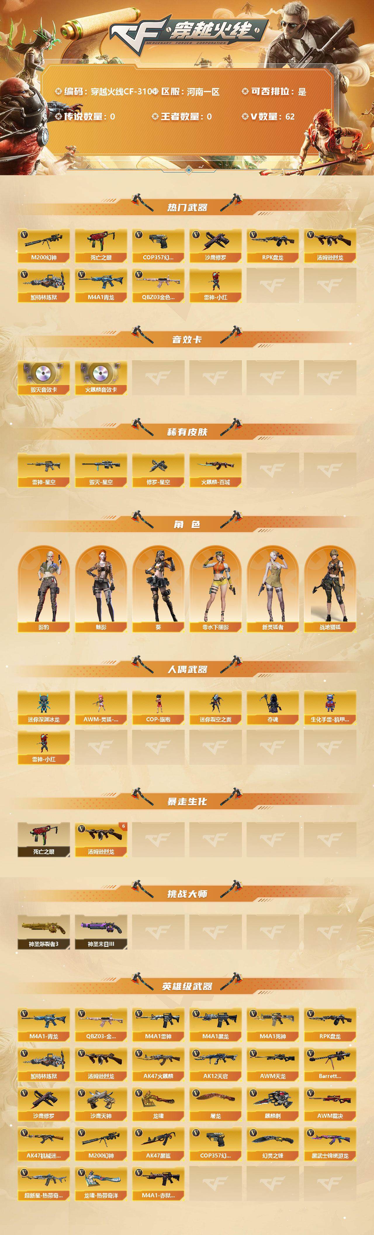 [13079899]河南一区-62V-0王者-0炫金 【热门武器】:QBZ03-金色蔷薇,M4A1-青龙,M200-幻神,死亡之眼,汤姆逊-烈龙*6,RPK-盘龙*2,加特林-炼狱*2,雷神-小红,COP 357-幻灵,沙鹰-修罗*3 【音效卡】:AK47-火麒麟音效卡,Barrett-毁灭音效卡,Barrett-碧霄极光音效卡 【皮肤】:雷神-星空,火麒麟-雷神,火麒麟-百城,毁灭-星空,毁灭-秦师 皮肤,修罗-星空 【角色】:葵,魅影,影豹,战地猎狐,零-水下丽影,新灵狐者 【人偶武器】:雷神-小红,AWM-灵狐-15周年嘉年华*2,COP-旗袍,迷你深渊冰龙,迷你裂空之翼,夺魂,生化手雷-机甲核心 【暴走生化】:死亡之眼 【挑战大师】:神圣爆裂者III,神圣爆裂者-末日III 【英雄级武器】:AK47-火麒麟,M4A1-黑龙,M4A1-雷神*2,M4A1-死神,AK12-天启,AK47-机械迷城,AK47-黑鲨,M4A1-青龙,黑武士-锦绣游龙,超新星-热带奇洋,QBZ03-金色蔷薇,AWM-天龙,Barrett-毁灭*2,AWM-裁决,M200-幻神,Barrett-金色蔷薇,RPK-盘龙*2,加特林-炼狱*2,汤姆逊-烈龙*6,沙鹰-修罗*3,沙鹰-天神*2,COP 357-幻灵,屠龙*2,龙啸,麒麟刺,幻灵之锋,龙啸-热带奇洋,高爆手雷-幻灵*6,手雷-热带奇洋,闪光弹-幻灵*5,烟雾弹-幻灵*5,M4A1-赤狱骑士,Barrett-碧霄极光 【特殊枪械】:6烈龙,2盘龙,2炼狱