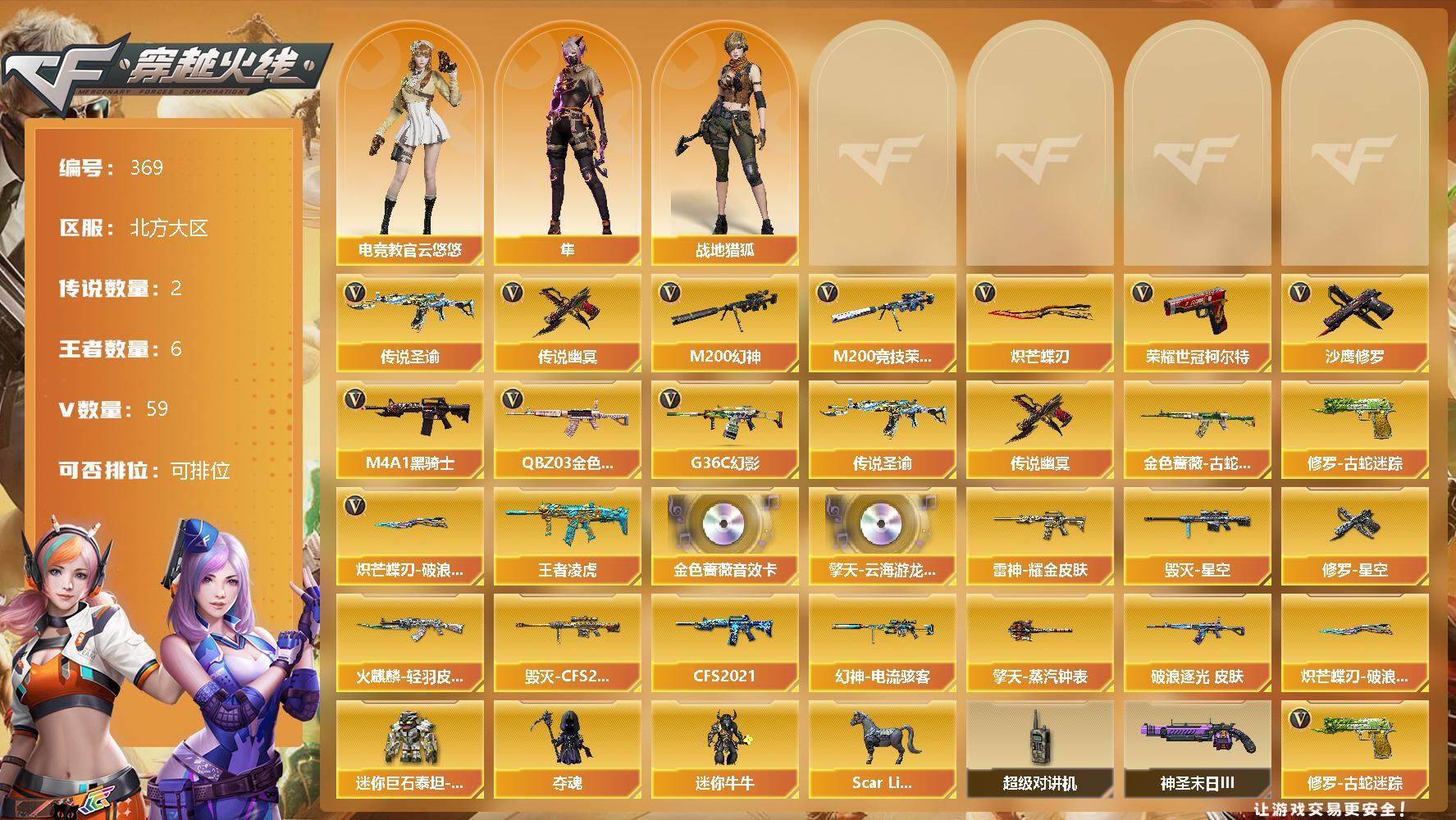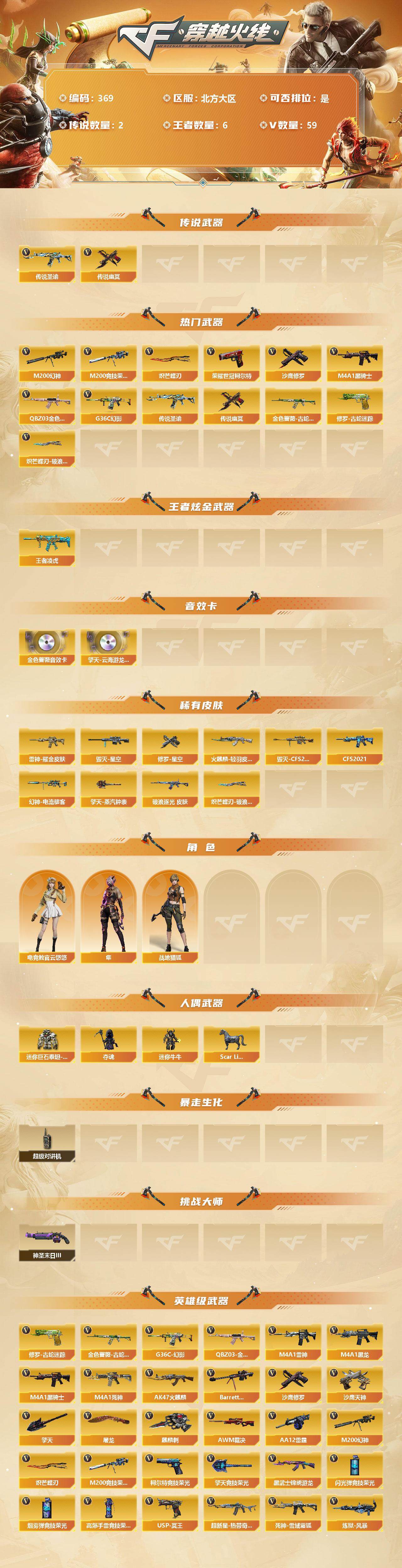 [13080513]北方大区-59V-6王者-0炫金 【传说武器】:传说圣谕,传说幽冥 【热门武器】:传说圣谕,传说幽冥,G36C-幻影,QBZ03-金色蔷薇,M200-幻神*2,金色蔷薇-古蛇迷踪,修罗-古蛇迷踪,M200-竞技荣光,荣耀世冠-柯尔特,M4A1-黑骑士,沙鹰-修罗,炽芒蝶刃,炽芒蝶刃-破浪逐光 皮肤 【王者炫金武器】:王者凌虎 【音效卡】:擎天-云海游龙音效卡,QBZ03-金色蔷薇音效卡,炼狱-百战金芒-庆典舞曲音效卡,死神-雪域霜狐-怀旧音效卡 【皮肤】:幻神-电流骇客 皮肤,金色蔷薇-破浪逐光 皮肤,裁决-流光秘银,裁决-运输船 皮肤,雷神-耀金皮肤,雷神-CFS十周年纪念版 皮肤,雷神-化蛇 皮肤,雷神-春花弄影 皮肤,M4A1-再燃火线,火麒麟-轻羽皮肤,火麒麟-新春kwai乐,毁灭-星空,毁灭-CFS2020,毁灭-百城浙江 皮肤,毁灭-秦师 皮肤,黑骑士-CFS2021,烈火-动感闪耀 皮肤,修罗-星空,屠龙-破浪逐光 皮肤,屠龙-惊鸿 皮肤,轻型军用手斧-再燃火线,擎天-蒸汽钟表 皮肤,擎天-梧桐 皮肤,麒麟刺-甜蜜糖果 皮肤,麒麟刺-月皮肤,炽芒蝶刃-破浪逐光 皮肤 【角色】:电竞教官-云悠悠,隼,战地猎狐,蛇隐宗,雪域霜狐 【人偶武器】:Scar Light-马枪,迷你巨石泰坦-魔花研究所,夺魂,迷你牛牛 【暴走生化】:超级对讲机 【挑战大师】:神圣爆裂者-末日III 【英雄级武器】:AK47-火麒麟,M4A1-黑龙,M4A1-雷神,M4A1-黑骑士,M4A1-死神,G36C-幻影,黑武士-锦绣游龙,超新星-热带奇洋,金色蔷薇-古蛇迷踪,死神-雪域霜狐,QBZ03-金色蔷薇,Barrett-毁灭,AWM-裁决,M200-幻神*2,M200-竞技荣光,王者风神-觉醒版,炼狱-百战金芒,炼狱-风暴,AA-12-雷霆,沙鹰-修罗,沙鹰-天神,荣耀世冠-柯尔特,柯尔特-竞技荣光*2,修罗-古蛇迷踪,USP-冥王,屠龙*3,擎天*3,麒麟刺*2,擎天-竞技荣光,炽芒蝶刃,龙啸-热带奇洋,麒麟刺-百战金芒,高爆手雷-竞技荣光*7,高爆手雷-云龙*2,手雷-热带奇洋,高爆手雷-古蛇迷踪,高爆手雷-雷霆王者,闪光弹-竞技荣光*7,烟雾弹-竞技荣光*2,烟雾弹-古蛇迷踪,M4A1-赤狱骑士 【特殊枪械】:1黑骑士