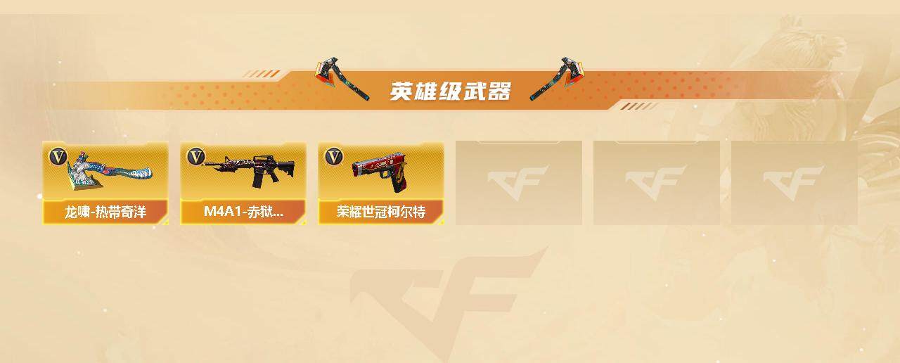 【英雄级武器】:AK47-火麒麟,M4A1-黑龙,M4A1-雷神,M4A1-黑骑士,M4A1-死神,G36C-幻影,黑武士-锦绣游龙,超新星-热带奇洋,金色蔷薇-古蛇迷踪,死神-雪域霜狐,QBZ03-金色蔷薇,Barrett-毁灭,AWM-裁决,M200-幻神*2,M200-竞技荣光,王者风神-觉醒版,炼狱-百战金芒,炼狱-风暴,AA-12-雷霆,沙鹰-修罗,沙鹰-天神,荣耀世冠-柯尔特,柯尔特-竞技荣光*2,修罗-古蛇迷踪,USP-冥王,屠龙*3,擎天*3,麒麟刺*2,擎天-竞技荣光,炽芒蝶刃,龙啸-热带奇洋,麒麟刺-百战金芒,高爆手雷-竞技荣光*7,高爆手雷-云龙*2,手雷-热带奇洋,高爆手雷-古蛇迷踪,高爆手雷-雷霆王者,闪光弹-竞技荣光*7,烟雾弹-竞技荣光*2,烟雾弹-古蛇迷踪,M4A1-赤狱骑士