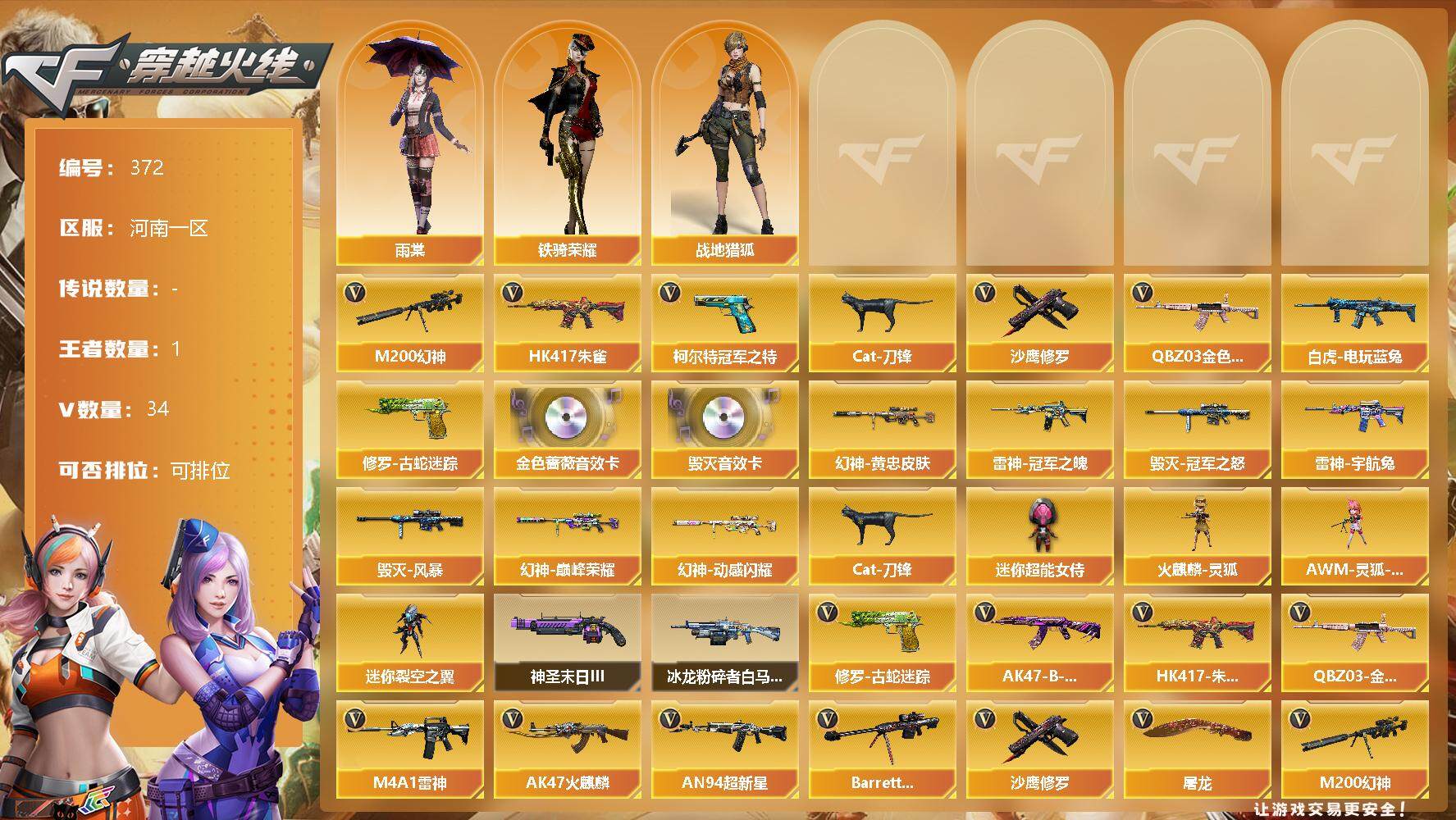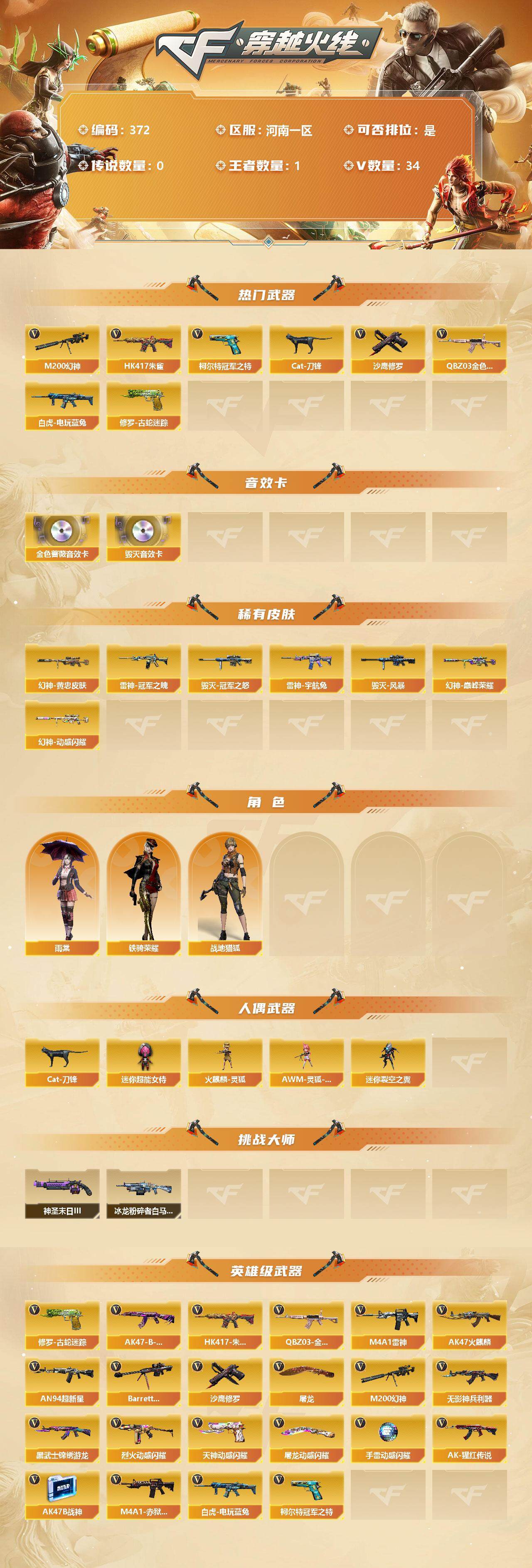 [13080667]河南一区-34V-1王者-0炫金 【热门武器】:QBZ03-金色蔷薇,HK417-朱雀,M200-幻神*2,修罗-古蛇迷踪,白虎-电玩蓝兔,柯尔特-冠军之特,Cat-刀锋,沙鹰-修罗 【音效卡】:Barrett-毁灭音效卡,QBZ03-金色蔷薇音效卡 【皮肤】:M200-幻神-黄忠皮肤,幻神-巅峰荣耀,幻神-动感闪耀 皮肤,雷神-冠军之魄,雷神-宇航兔皮肤,雷神-源计划2.0专属 皮肤,毁灭-冠军之怒,毁灭-风暴,战神-粉色甜心皮肤*2,战神-流金岁月皮肤,AK47-B-常胜将军-孙权*3,修罗-15周年嘉年华 皮肤 【角色】:雨棠,战地猎狐,蛇隐宗,乔伊教练,铁骑荣耀 【人偶武器】:火麒麟-灵狐,AWM-灵狐-15周年嘉年华,Cat-刀锋,迷你超能女侍,迷你裂空之翼 【挑战大师】:冰龙粉碎者-白马银枪*3,神圣爆裂者-末日III 【英雄级武器】:AK47-火麒麟,M4A1-雷神,AN94-超新星,HK417-朱雀,无影-神兵利器,黑武士-锦绣游龙,QBZ03-金色蔷薇,烈火-动感闪耀,AK-47-猩红传说,AK47-B-战神,AK47-B-常胜将军,王者白虎-觉醒版,白虎-电玩蓝兔,Barrett-毁灭,M200-幻神*2,沙鹰-修罗,柯尔特-冠军之特,天神-动感闪耀,修罗-古蛇迷踪,屠龙,屠龙-动感闪耀,高爆手雷-神工天巧*2,手雷-动感闪耀,高爆手雷-古蛇迷踪,闪光弹-神工天巧*2,烟雾弹-神工天巧*2,烟雾弹-古蛇迷踪,M4A1-赤狱骑士 【特殊枪械】: