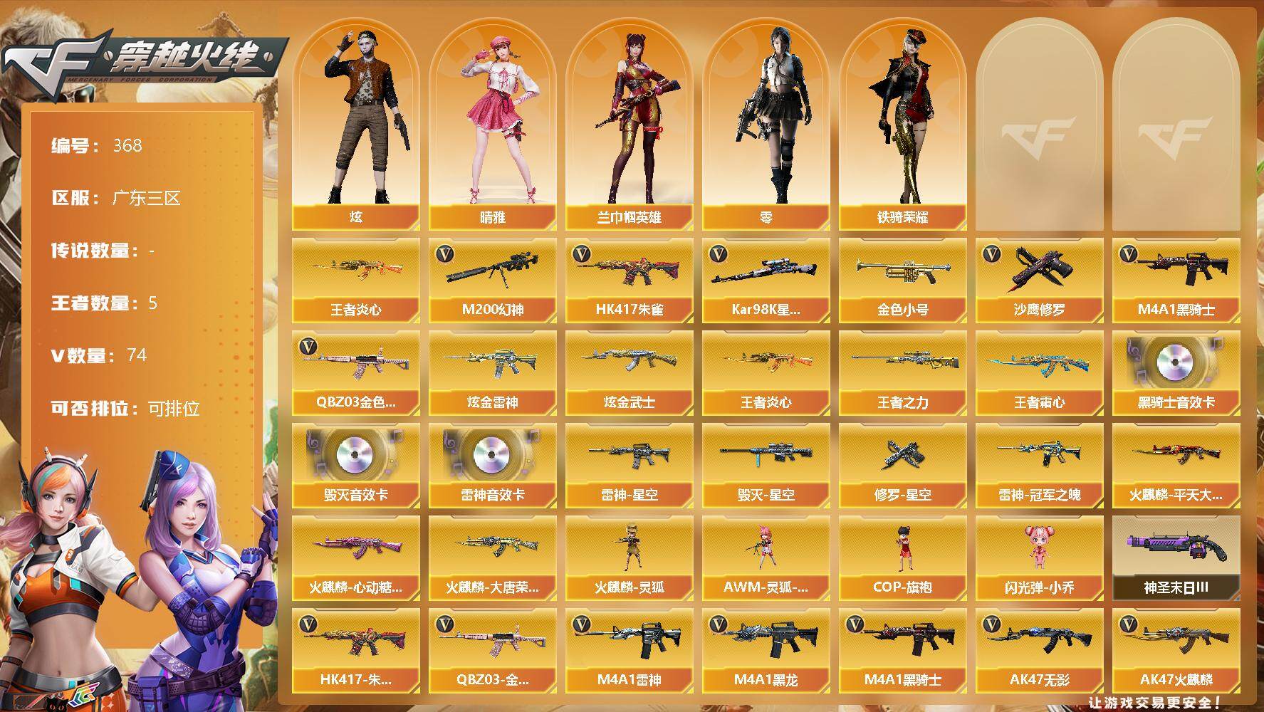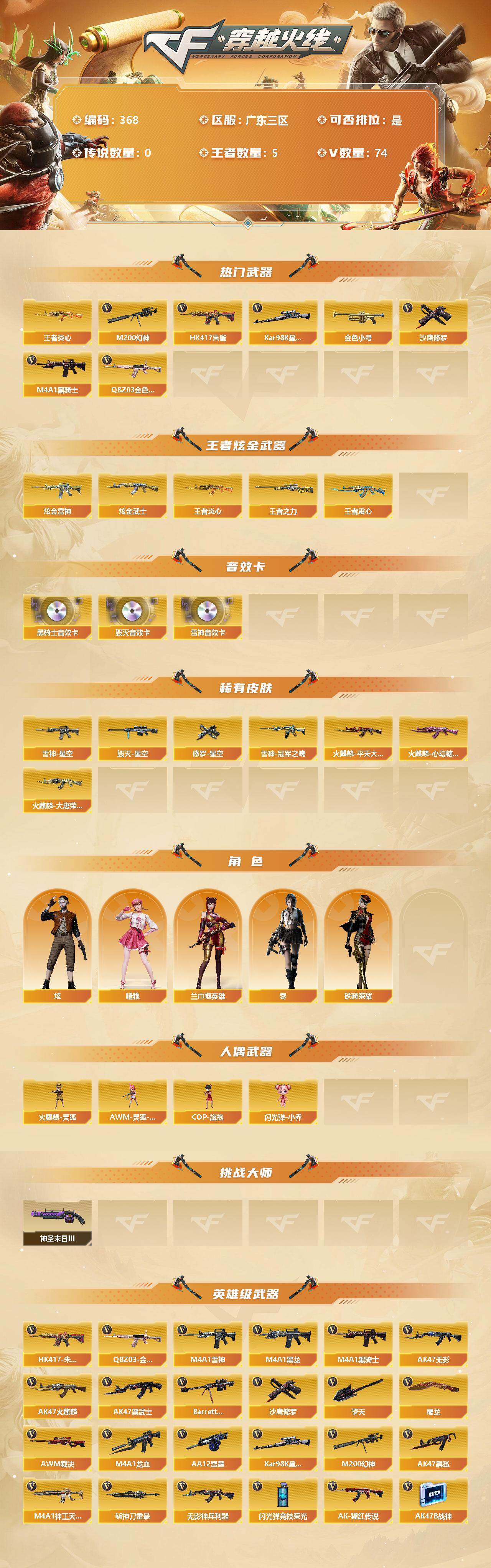 [13080635]广东三区-74V-5王者-2炫金 【热门武器】:QBZ03-金色蔷薇,HK417-朱雀,M200-幻神,王者炎心,Kar98K-星神,金色小号,M4A1-黑骑士*3,沙鹰-修罗*6 【王者炫金武器】:王者炎心,王者霜心,王者之力,炫金雷神,炫金武士 【音效卡】:M4A1-雷神音效卡,M4A1-黑骑士音效卡,Barrett-毁灭音效卡 【皮肤】:雷神-星空*2,雷神-冠军之魄,火麒麟-雷神,火麒麟-平天大圣,火麒麟-大唐荣光,火麒麟-心动糖果,毁灭-星空,黑龙-能量核心,战神-粉色甜心皮肤*2,战神-紫绶金章皮肤*2,修罗-星空 【角色】:零,炫,兰-巾帼英雄,晴雅,铁骑荣耀 【人偶武器】:火麒麟-灵狐,AWM-灵狐-15周年嘉年华,COP-旗袍,闪光弹-小乔 【挑战大师】:神圣爆裂者-末日III 【英雄级武器】:AK47-火麒麟*2,M4A1-黑龙,M4A1-雷神,M4A1-黑骑士*3,AK47-无影,AK47-黑武士,AK47-黑鲨,M4A1-龙血,HK417-朱雀,M4A1-神工天巧,无影-神兵利器,QBZ03-金色蔷薇,王者之翼-觉醒版,王者之魄-觉醒版,AK-47-猩红传说*6,AK47-B-战神,Barrett-毁灭,AWM-裁决,M200-幻神,Kar98K-星神,Barrett-金色蔷薇,AA-12-雷霆,沙鹰-修罗*6,屠龙*2,擎天*3,斩神刀-雷暴,高爆手雷-雷霆*5,高爆手雷-雷暴*2,高爆手雷-神工天巧*3,闪光弹-雷霆*5,闪光弹-雷暴*2,闪光弹-竞技荣光,烟雾弹-雷霆*5,烟雾弹-雷暴*2 【特殊枪械】:3黑骑士