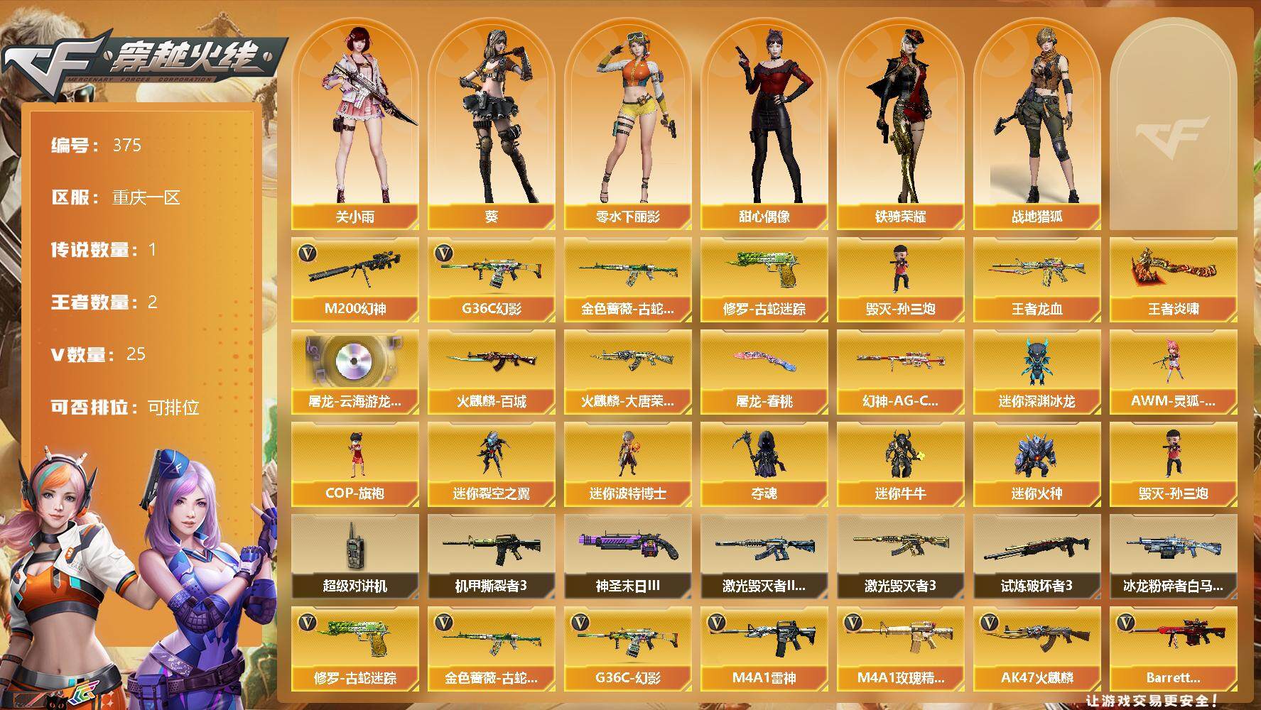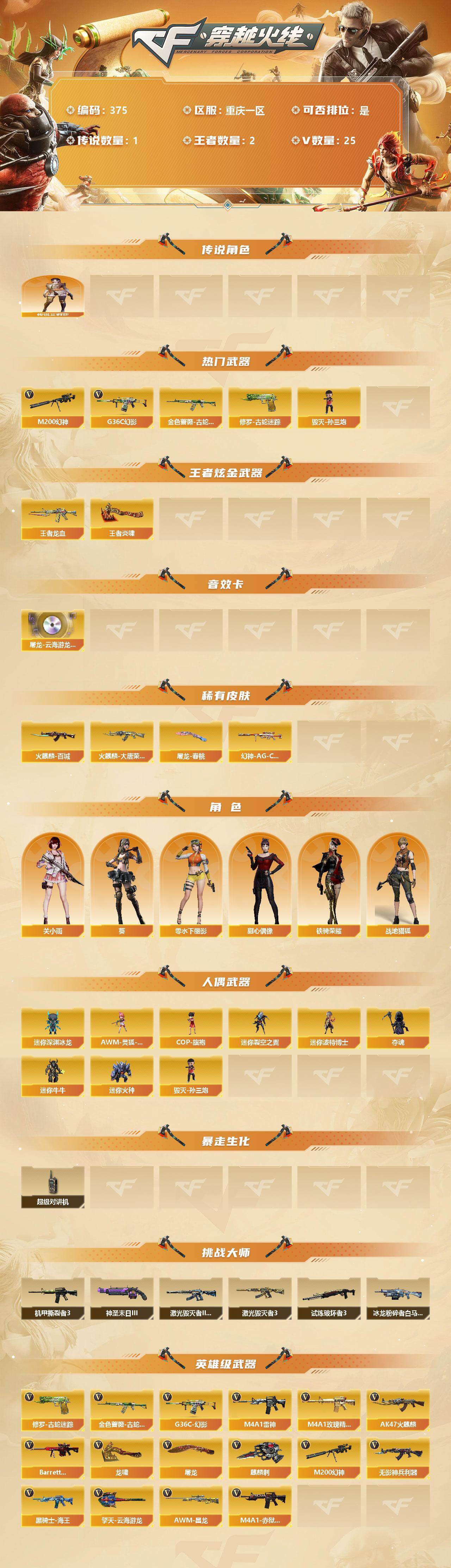 [13081000]重庆一区-25V-2王者-0炫金 【传说角色】:传说艾莉莎 【热门武器】:G36C-幻影,M200-幻神,金色蔷薇-古蛇迷踪,修罗-古蛇迷踪,毁灭-孙三炮 【王者炫金武器】:王者龙血,王者炎啸 【音效卡】:屠龙-云海游龙音效卡,白虎-盛典舞曲音效卡,炼狱-百战金芒-庆典舞曲音效卡,AWM-昌龙-怀旧音效卡 【皮肤】:幻神-AG-CFPL S24冠军 皮肤,雷神-源计划2.0专属 皮肤,雷神-化蛇 皮肤,M4A1-再燃火线,火麒麟-雷神,火麒麟-百城,火麒麟-大唐荣光,极光-能量核心,修罗-能量核心,屠龙-春桃 皮肤,屠龙-惊鸿 皮肤,龙啸-巅峰荣耀 皮肤,轻型军用手斧-再燃火线,麒麟刺-萌杀皮肤 【角色】:葵,关小雨,战地猎狐,蛇隐宗,乔伊教练,云海玲珑,零-水下丽影,铁骑荣耀,甜心偶像 【人偶武器】:毁灭-孙三炮,AWM-灵狐-15周年嘉年华,COP-旗袍,迷你深渊冰龙,迷你裂空之翼,迷你波特博士,夺魂,迷你牛牛,迷你火种*2 【暴走生化】:超级对讲机 【挑战大师】:冰龙粉碎者-白马银枪,激光毁灭者III-白马银枪,激光毁灭者III,机甲撕裂者III,试炼破坏者III,神圣爆裂者-末日III 【英雄级武器】:AK47-火麒麟,M4A1-雷神,无影-神兵利器,G36C-幻影,金色蔷薇-古蛇迷踪,M4A1-玫瑰精灵,黑骑士-海王,Barrett-极光,M200-幻神,炼狱-百战金芒,烈龙-云海游龙,修罗-古蛇迷踪,屠龙,龙啸,麒麟刺,擎天-云海游龙,麒麟刺-百战金芒,手雷-云海游龙,高爆手雷-古蛇迷踪,闪光弹-幻灵,烟雾弹-古蛇迷踪,M4A1-赤狱骑士,AWM-昌龙,Barrett-碧霄极光 【特殊枪械】: