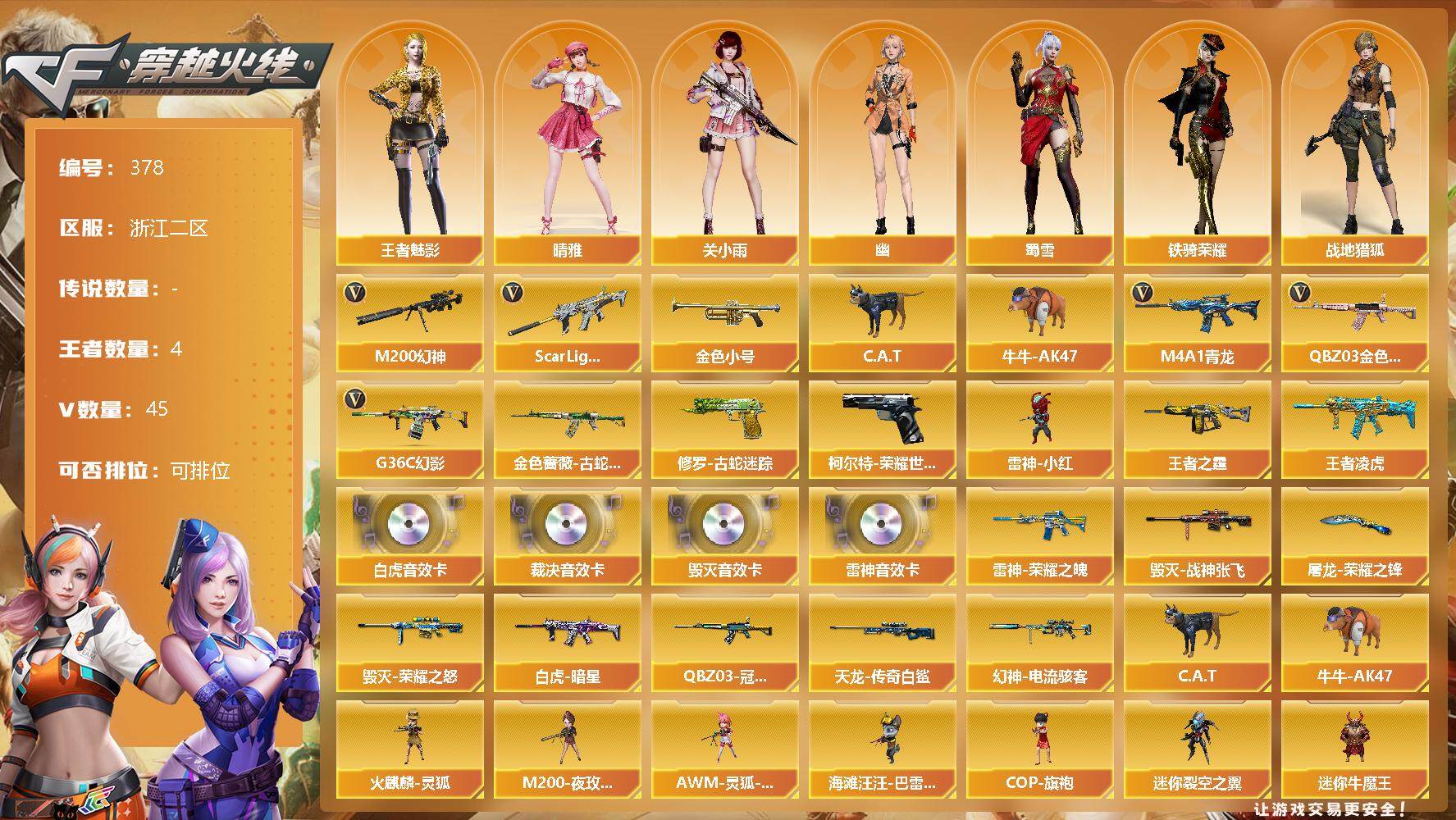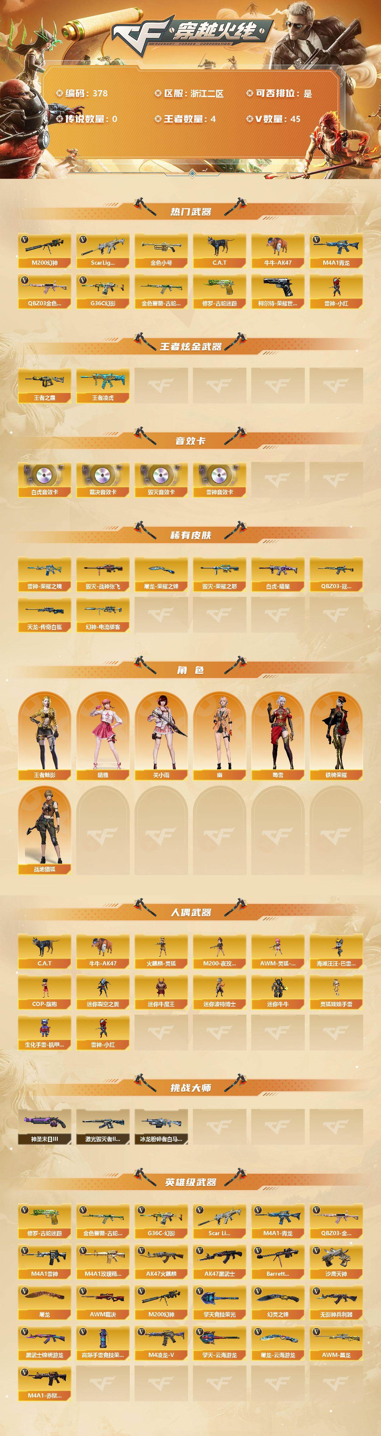[13081063]浙江二区-45V-4王者-0炫金 【热门武器】:G36C-幻影,QBZ03-金色蔷薇,Scar Light-白虎,M4A1-青龙,M200-幻神,柯尔特-荣耀世冠白鲨2023,金色蔷薇-古蛇迷踪,修罗-古蛇迷踪,金色小号,C.A.T,牛牛-AK47,雷神-小红 【王者炫金武器】:王者凌虎,王者之霆 【音效卡】:M4A1-雷神音效卡,Barrett-毁灭音效卡,AWM-裁决音效卡,Scar Light-白虎音效卡 【皮肤】:幻神-电流骇客 皮肤,Scar Light-白虎-暗星,QBZ03-冠军之薇,裁决-流光秘银,雷神-暗月,雷神-荣耀之魄,雷神-维纳斯皮肤,火麒麟-雷神,毁灭-荣耀之怒,毁灭-战神张飞,毁灭-黑曼巴 皮肤,毁灭-虹光风暴 皮肤,毁灭-定军扬威 皮肤,黑武士-典韦皮肤*2,天启-黯钢战甲 皮肤,AWM-天龙-传奇白鲨,屠龙-荣耀之锋*2,屠龙-惊鸿 皮肤 【角色】:关小雨,晴雅,战地猎狐,蛇隐宗,乔伊教练,修道士,云海玲珑,王者-魅影,幽,蜀雪,铁骑荣耀 【人偶武器】:雷神-小红,火麒麟-灵狐,AWM-灵狐-15周年嘉年华,海滩汪汪-巴雷特,M200-夜玫瑰,COP-旗袍,C.A.T,牛牛-AK47,迷你裂空之翼,迷你牛魔王,迷你波特博士*2,迷你牛牛*2,灵狐娃娃手雷,生化手雷-机甲核心 【挑战大师】:冰龙粉碎者-白马银枪,激光毁灭者III-白马银枪,神圣爆裂者-末日III 【英雄级武器】:AK47-火麒麟,M4A1-雷神*2,AK47-黑武士,M4A1-青龙,Scar Light-白虎,无影-神兵利器,G36C-幻影,黑武士-锦绣游龙,M4A1-凌龙-V,金色蔷薇-古蛇迷踪,M4A1-玫瑰精灵,QBZ03-金色蔷薇,王者之武-觉醒版,Barrett-毁灭,AWM-裁决,M200-幻神,烈龙-云海游龙,沙鹰-天神,柯尔特-荣耀世冠白鲨2023,修罗-古蛇迷踪,屠龙,幻灵之锋,擎天-竞技荣光,擎天-云海游龙,屠龙-云海游龙,高爆手雷-雷暴,高爆手雷-幻灵*3,高爆手雷-竞技荣光*2,手雷-云海游龙,高爆手雷-古蛇迷踪,高爆手雷-玄豹*2,闪光弹-雷暴,闪光弹-幻灵,闪光弹-玄豹*2,烟雾弹-幻灵,烟雾弹-古蛇迷踪,烟雾弹-玄豹*2,M4A1-赤狱骑士,AWM-昌龙 【特殊枪械】:1白虎
