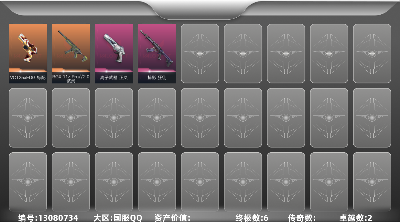 - [12290746]8橙皮 1金皮 2紫皮 35皮肤 16英雄 61卡面 530已用源晶 青铜 优质装备:幻影-紫阙金琅2.0,狂徒-日冕雄师,苍龙之刃,阿特拉斯指挥部,影钩,魔术火花 套装:滋滋X特工队 佩枪皮肤:标配-VCT25xEDG 步枪皮肤:狂徒-超时空卫队,狂徒-滋滋X特攻队 狙击枪皮肤:冥驹-滋滋X特攻队