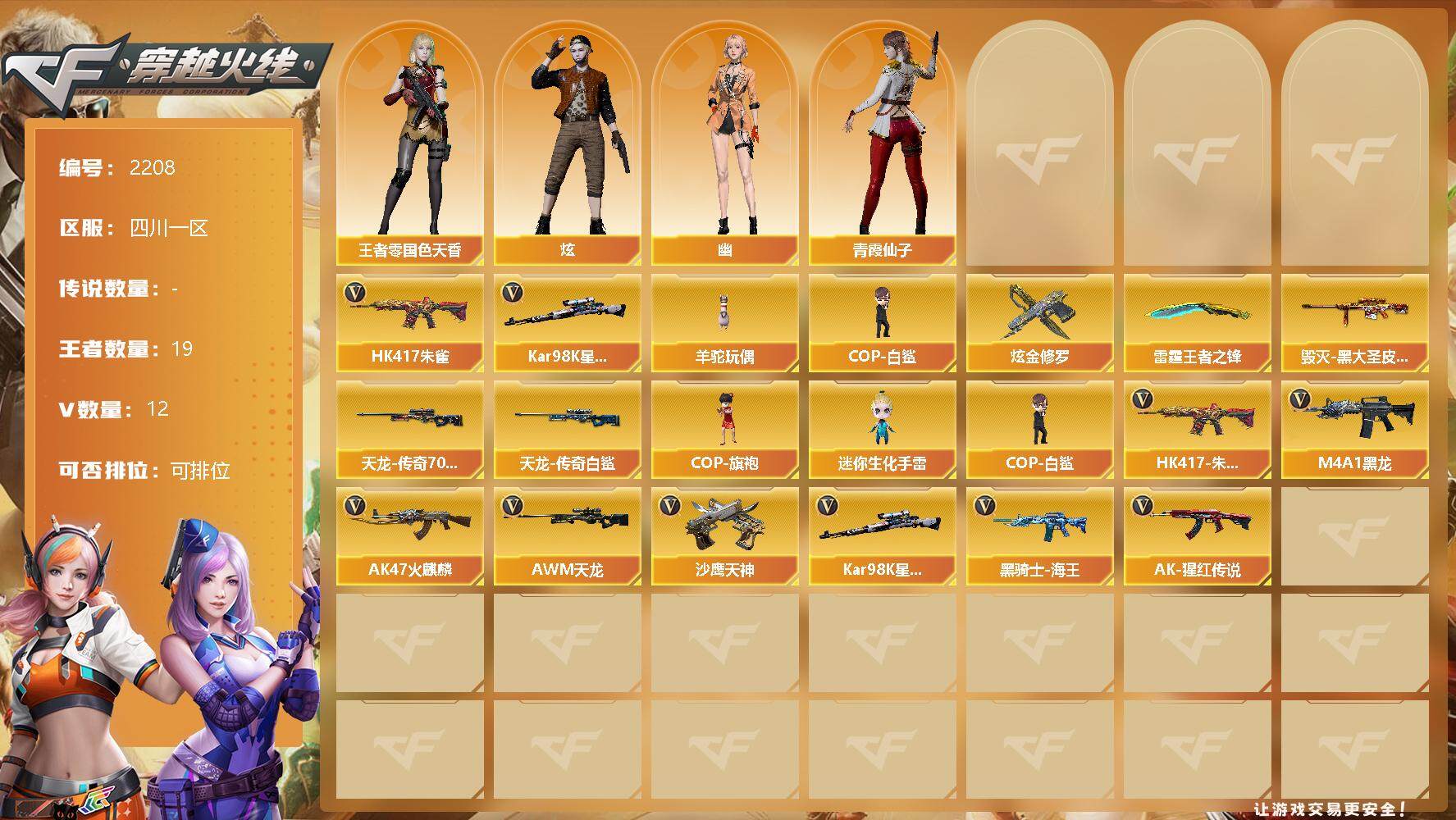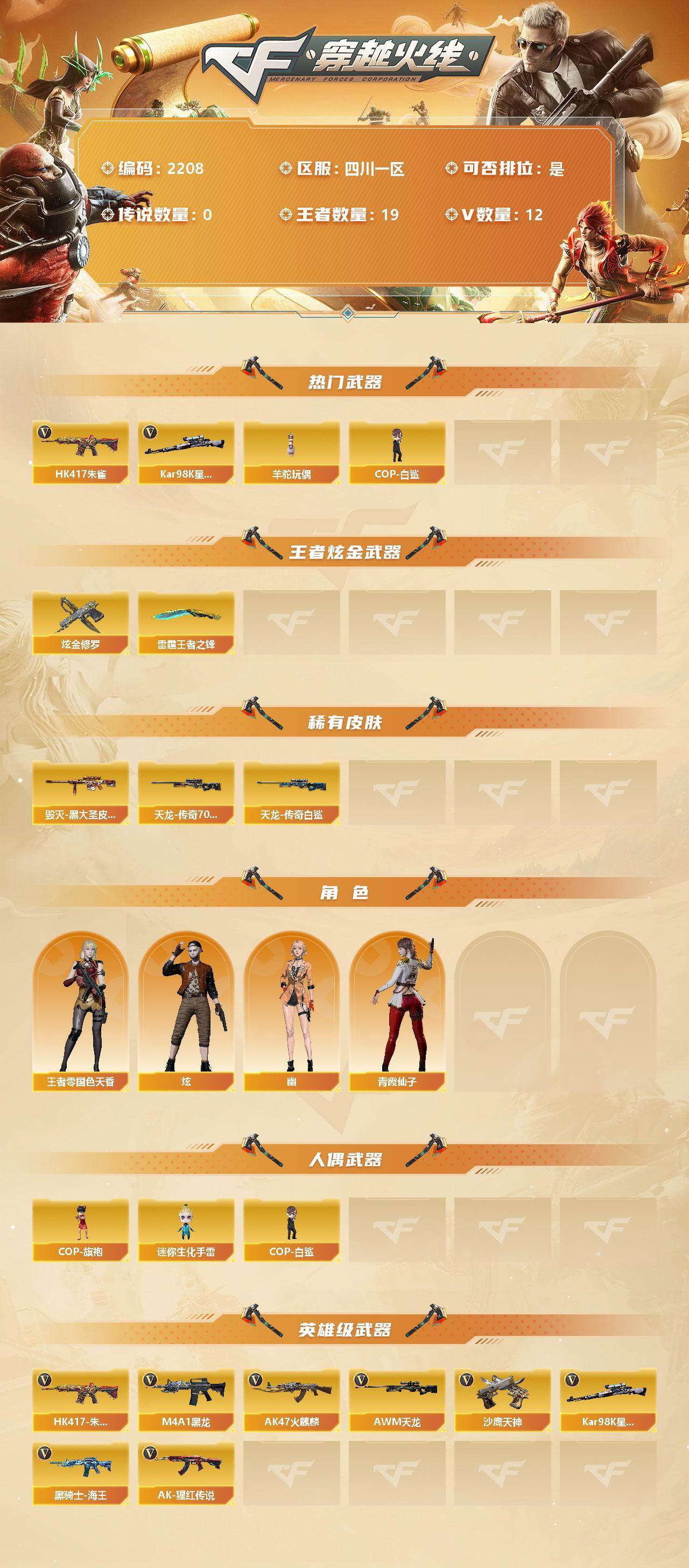 [13081121]四川一区-12V-19王者-1炫金 【热门武器】:HK417-朱雀,Kar98K-星神,羊驼玩偶,COP-白鲨 【王者炫金武器】:雷霆王者之锋,炫金修罗 【皮肤】:毁灭-黑大圣皮肤,AWM-天龙-传奇70KG,AWM-天龙-传奇白鲨 【角色】:炫,王者-零-国色天香,幽,青霞仙子 【人偶武器】:COP-白鲨,COP-旗袍,迷你生化手雷 【英雄级武器】:AK47-火麒麟,M4A1-黑龙,HK417-朱雀,AK-47-猩红传说,黑骑士-海王,M4A1-雷霆王者-觉醒版,AWM-天龙,Kar98K-星神,Barrett-雷霆王者-觉醒版,沙鹰-天神,COP 357-雷霆王者-觉醒版*2,王者之击-觉醒版,雷霆王者之锋-觉醒版,高爆手雷-雷霆王者*4 【特殊枪械】: