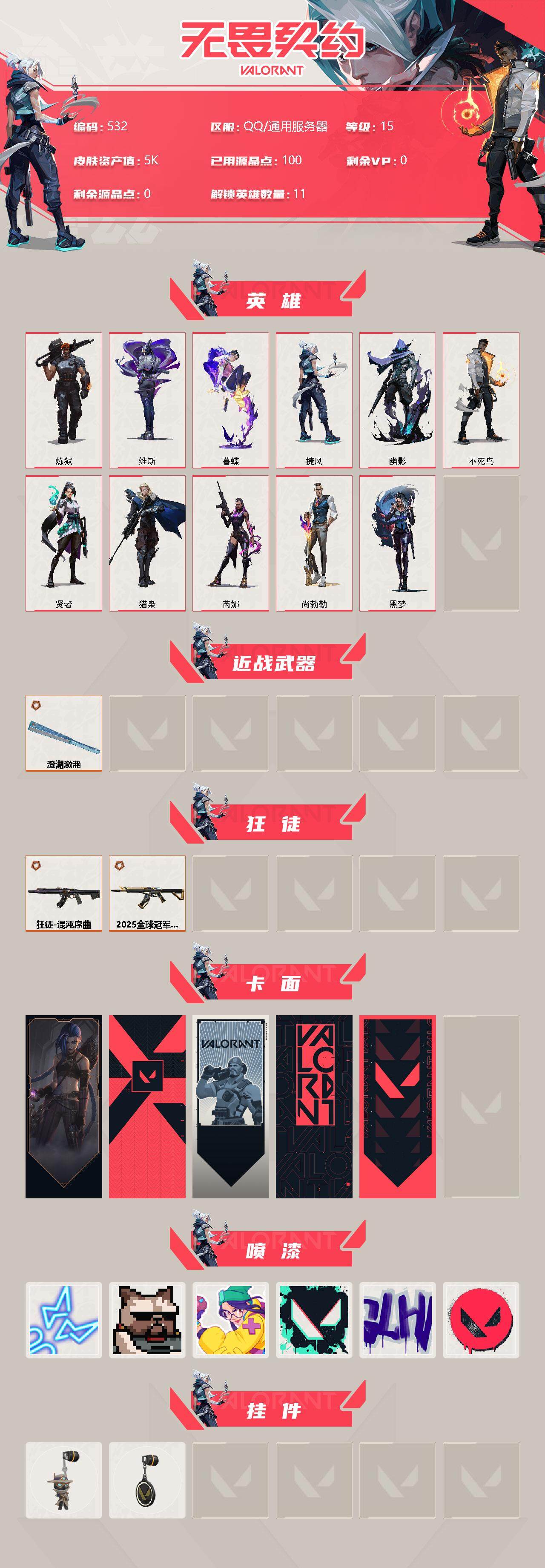 [13081059]【英雄】:炼狱,维斯,暮蝶,捷风,幽影,不死鸟,贤者,猎枭,芮娜,尚勃勒,黑梦 【近战 武器】:近战武器-澄湖潋滟 【狂徒】:狂徒-2025全球冠军赛,狂徒-混沌序曲 【卡面】:《双城之战》金克丝 卡面,代号红色 卡面,新兵报到 卡面,V契约 卡面,无畏契约 卡面 【喷漆】:霓光四射 喷漆,关门放狗 喷漆,无畏契约GO!第一卷:奇乐 喷漆,胜利属于无畏契约 喷漆,GLHF 喷漆,无畏契约 喷漆 【挂饰】:无畏契约GO!第一卷 零 挂饰,无畏契约 纪念币 挂饰