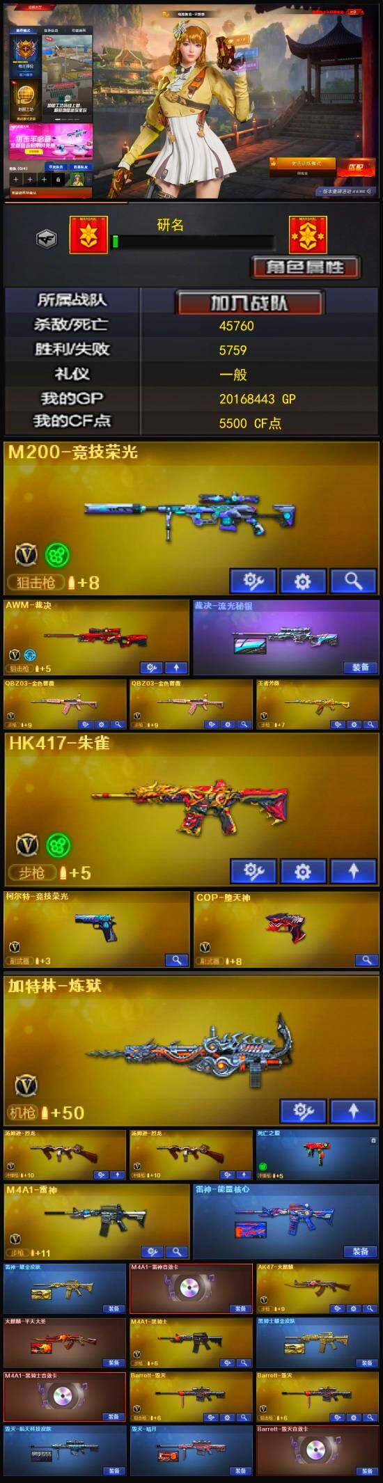 【热门武器】:QBZ03-金色蔷薇*2,HK417-朱雀,M200-竞技荣光,死亡之眼,M4A1-黑骑士,汤姆逊-烈龙*2,加特林-炼狱,羊驼玩偶,COP-堕天神,沙鹰-修罗*4,金刚伞