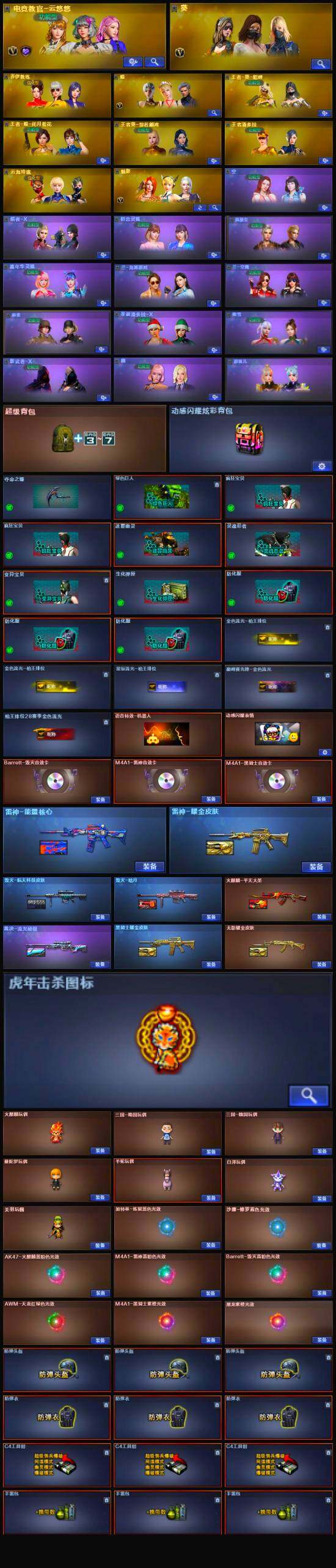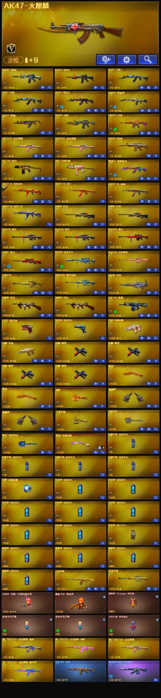 【英雄级武器】:AK47-火麒麟,M4A1-雷神,M4A1-黑骑士,AK47-无影*2,AK47-黑武士,AN94-超新星,AK47-黑鲨,M4A1-龙血,HK417-朱雀,黑武士-锦绣游龙,QBZ03-金色蔷薇*2,M4A1-猎神,烈火-动感闪耀,AK-47-猩红传说,AK47-B-战神,AK47-B-常胜将军,AWM-天龙*2,Barrett-毁灭*2,Barrett-极光,AWM-裁决,M200-竞技荣光,Barrett-金色蔷薇,王者之光-觉醒版,加特林-炼狱,汤姆逊-烈龙*2,AA-12-雷霆,沙鹰-修罗*4,沙鹰-天神,COP-堕天神,柯尔特-竞技荣光,天神-动感闪耀,屠龙*2,龙啸,麒麟刺*2,擎天-竞技荣光,屠龙-动感闪耀,王者之啸-觉醒版,王者之击-觉醒版,高爆手雷-竞技荣光*4,手雷-动感闪耀,闪光弹-竞技荣光*7,闪光弹-神工天巧,烟雾弹-竞技荣光*4,M4A1-赤狱骑士