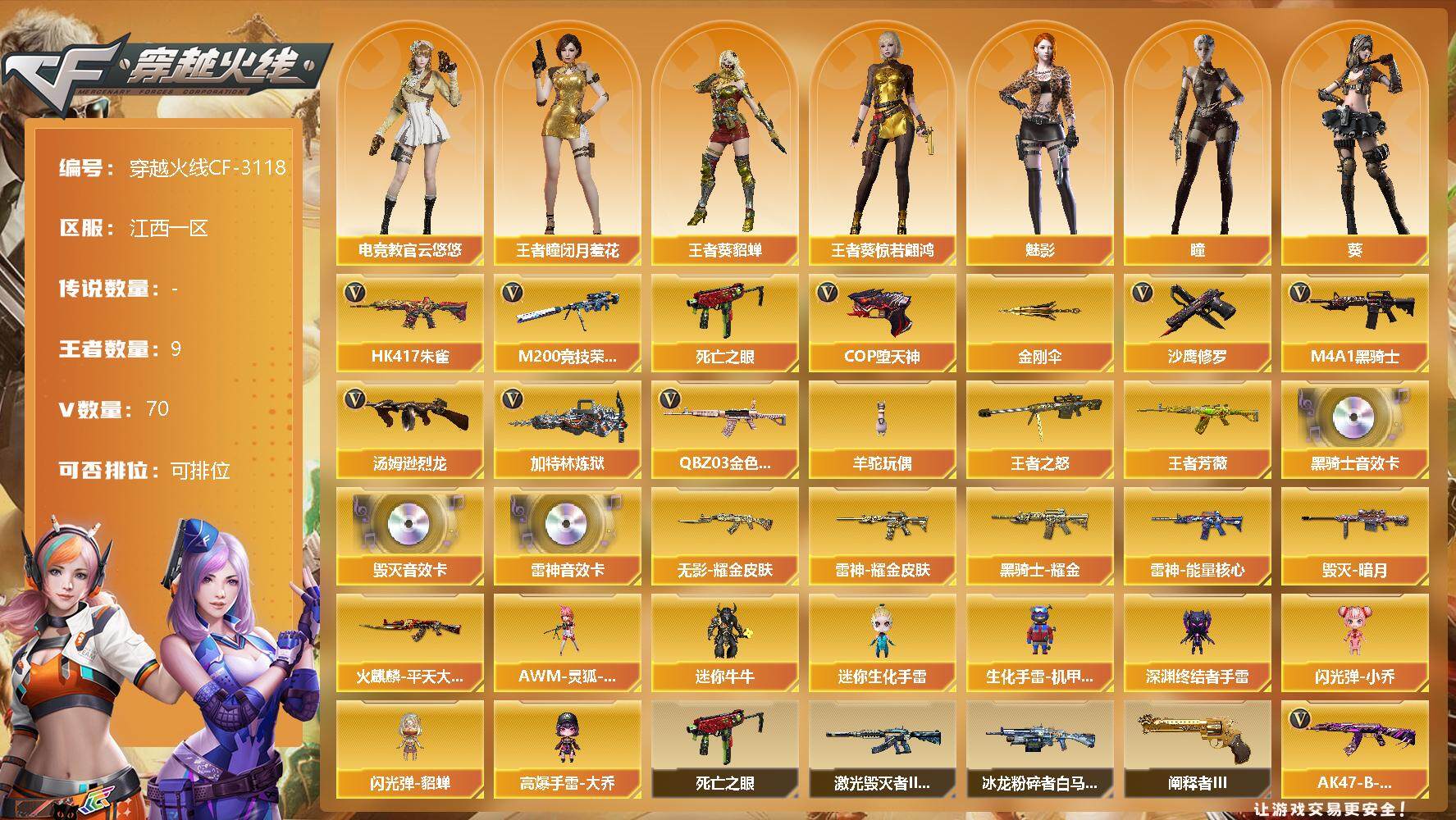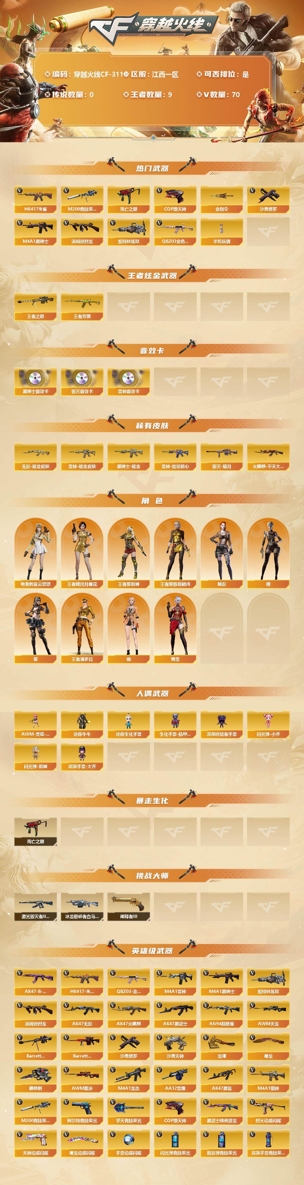[13081686]江西一区-70V-9王者-0炫金 【热门武器】:QBZ03-金色蔷薇*2,HK417-朱雀,M200-竞技荣光,死亡之眼,M4A1-黑骑士,汤姆逊-烈龙*2,加特林-炼狱,羊驼玩偶,COP-堕天神,沙鹰-修罗*4,金刚伞 【王者炫金武器】:王者芳薇,王者之怒 【音效卡】:M4A1-雷神音效卡,M4A1-黑骑士音效卡,Barrett-毁灭音效卡 【皮肤】:裁决-流光秘银,雷神-能量核心,雷神-耀金皮肤,火麒麟-平天大圣,毁灭-暗月,毁灭-航天科技皮肤,M4A1-千变-孔明皮肤,黑骑士耀金皮肤,无影耀金皮肤,战神-粉色甜心皮肤,战神-紫绶金章皮肤,战神-流金岁月皮肤,AK47-B-常胜将军-刘备*2,AK47-B-常胜将军-孙权 【角色】:葵,瞳,魅影,电竞教官-云悠悠,乔伊教练,云海玲珑,王者-瞳-闭月羞花,王者-葵-貂蝉,王者葵-惊若翩鸿,王者潘多拉,幽,蜀雪 【人偶武器】:AWM-灵狐-15周年嘉年华,迷你牛牛,迷你生化手雷*2,生化手雷-机甲核心,深渊终结者手雷,闪光弹-小乔,闪光弹-貂蝉,高爆手雷-大乔 【暴走生化】:死亡之眼 【挑战大师】:冰龙粉碎者-白马银枪,激光毁灭者III-白马银枪,阐释者III 【英雄级武器】:AK47-火麒麟,M4A1-雷神,M4A1-黑骑士,AK47-无影*2,AK47-黑武士,AN94-超新星,AK47-黑鲨,M4A1-龙血,HK417-朱雀,黑武士-锦绣游龙,QBZ03-金色蔷薇*2,M4A1-猎神,烈火-动感闪耀,AK-47-猩红传说,AK47-B-战神,AK47-B-常胜将军,AWM-天龙*2,Barrett-毁灭*2,Barrett-极光,AWM-裁决,M200-竞技荣光,Barrett-金色蔷薇,王者之光-觉醒版,加特林-炼狱,汤姆逊-烈龙*2,AA-12-雷霆,沙鹰-修罗*4,沙鹰-天神,COP-堕天神,柯尔特-竞技荣光,天神-动感闪耀,屠龙*2,龙啸,麒麟刺*2,擎天-竞技荣光,屠龙-动感闪耀,王者之啸-觉醒版,王者之击-觉醒版,高爆手雷-竞技荣光*4,手雷-动感闪耀,闪光弹-竞技荣光*7,闪光弹-神工天巧,烟雾弹-竞技荣光*4,M4A1-赤狱骑士 【特殊枪械】:1黑骑士,2烈龙,1炼狱