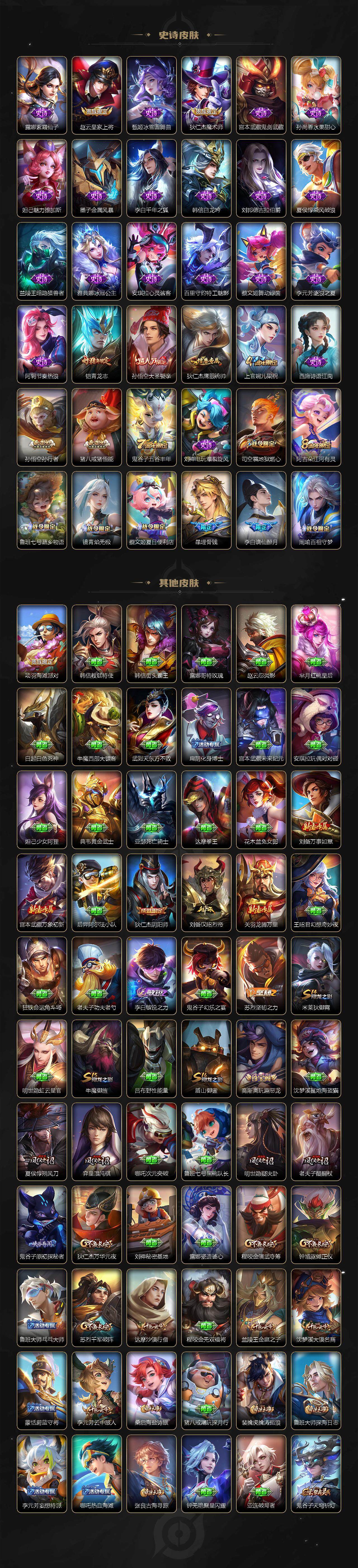 【史诗皮肤】:露娜紫霞仙子,赵云皇家上将,甄姬冰雪圆舞曲,狄仁杰魔术师,宫本武藏鬼剑武藏,孙尚香水果甜心,妲己魅力维加斯,墨子金属风暴,李白千年之狐,韩信白龙吟,刘邦德古拉伯爵,夏侯惇乘风破浪,兰陵王暗隐猎兽者,雅典娜冰冠公主,安琪拉心灵骇客,百里守约特工魅影,蔡文姬舞动绿茵,李元芳逐浪之夏,阿轲节奏热浪,铠青龙志,孙悟空大圣娶亲,狄仁杰鹰眼统帅,上官婉儿梁祝,西施诗语江南,孙悟空孙行者,猪八戒猪悟能,鬼谷子五谷丰年,刘禅电玩爆裂旋风,司空震地狱燃心,阿古朵江河有灵,鲁班七号蔬乡物语,镜青焰无极,蔡文姬夏日便利店,暃埋骨钱,李白谪仙醉月,周瑜百相守梦