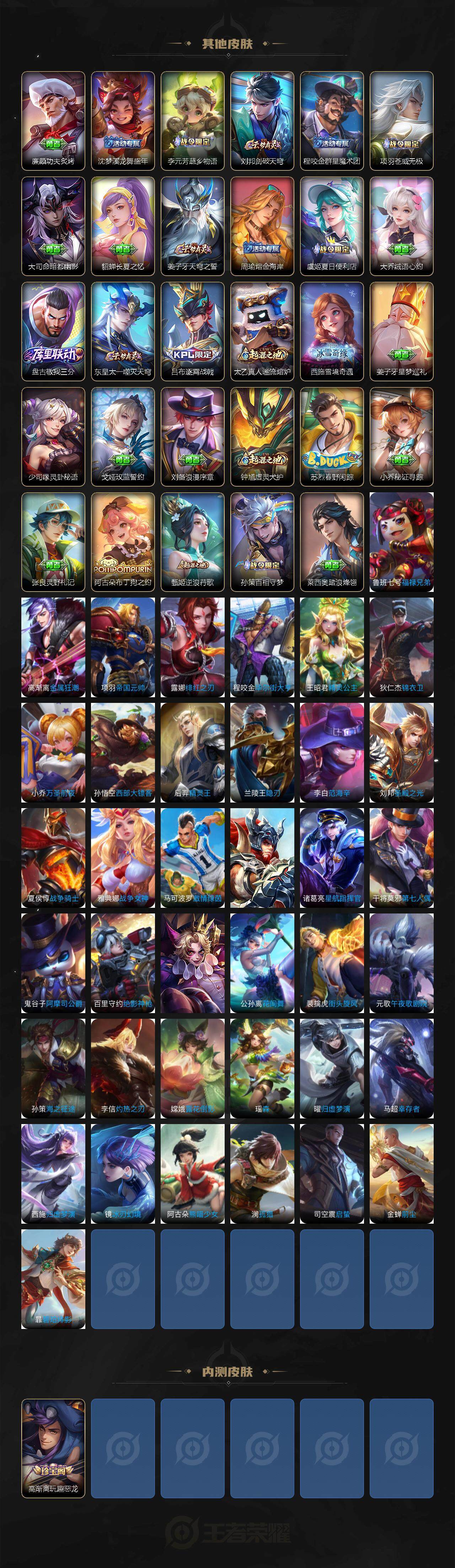 【限定皮肤】:暃埋骨钱,蔡文姬夏日便利店,大乔绒语心约,虞姬夏日便利店,姜子牙天穹之誓,李白谪仙醉月,狄仁杰阴阳师,赵云皇家上将,高渐离玩趣恶龙,夏侯惇朔风刀,狄仁杰魔术师,狄仁杰万华元夜,达摩沙漠行僧,项羽海滩派对,老夫子醍醐杖,程咬金演武夺筹,兰陵王金庭之子,孙悟空大圣娶亲,孙悟空孙行者,牛魔御旌,李元芳云中旅人,钟馗驱傩正仪,鬼谷子原初探秘者,鬼谷子五谷丰年,铠青龙志,苏烈千军破阵,弈星混沌棋,沈梦溪大漠名商,明世隐疑决卦,裴擒虎擒涛扼浪,米莱狄御霄,盾山御銮,猪八戒猪悟能,上官婉儿梁祝,鲁班大师探海日志,桑启海盐诗旅,司空震地狱燃心,阿古朵江河有灵,张良古海寻踪,鬼谷子天穹祈灯,沈梦溪龙舞盛年,鲁班七号蔬乡物语,李元芳蔬乡物语,刘邦剑破天穹,程咬金群星魔术团,镜青焰无极,项羽苍威无极,周瑜熔金海岸